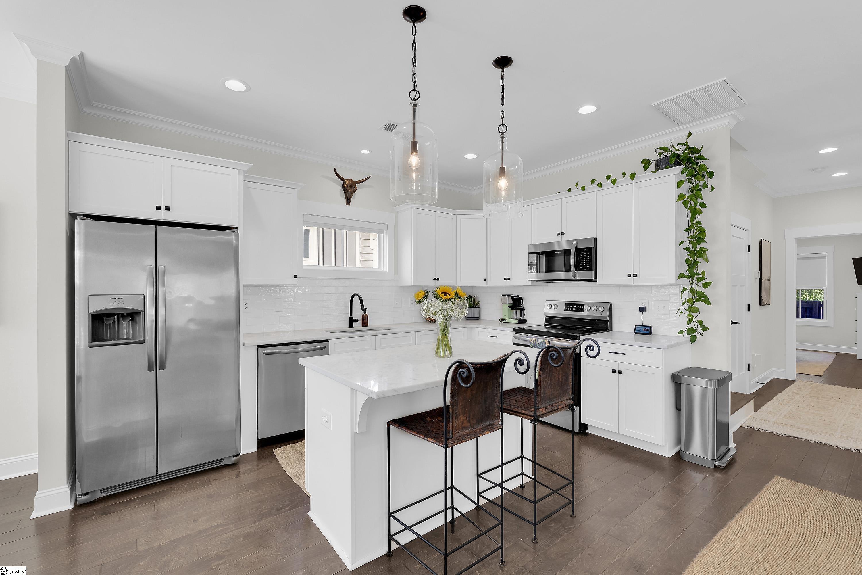 Welcome to Ridgeway Cottages! This stunning Charleston-style home is just five years young and has been meticulously maintained. From the moment you step onto the welcoming front porch, you'll feel the charm and serenity this home offers. Inside, enjoy an open floor plan filled with natural light, gleaming hardwood floors, and elegant moldings. The chef’s kitchen features abundant cabinetry, a spacious walk-in pantry, and plenty of room for entertaining. The main-level primary suite includes a large walk-in closet and a spa-like bathroom with dual vanities and a beautifully tiled walk-in shower. Upstairs, you'll find two oversized guest bedrooms, a cozy den, and a full bathroom—perfect for guests or a home office setup. Step outside to a fenced-in backyard with a patio, ideal for cookouts or relaxing evenings. Located in Midtown Greenville, this home is just 5 minutes from downtown, 3 minutes to the Swamp Rabbit Trail, and within walking distance to Kitchen Sync, White Duck Taco, and other popular eateries and breweries. Homes in Ridgeway Cottages are rarely available—don’t miss your opportunity to own this gem!