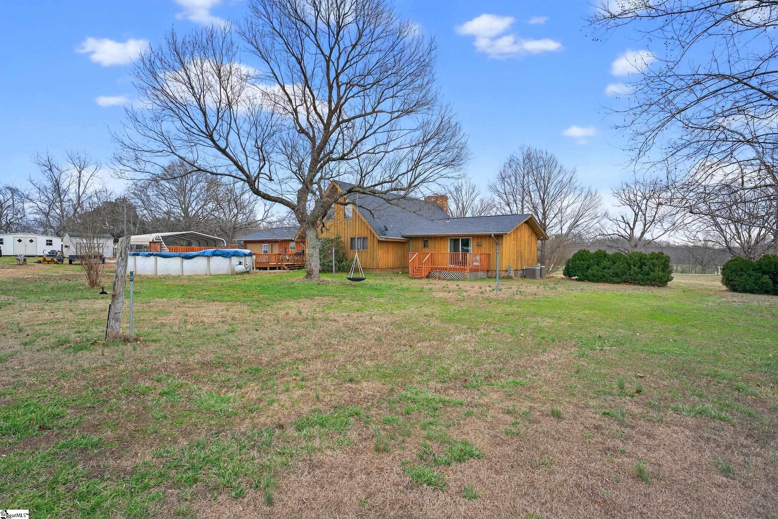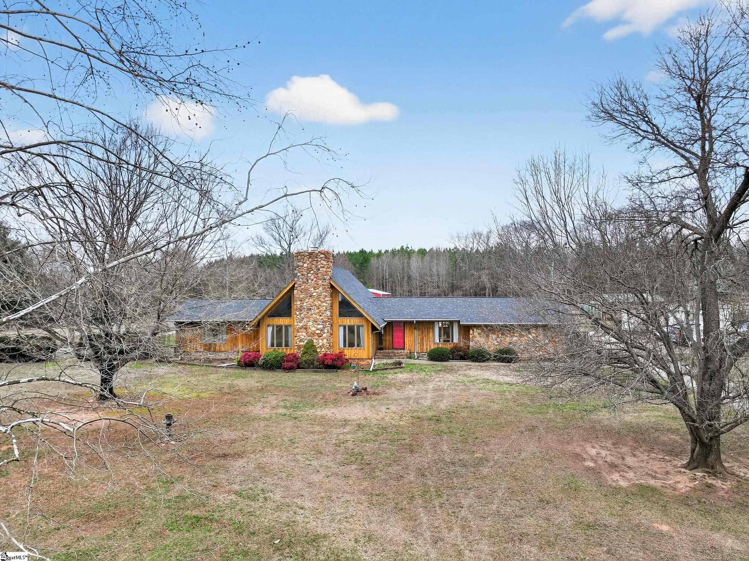 NO HOA!! USDA eligible! Peaceful rural living with quick access to the Upstate’s top cities, shopping, and recreation! Set on 3 ACRES in an award-winning school district, this one-of-a-kind property delivers peaceful country living without sacrificing convenience. The home is also within walking distance of the Stoneybrook Neighborhood Fishing Lake and is surrounded by large lots while backing up to a tree line for privacy, beautiful views of farmland in front, and a true sense of retreat. Inside, the home features stunning REAL WOOD beams on vaulted ceilings, solid wood doors, and a dramatic 8-foot-wide TOWERING STONE FIREPLACE with a nostalgic cooking grate, matched by a stone wall in the foyer. The sunken living room, oversized loft, country-style eat-in kitchen, and formal dining room just off the kitchen create a layout that is both inviting and functional, all filled with natural light. The kitchen boasts real GRANITE countertops, not cultured granite, along with a new refrigerator and dishwasher, as well as an Insta-Hot water heater for endless hot water. ALL APPLIANCES INCLUDED! The home includes dual primary bathrooms, one with a vintage sunken tub and the other full baths featuring tiled walk-in showers, plus a large laundry room with a mud sink. Two new ceiling fans were added in the loft, the attic has newly added 8” of blown insulation and is mostly floored for storage. The converted garage adds 400 square feet of heated and cooled living space. Outdoor living is equally impressive, with a deck off the massive primary bedroom and a large custom deck off the dining room that wraps around the 15x24 SALTWATER POOL. The courtyard features a beautiful stone wall, while flowering bushes, mature trees, and landscaped flowerbeds line the driveways and grounds and return in full bloom each spring. Multiple fruit trees including apple, cherry, and peach are already planted. The property has two driveways, one leading to the courtyard and the other providing direct access to the large outbuilding at the back of the acreage. There is a BARN and TWO FENCED PASTURES for livestock, chicken coop and rabbit cages, a WORKSHOP with electricity and work benches, and a separate storage shed that is wired for electricity. Major updates include a NEW ROOF, a fully encapsulated crawlspace vapor barrier and all-new ductwork throughout the home, a new HVAC unit, four water spigots added for a total of six, septic tank recently pumped, and cedar siding and both decks are freshly stained. Completing this exceptional property is a 2023-built, fully permitted 30x50x14 OUTBUILDING on a concrete slab with insulation (1,500 sf), two 6-ton energy-efficient heat/air units, a bathroom, kitchenette, two main doors, a 10x12 roll-up door, its own septic system, its own 200-amp electrical meter, and its own water shutoff— perfect for a workshop or business. Could also easily be converted into MOTHER-IN-LAW/GUEST SUITE. In addition, this PRIME LOCATION is just minutes from Greenville, Anderson, Easley, Clemson, lake Hartwell, and premier shopping and dining, only 6 miles from a welcoming community with coffee shops, restaurants, and a well-equipped park, just 5 minutes to I-85, with Palmetto High School a 5-minute drive and Palmetto Middle School only 8 minutes away.