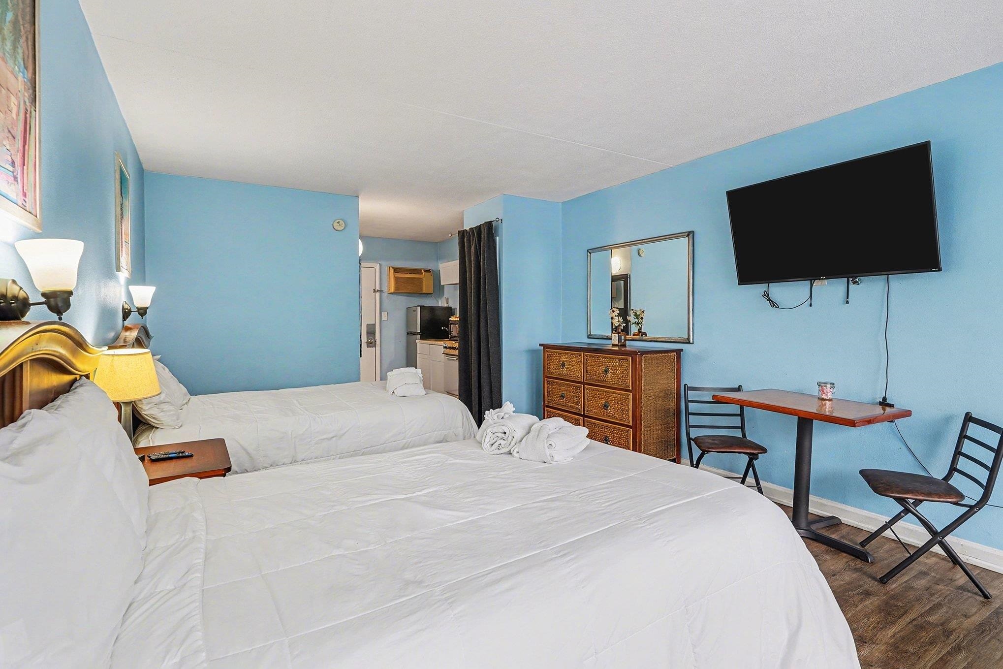 Welcome to your perfect beach getaway! This charming efficiency unit at the Wave Rider Resort is ideally located just one row back from the beautiful shoreline, making it an excellent choice for relaxation and adventure alike. Inside, you'll find a fully equipped kitchen featuring a stove, oven, microwave, and a full-sized refrigerator, perfect for preparing meals during your vacation. The spacious living and dining area creates an inviting atmosphere with two comfortable queen-sized beds, a dresser, TV, and a dining room table. Upgraded LVP flooring enhances the aesthetic of the space, while the bathroom and kitchen boast attractive tile finishes. The bathroom features a convenient shower-tub combo, offering the best of both worlds. Step outside onto your private balcony and take in the views of the resort pool, an ideal spot to unwind after a day in the sun. Wave Rider Resort provides a wealth of amenities to keep you entertained, including outdoor pools, shuffleboard, and onsite laundry facilities. Conveniently located near some of Myrtle Beach's finest dining, shopping, golf, and entertainment options, this unit is the perfect vacation spot or investment property. Don't miss out, schedule your showing today and start enjoying the Myrtle Beach lifestyle!