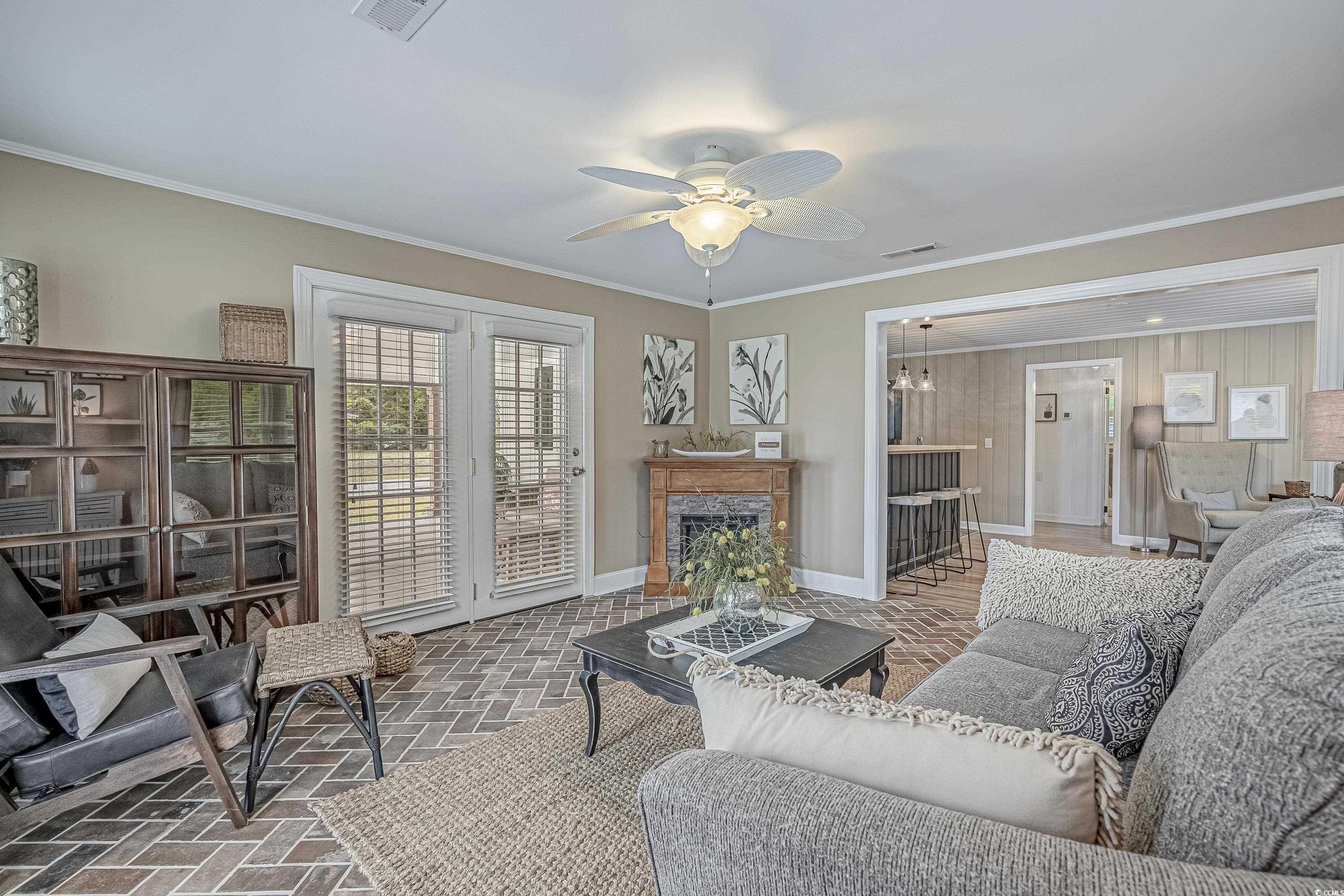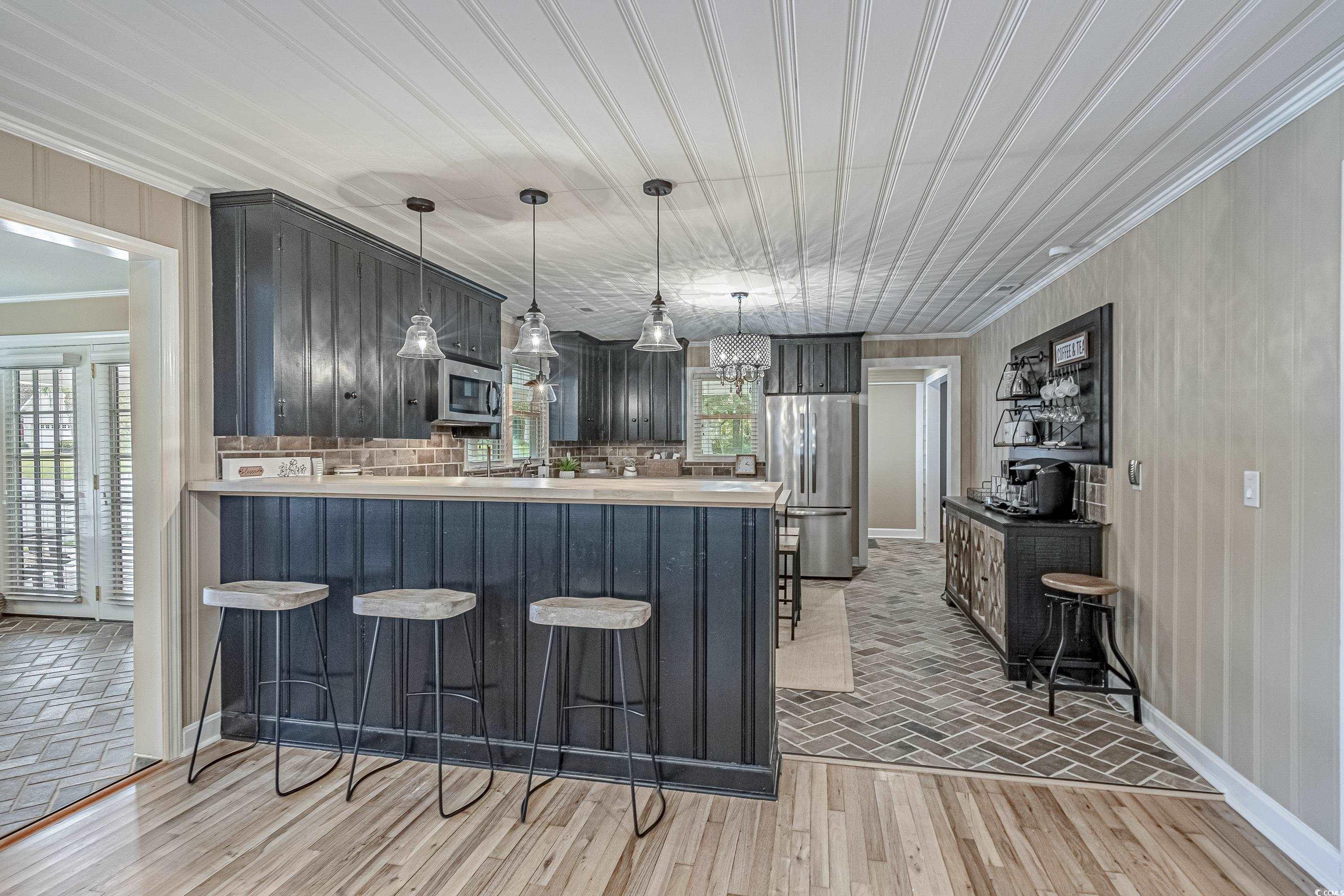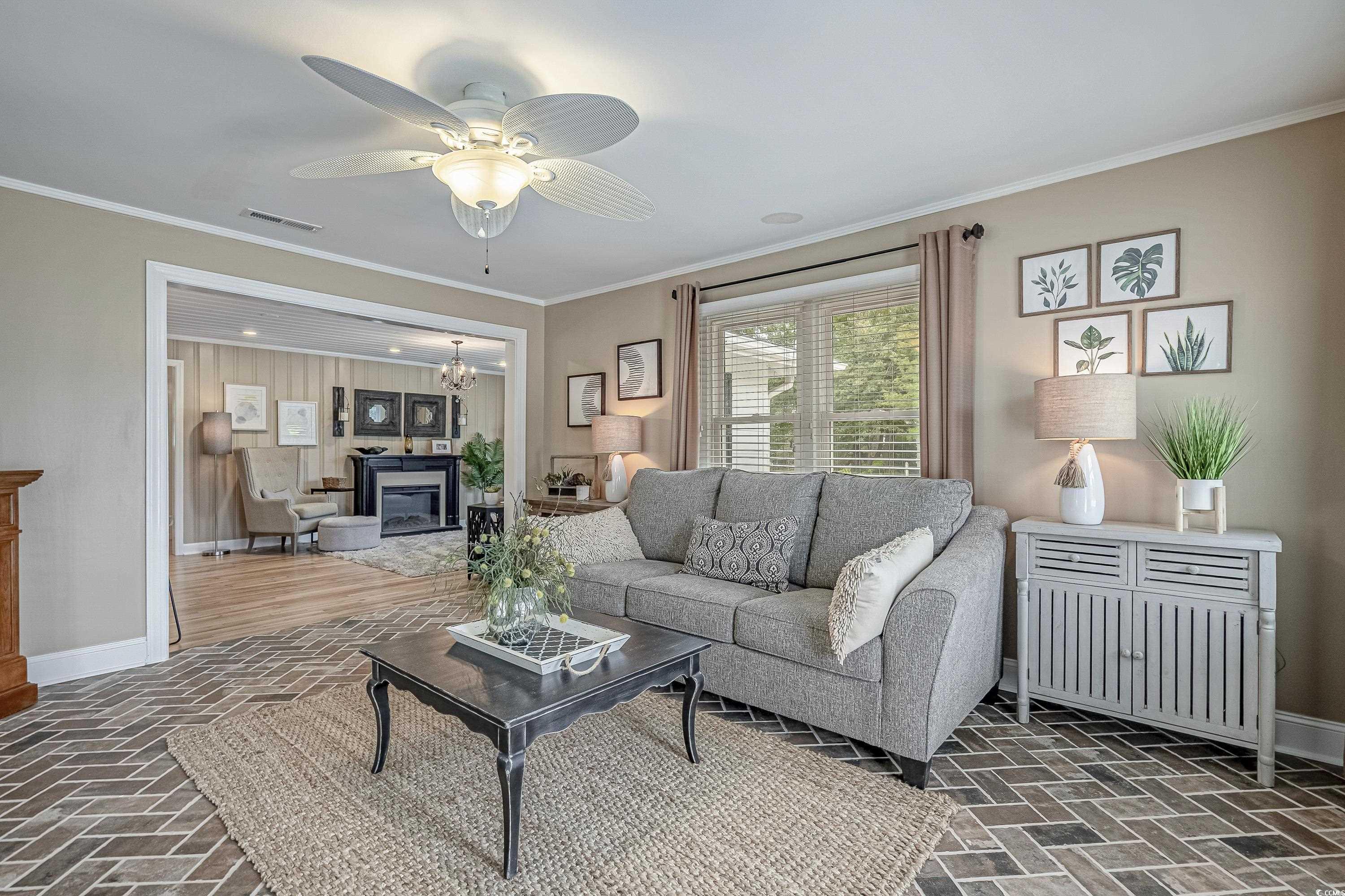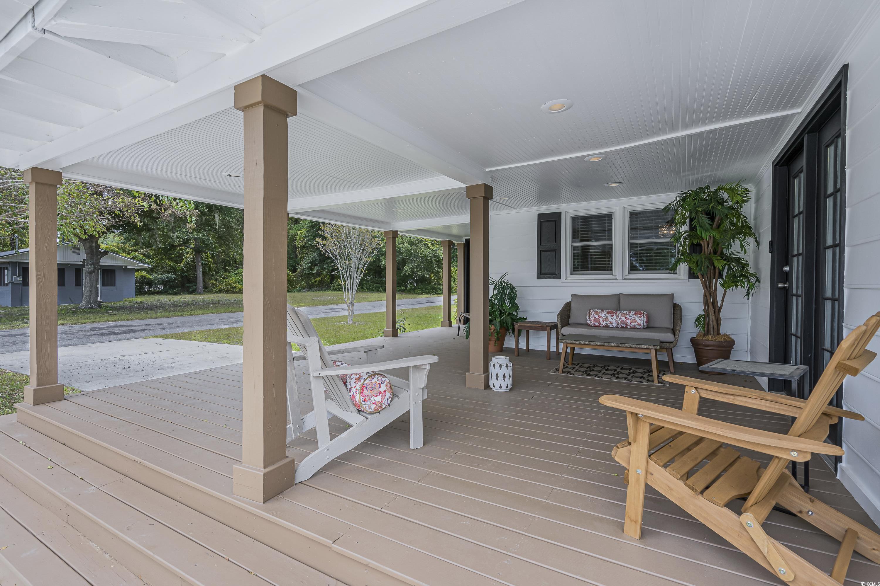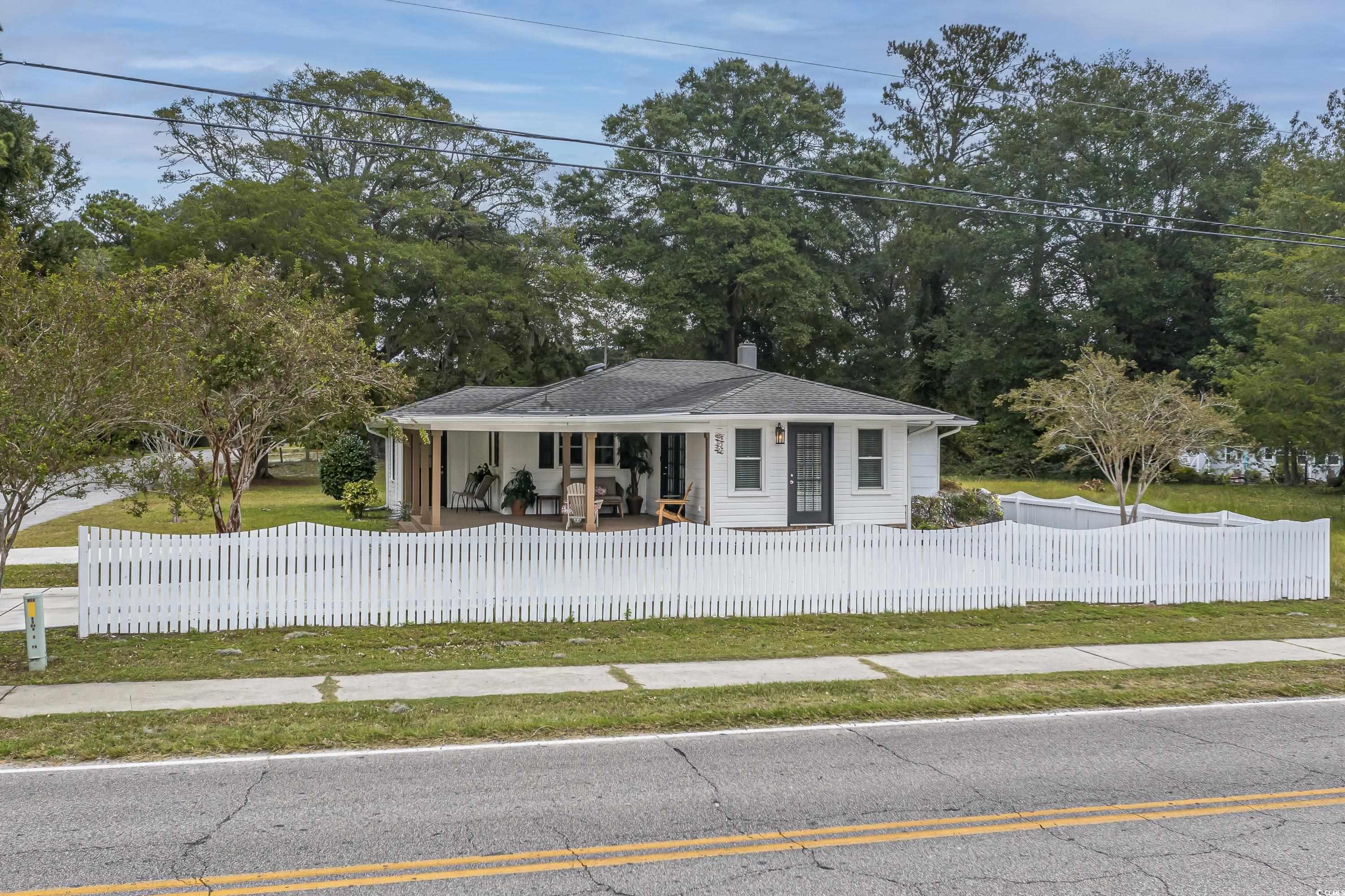 Like something straight off HGTV—only better in person! This impeccably styled farmhouse-meets-modern-luxury home sits on a spacious corner lot just steps from the Little River waterfront. Since photos were taken, a new black metal roof has been added (visible in the listing video), elevating the home’s already standout curb appeal. Though originally built in 1960, nearly everything has been updated—electrical, plumbing, HVAC, windows, doors, flooring, decking, paint, fencing, driveway, and more—making this a truly turnkey coastal retreat with no HOA dues and use flexibility (including short-term rentals). The wraparound deck sets the tone with Southern charm, leading into a newly created laundry drop zone. The kitchen steals the show with butcher-block countertops, dark cabinetry, stainless steel appliances, custom lighting, and herringbone brick flooring. A coffee bar and breakfast bar overlook the open living room, which highlights the home’s character with original hardwood floors and wood-paneled walls. The guest bedroom and beautifully finished marble-accented guest bath sit opposite the master suite, where brand-new French doors open to a freshly poured patio and expansive yard—offering plenty of space for a pool, garage, or outdoor oasis. The updated ensuite features a walk-in tiled shower and plantation shutters. Need more space? The Carolina room can easily become a third bedroom, office, or flex area. To top it off, the home is offered fully furnished—perfectly curated and move-in ready. Style, location, space, and flexibility… this one truly has it all.