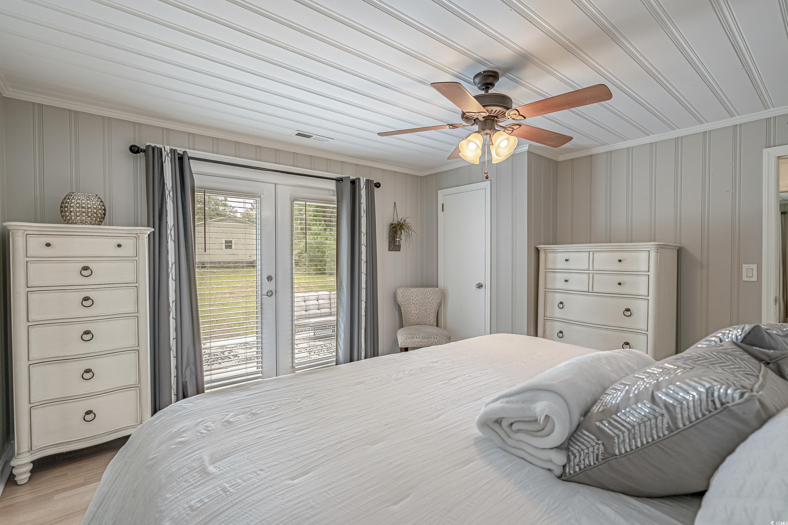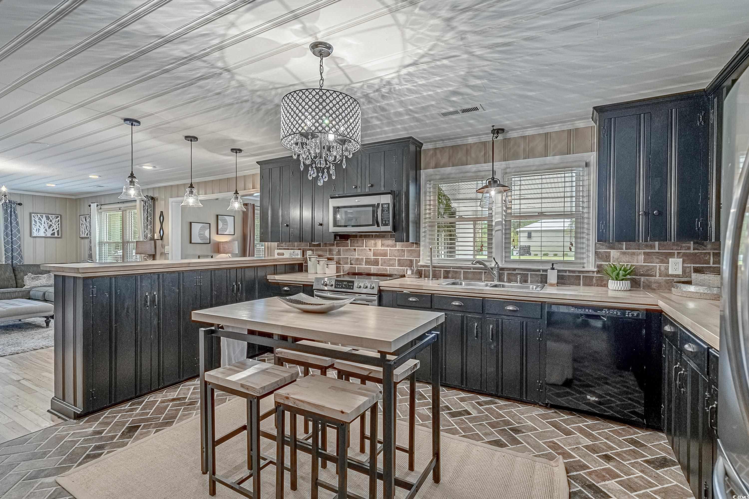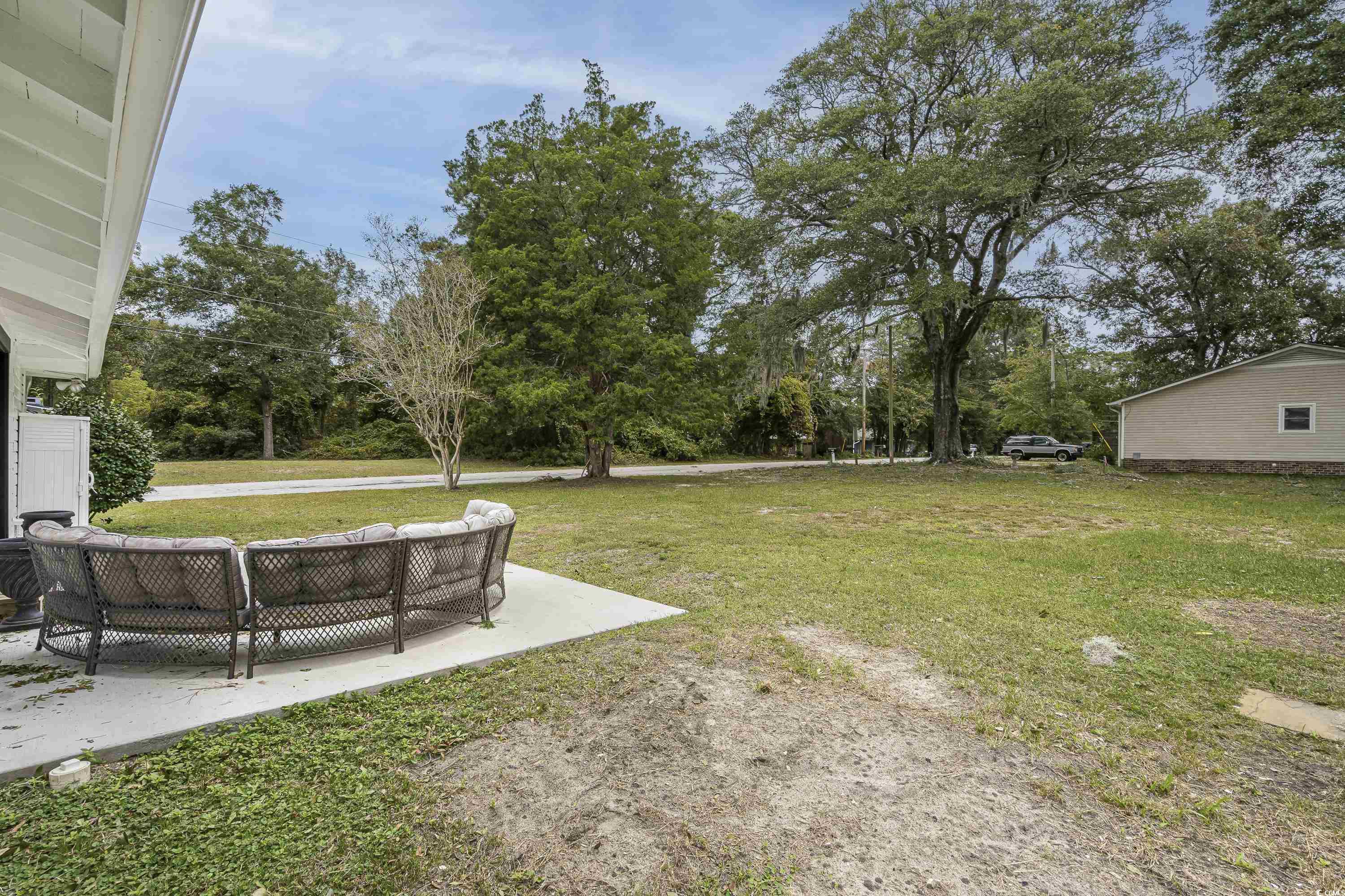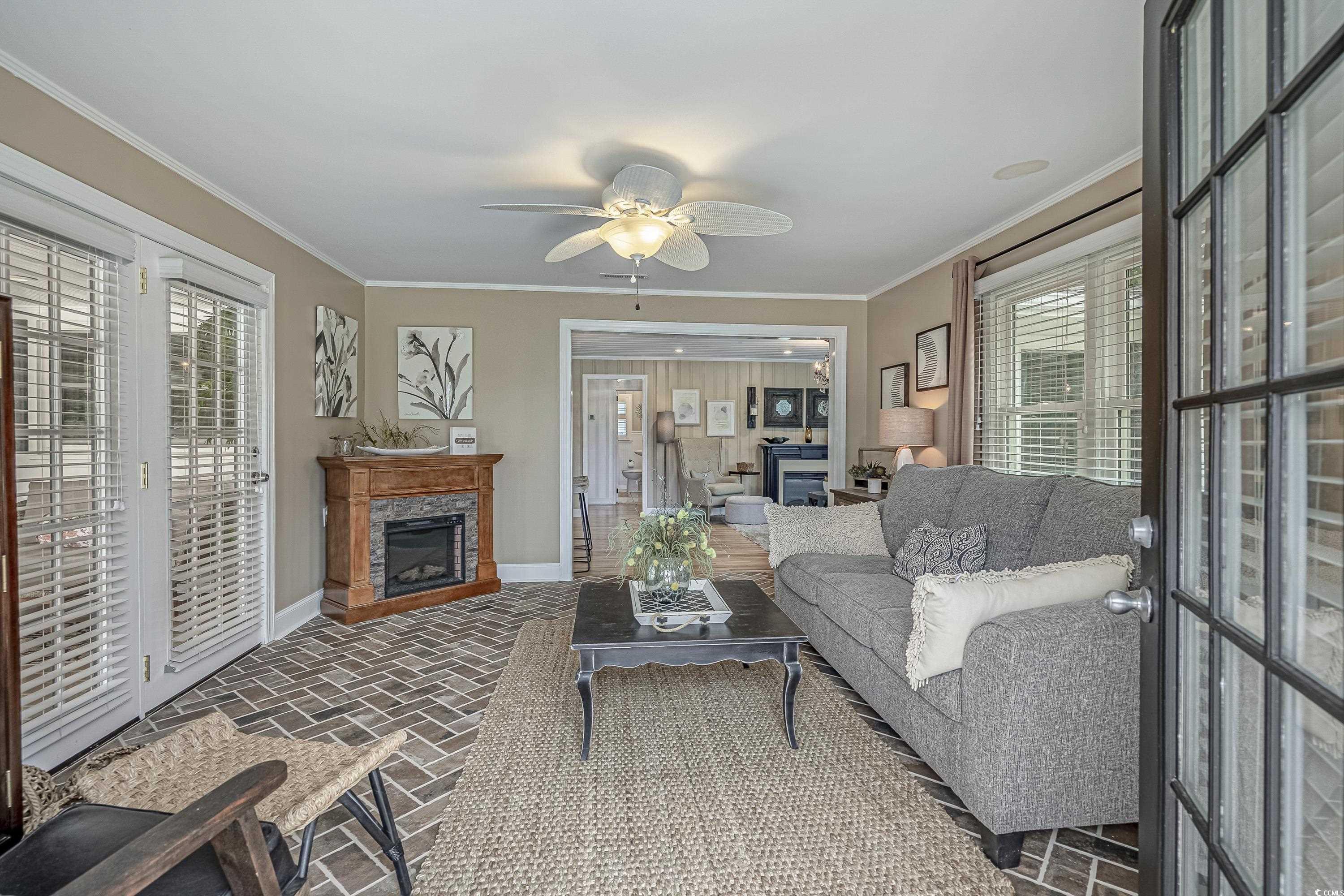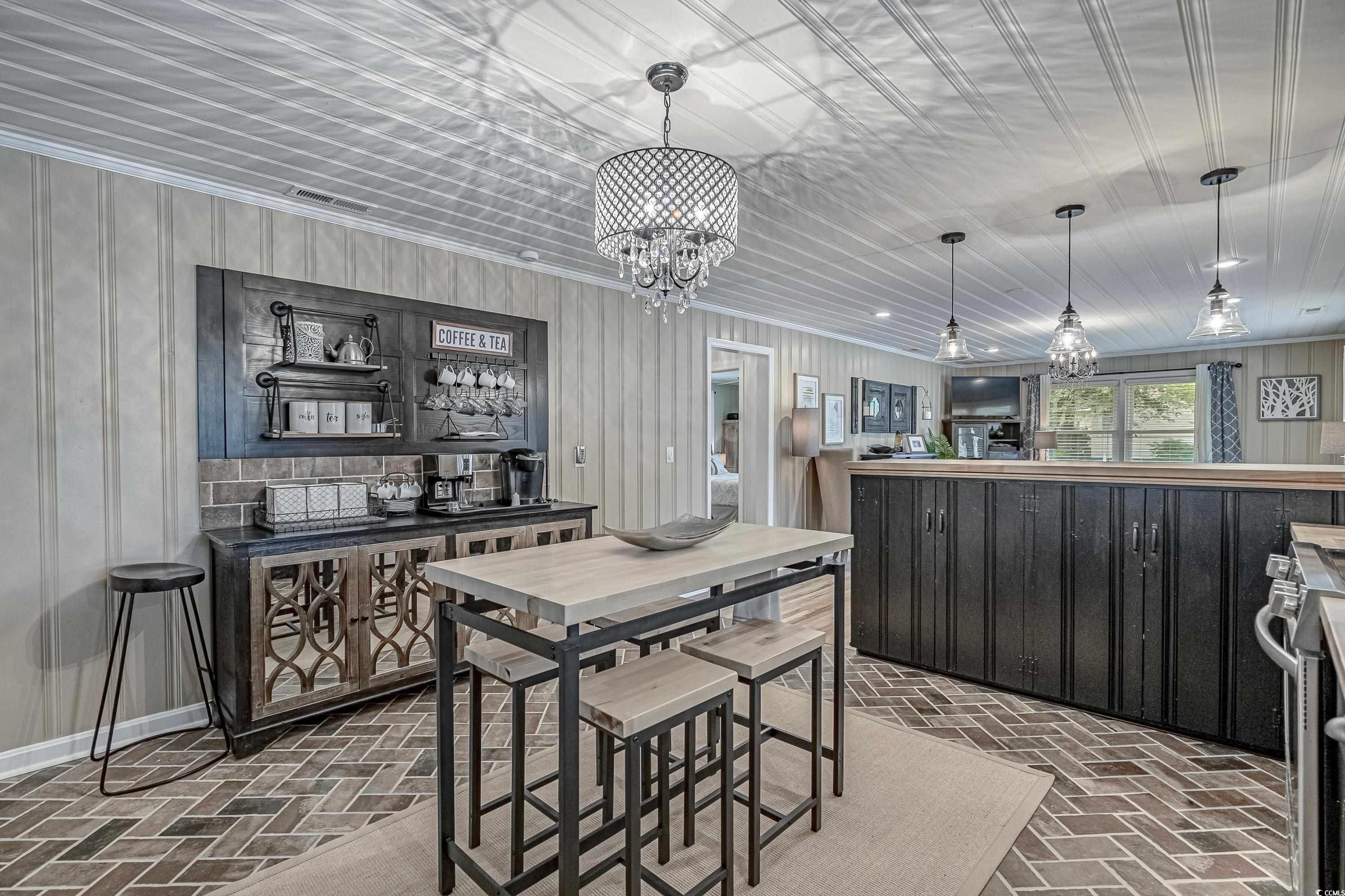 Like something straight off HGTV—only better in person! This impeccably styled farmhouse-meets-modern-luxury home sits on a spacious corner lot just steps from the Little River waterfront. Since photos were taken, a new black metal roof has been added (visible in the listing video), elevating the home’s already standout curb appeal. Though originally built in 1960, nearly everything has been updated—electrical, plumbing, HVAC, windows, doors, flooring, decking, paint, fencing, driveway, and more—making this a truly turnkey coastal retreat with no HOA dues and use flexibility (including short-term rentals). The wraparound deck sets the tone with Southern charm, leading into a newly created laundry drop zone. The kitchen steals the show with butcher-block countertops, dark cabinetry, stainless steel appliances, custom lighting, and herringbone brick flooring. A coffee bar and breakfast bar overlook the open living room, which highlights the home’s character with original hardwood floors and wood-paneled walls. The guest bedroom and beautifully finished marble-accented guest bath sit opposite the master suite, where brand-new French doors open to a freshly poured patio and expansive yard—offering plenty of space for a pool, garage, or outdoor oasis. The updated ensuite features a walk-in tiled shower and plantation shutters. Need more space? The Carolina room can easily become a third bedroom, office, or flex area. To top it off, the home is offered fully furnished—perfectly curated and move-in ready. Style, location, space, and flexibility… this one truly has it all.