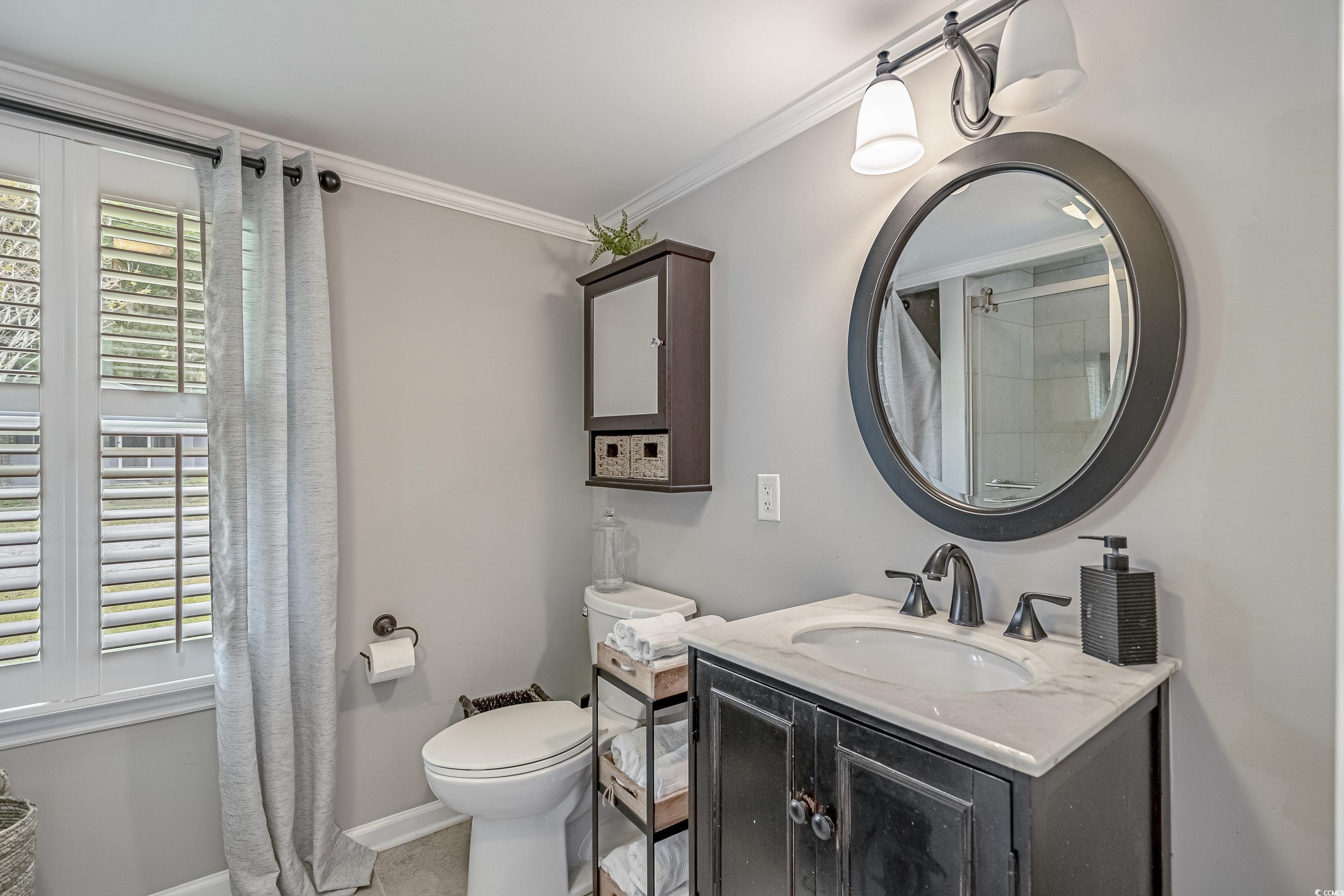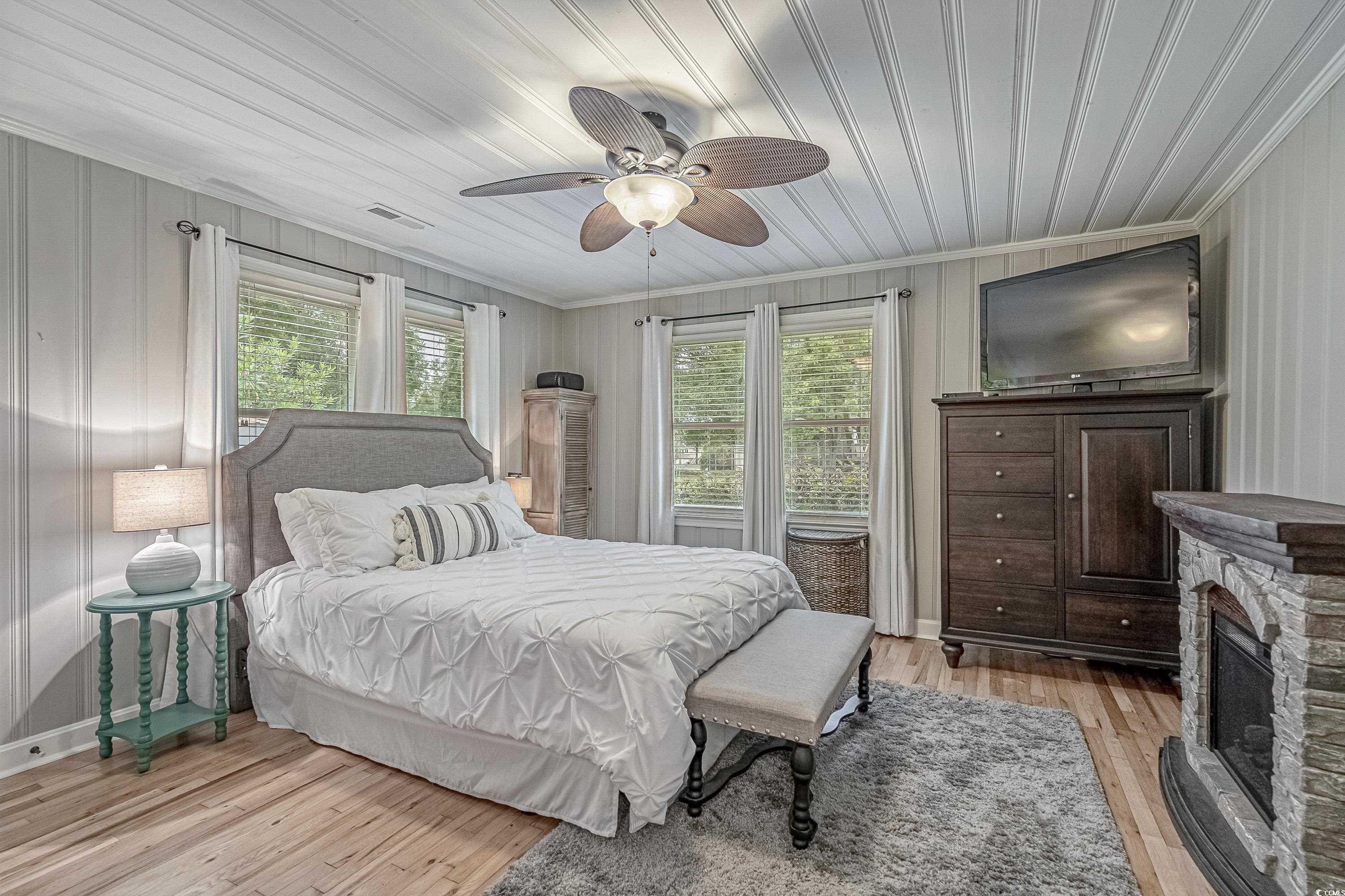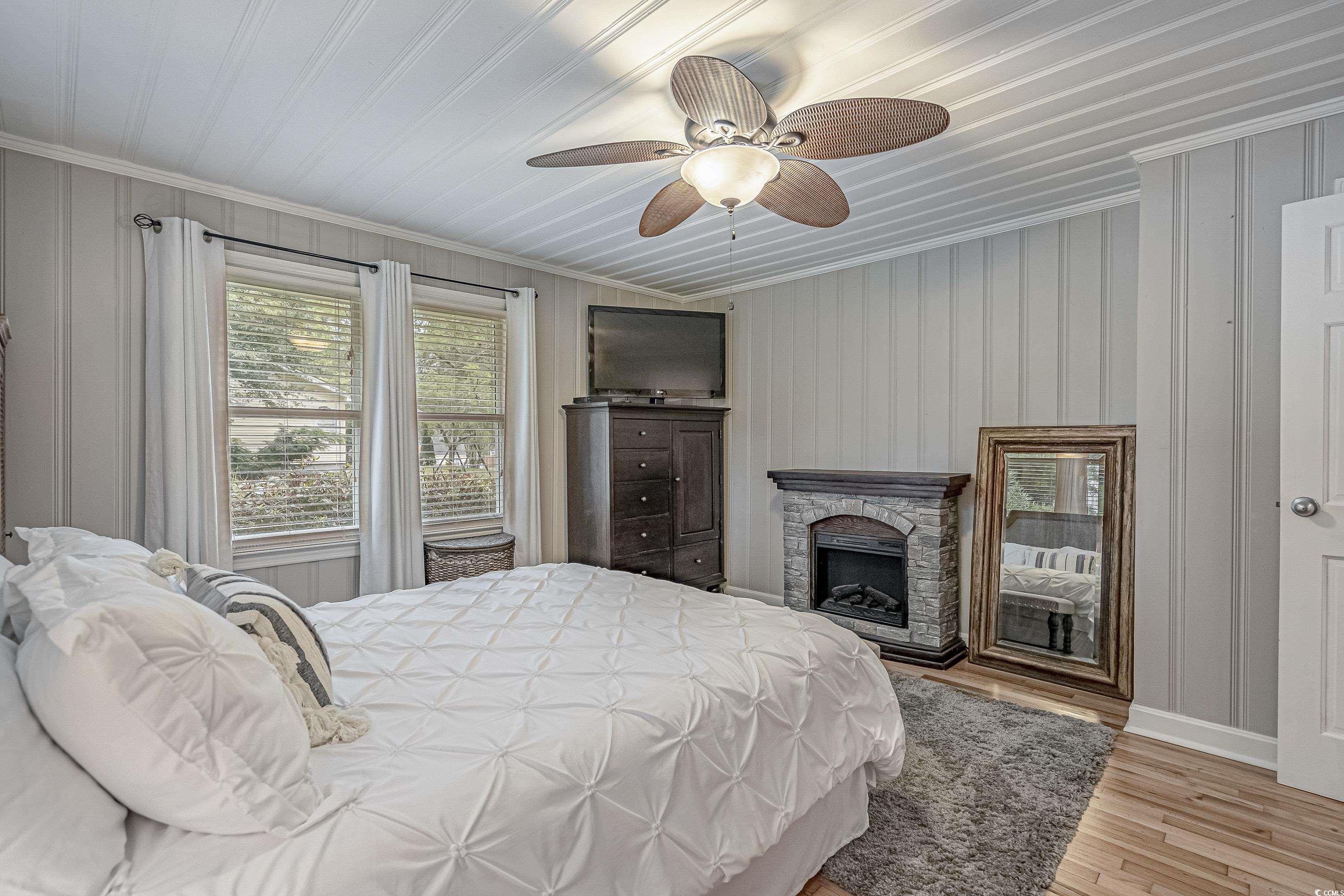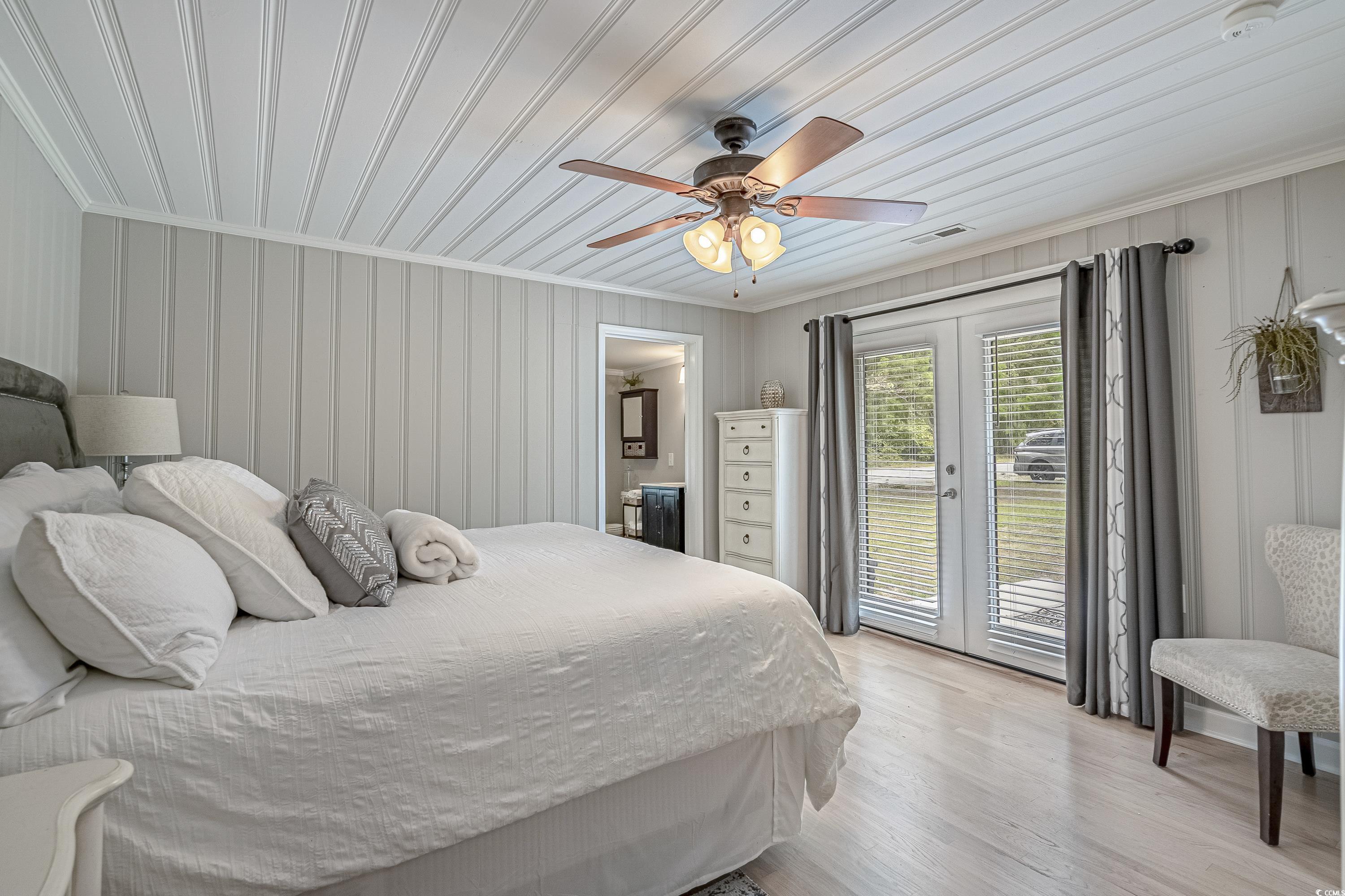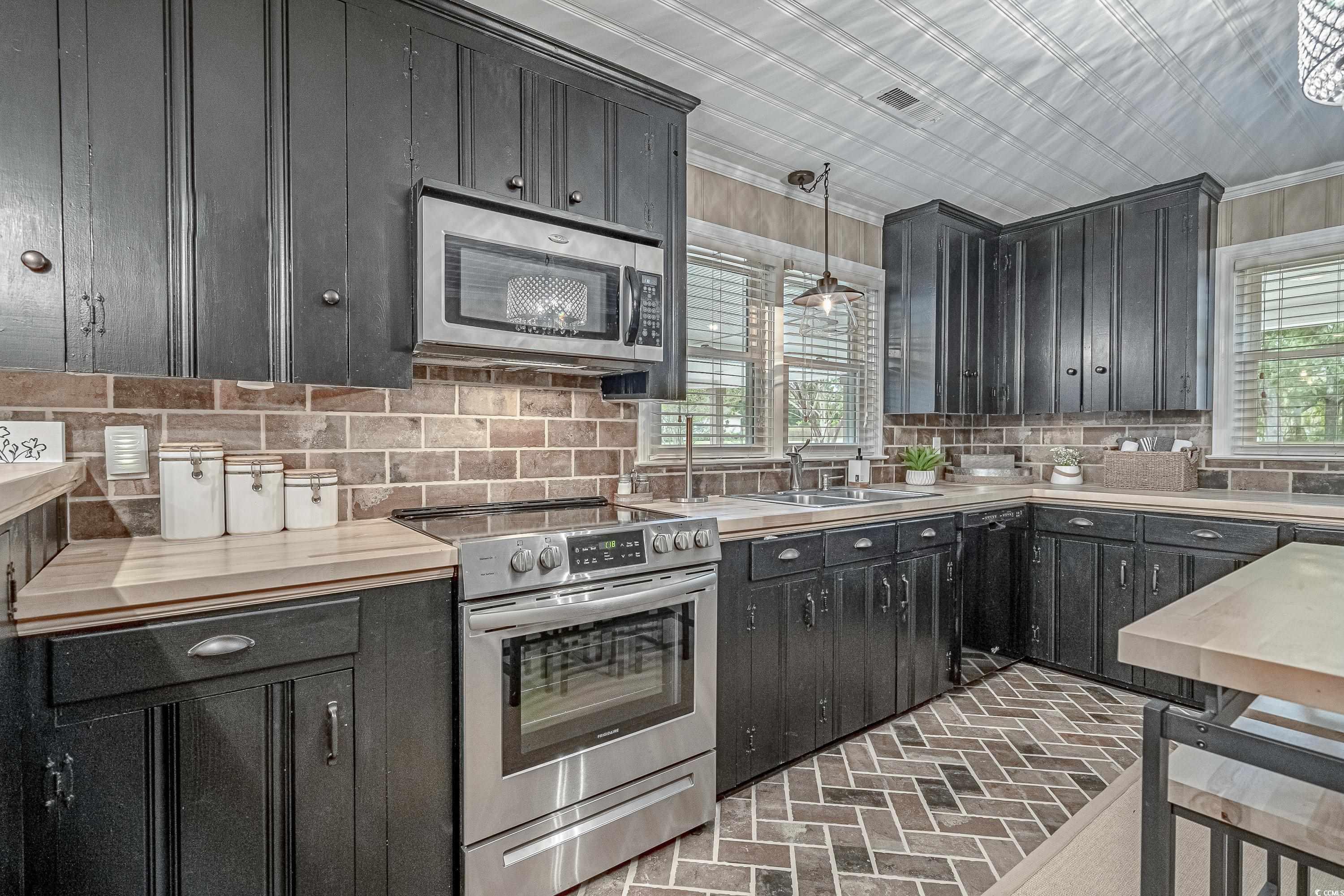 Like something straight off HGTV—only better in person! This impeccably styled farmhouse-meets-modern-luxury home sits on a spacious corner lot just steps from the Little River waterfront. Since photos were taken, a new black metal roof has been added (visible in the listing video), elevating the home’s already standout curb appeal. Though originally built in 1960, nearly everything has been updated—electrical, plumbing, HVAC, windows, doors, flooring, decking, paint, fencing, driveway, and more—making this a truly turnkey coastal retreat with no HOA dues and use flexibility (including short-term rentals). The wraparound deck sets the tone with Southern charm, leading into a newly created laundry drop zone. The kitchen steals the show with butcher-block countertops, dark cabinetry, stainless steel appliances, custom lighting, and herringbone brick flooring. A coffee bar and breakfast bar overlook the open living room, which highlights the home’s character with original hardwood floors and wood-paneled walls. The guest bedroom and beautifully finished marble-accented guest bath sit opposite the master suite, where brand-new French doors open to a freshly poured patio and expansive yard—offering plenty of space for a pool, garage, or outdoor oasis. The updated ensuite features a walk-in tiled shower and plantation shutters. Need more space? The Carolina room can easily become a third bedroom, office, or flex area. To top it off, the home is offered fully furnished—perfectly curated and move-in ready. Style, location, space, and flexibility… this one truly has it all.
