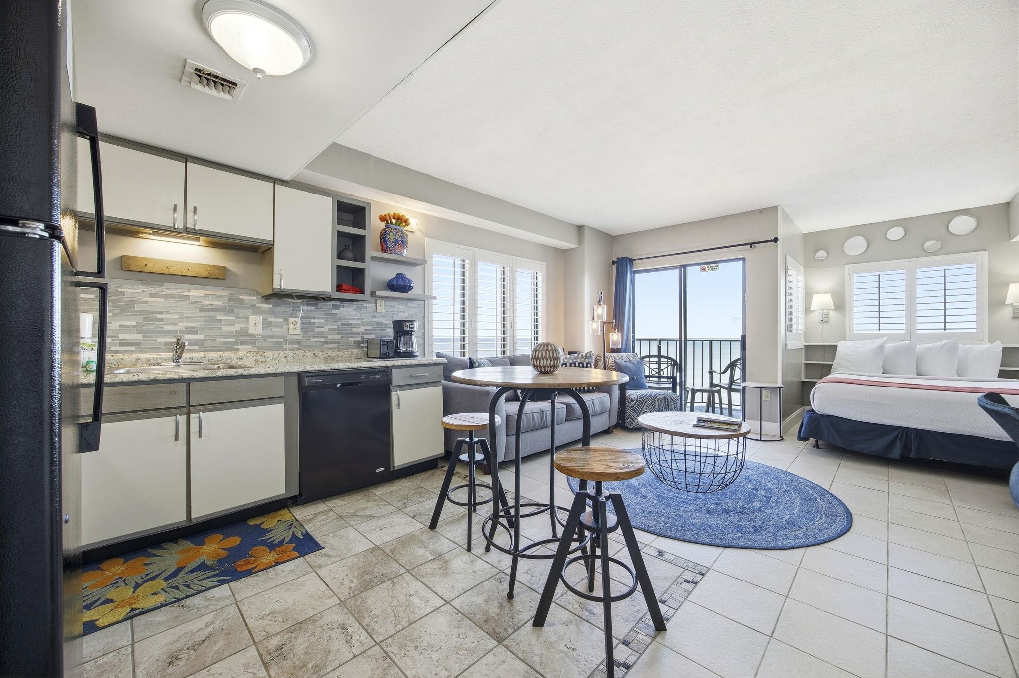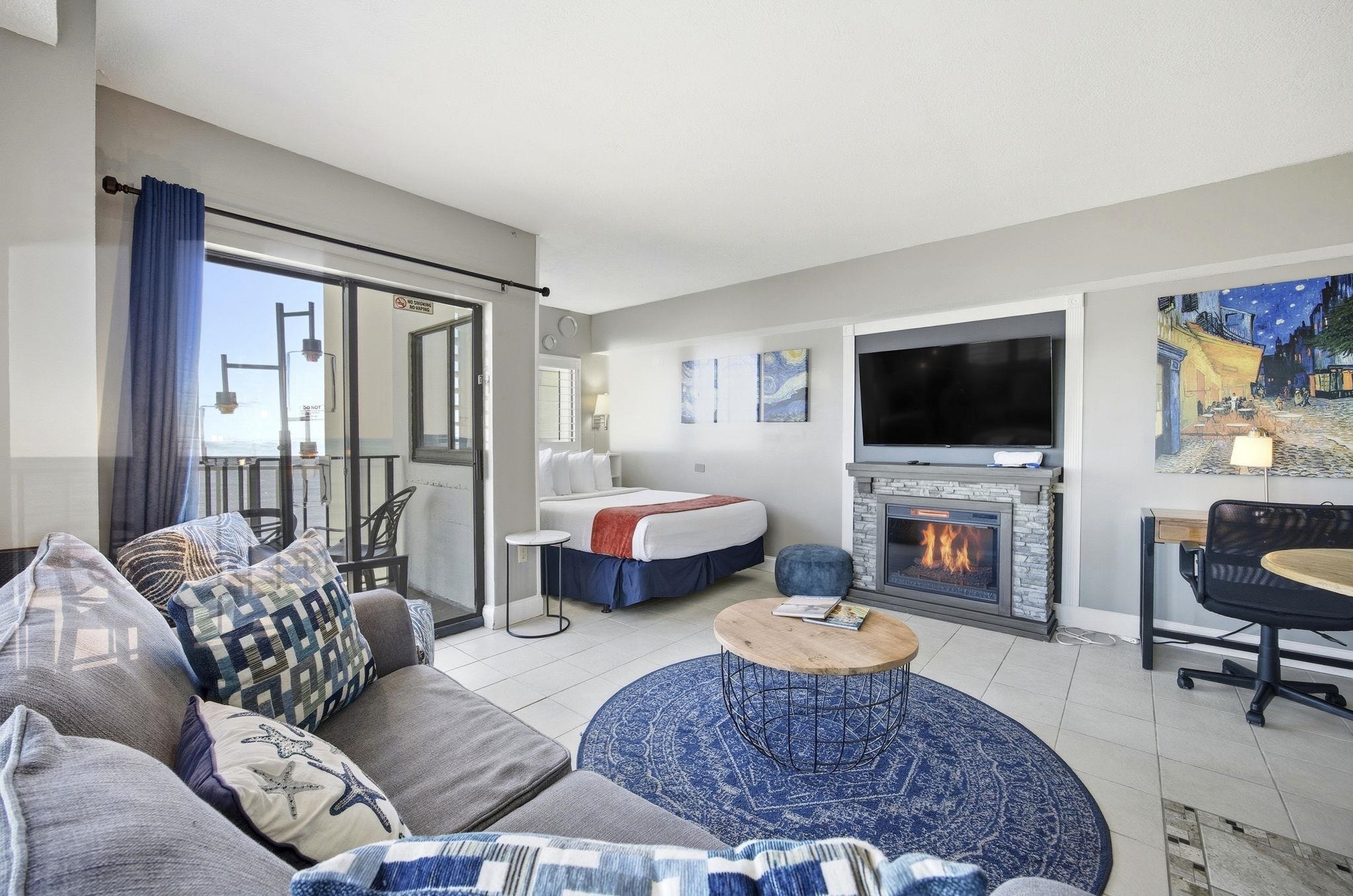 Wake up to sunshine, sea breezes, and endless ocean views in this sunny and bright oceanfront efficiency condo at The Palace Resort. This fully furnished dircect ocean front corner unit is the perfect blend of coastal escape and smart investment. From the moment you step inside, you’re welcomed by a modern, beautifully designed living space featuring tile floors throughout, plantation blinds, and sliding glass doors that open to your private balcony overlooking the Atlantic Ocean. This is where mornings begin with coffee and sunrises and evenings end with the sound of the waves. The kitchen is thoughtfully laid out with full-size appliances, abundant cabinetry, and a cozy eat-in dining area, ideal for casual meals after a day at the beach. After rinsing off the sand in the tub/shower combo, the bathroom’s light-up vanity adds a touch of modern comfort and style. When the day winds down, cozy up by the fireplace, creating a warm retreat after long beach days. The Palace Resort elevates the experience with an impressive lineup of amenities designed to make every stay feel like a vacation: a large oceanfront outdoor pool, multiple indoor pools, whirlpools, sauna, exercise room, putting green, restaurant and lounge, free wireless internet, guest laundry facilities, and an attached parking garage. For convenience, a separate public washer and dryer is available for a fee per use. Perfectly located just minutes from Market Common, the Myrtle Beach Boardwalk, Broadway at the Beach, and Myrtle Beach International Airport, this condo offers unbeatable access to dining, shopping, entertainment, and travel. Whether you’re searching for a personal beach getaway or a high-demand investment property, this oceanfront efficiency at The Palace Resort delivers location, lifestyle, and income potential, all wrapped in one unforgettable coastal opportunity.
