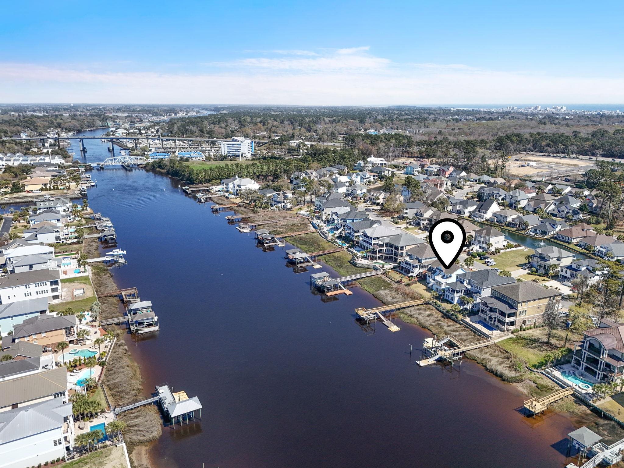 When coastal glam meets southern charm, you will find this stunning estate in Sunset Harbour of North Myrtle Beach. This is your moment to experience the pinnacle of waterfront living as this home is directly on the Intracoastal Waterway, it comes with a shared dock already in place and ready for your boat lift. This is a mariner's dream! Inside, the home radiates sophisticated charm with formal living and dining rooms that greet you upon entering. However, you can't help but be captivated by the views of the Intracoastal Waterway in the wide open classy family room, gourmet kitchen, large breakfast area and cozy Carolina room. This home was truly designed for grand scale entertaining. Also located on the main living floor is one of three primary suites in the home. It is a fabulous space, tremendous in size and so well appointed with high end Alaskan white hardwood floors. Additionally, you will find a 1/2 bath and large laundry service room with tons of storage and space. The marvelous and unique third floor has a catwalk that overlooks the front entry, family room and of course those views of the waterway. You will also find two other large primary suites with attached baths. One of the suites boasts it's own balcony for quiet sunsets, cocktails and yacht watching. There is also a well sized flex space that could easily be converted into a fifth bedroom. We can't forget to mention there is a huge walk in storage area as well. Moving down to the ground level, you have two garages that are large enough to fit all of your toys! A boat, vintage car, motorcycles, golf carts...whatever it is, this home offers that space with ease. You also have a heated and cooled workshop for those who love to be creative and a bonus space fit for a billiard room, guest space, or media room. It's up to you to decide and enjoy. Beyond the workshop is a partially enclosed storage area that could easily be converted into an outdoor kitchen of your dreams. The yard is substantial and your canvas to create your own oasis. And if that dream backyard oasis includes a pool, you won't have to worry about your visitors, because there is a half bath on this ground floor too. So, whether you're heading out for that sunset cruise on the waterway or taking a quick golf cart ride to the beach to watch the sunrise, the best of the coast is at your doorstep with this estate. Being so centrally located in North Myrtle Beach, there are many dining establishments and boutique shopping experiences just a short golf cart ride away. Sunset Harbour offers first class amenities that include a swimming pool, hot tub, day docks, boat launch, gazebo, and recreational vehicle parking. Hurry and call your trusted Realtor partner to schedule your private showing now.