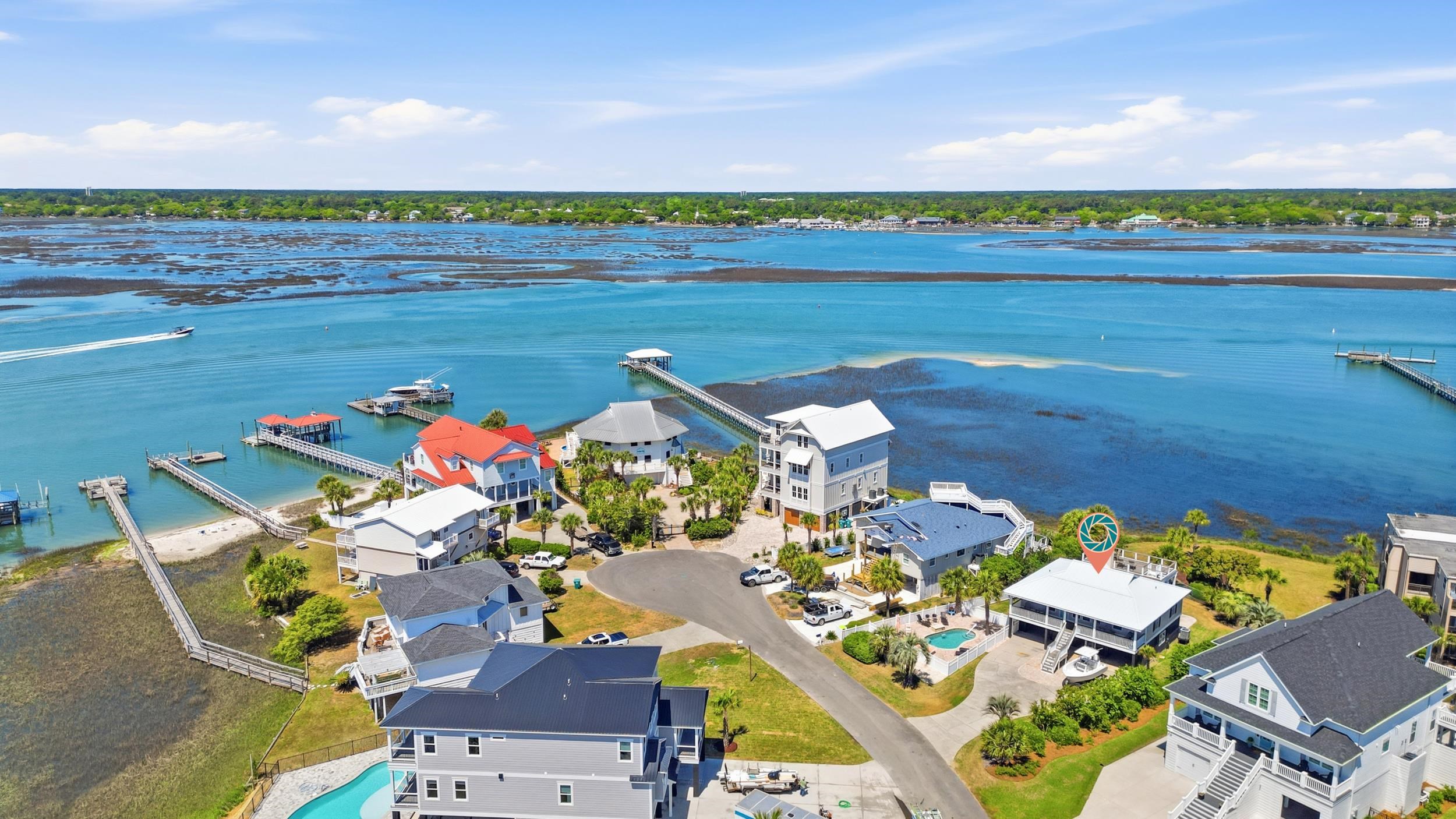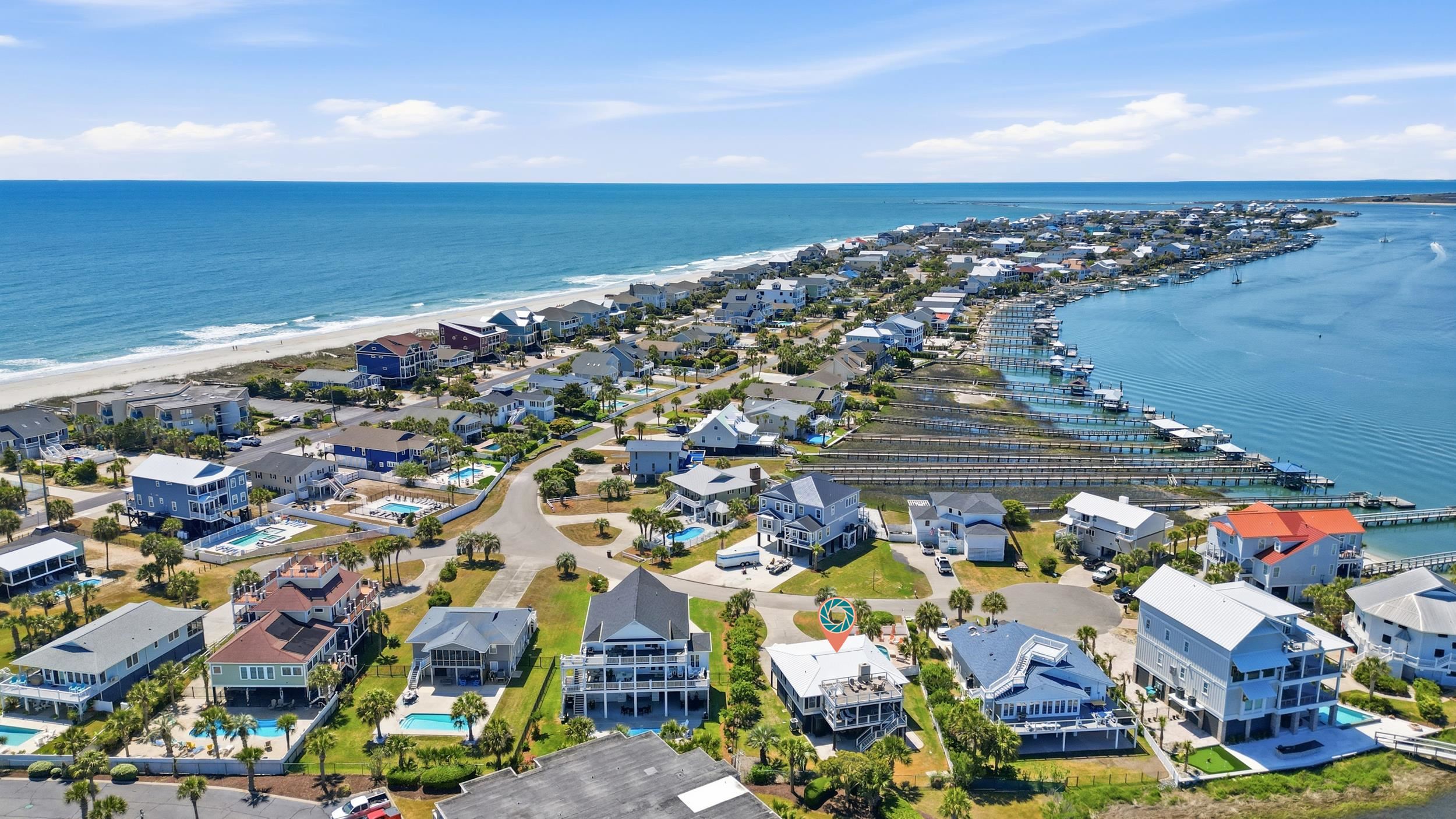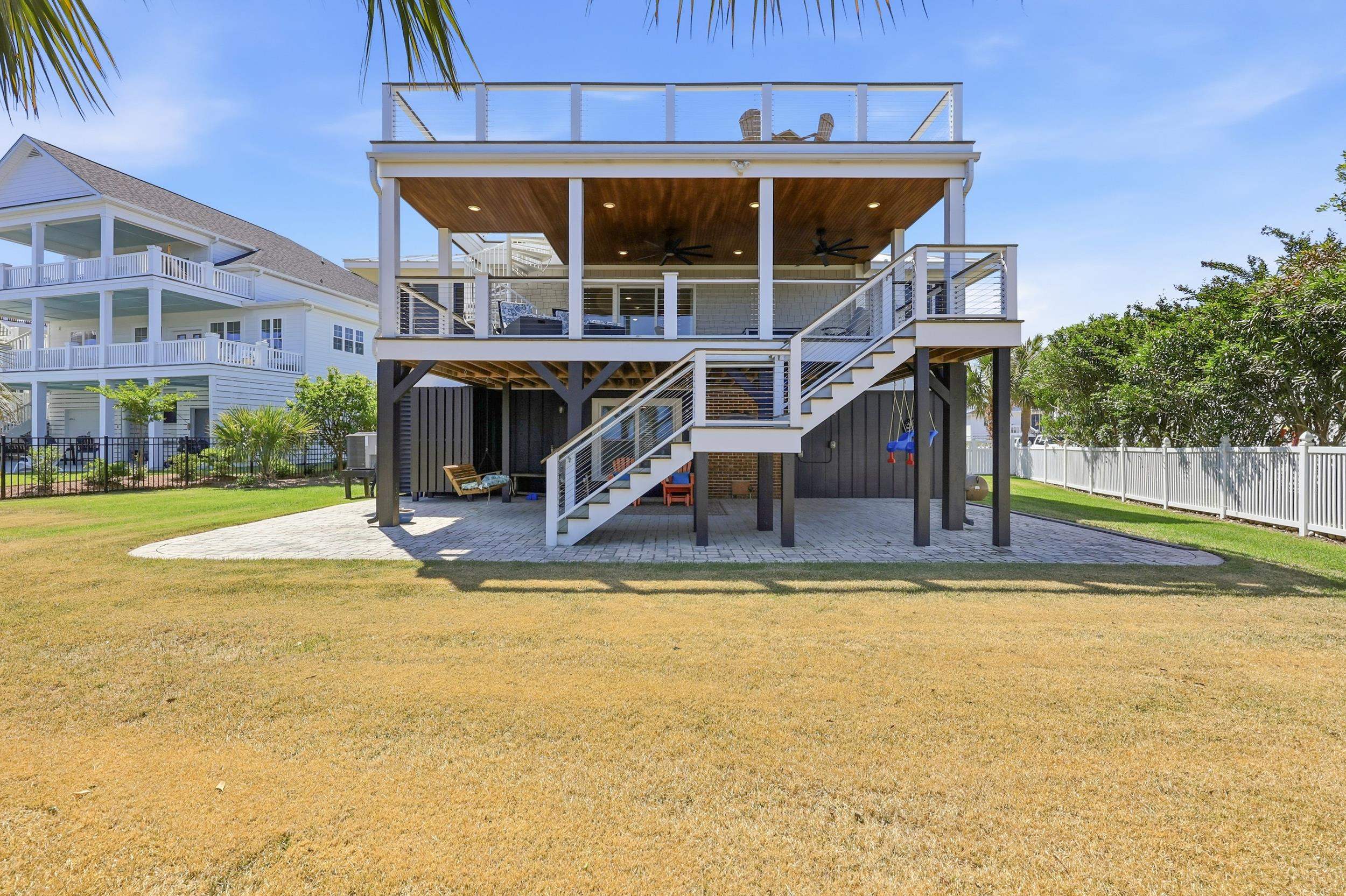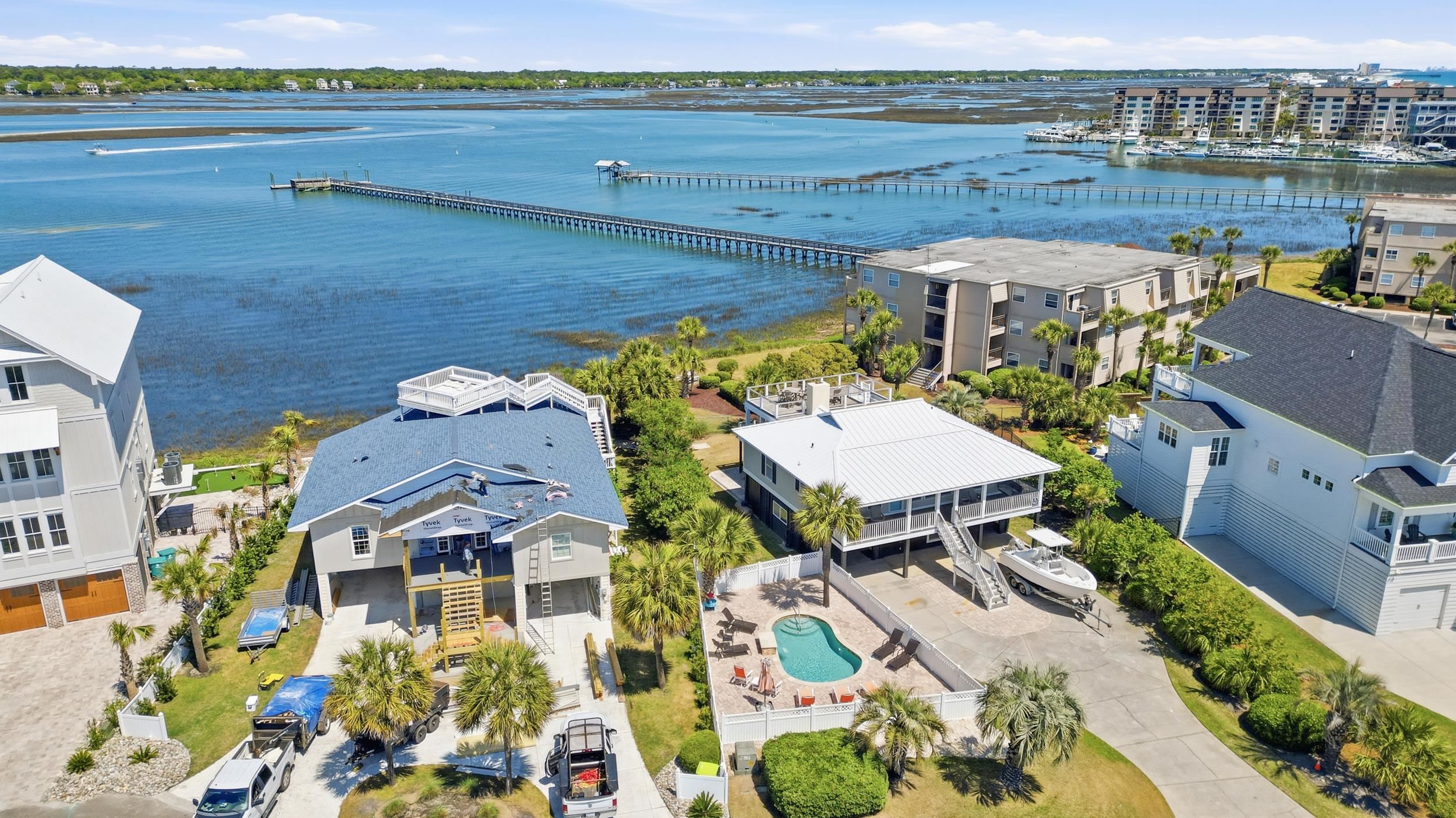 Discover coastal living at its finest in this beautiful 4-bedroom, 3-bath raised beach home with private pool, perfectly situated at the end of quiet Dolphin Street in Garden City Beach. NO HOA and tucked away with minimal traffic, with a private fenced yard, this turnkey retreat offers serene panoramic views over the creek and inlet, creating a peaceful escape just moments from the beach. Step inside to find a bright open interior featuring modern furnishings, a gas fireplace for off season cozy evenings, and thoughtful updates throughout. The layout comfortably accommodates family and guests with 3 bedrooms on the raised second level, and one bedroom accessible through interior stairwell to the first level. Outside, enjoy your own private swimming pool surrounded by a spacious patio—ideal for sunny days and evening gatherings. A covered front & rear porch/deck and expansive observation deck off the roof both feature Ipe hard wood and deliver breathtaking views over the inlet, perfect for watching sunsets, boats, and wildlife. This fully furnished and updated beach home offers the perfect blend of comfort, style, and coastal charm in one of the Grand Strand's most desirable communities. Don't miss your opportunity to own this rare find in the laid back South End of Garden City Beach!