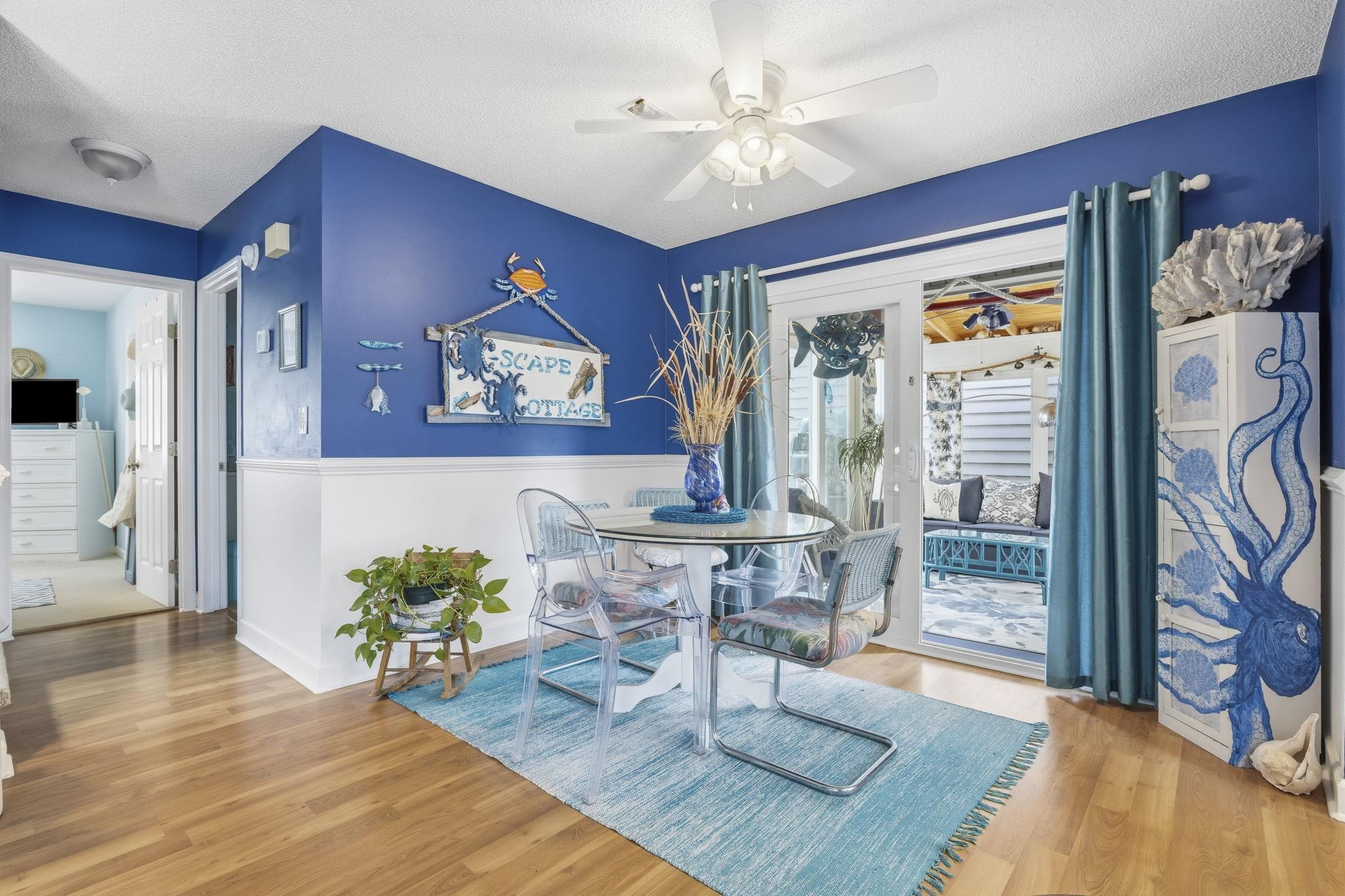 Charming 3-bedroom, 2-bath cottage-style home located in an intimate community, only 0.1 miles from the beach, with a public beach access at the end of the road and golf cart parking available. This inviting home features beautiful chair rail molding throughout, adding a touch of classic character. The vaulted living room creates a bright, open feel, while the stunning Carolina room offers the perfect place to relax and enjoy coastal living. The dining room includes sliding glass doors that open to a private patio, ideal for entertaining or quiet mornings. The kitchen is equipped with stainless steel appliances, and the laundry closet includes a washer and dryer for added convenience. Upstairs you’ll find an open loft area along with two spacious bedrooms and a full bath, providing comfortable separation of living space. A rear balcony offers another peaceful outdoor retreat. Outside, enjoy an outdoor shower, perfect after a day at the beach. A detached storage shed in the backyard provides additional storage, and the community takes care of landscaping for easy, low-maintenance living. Enjoy coastal living just moments from the sand, dining, and local attractions.