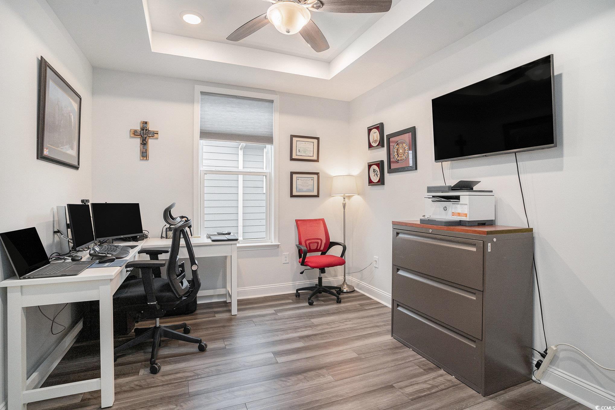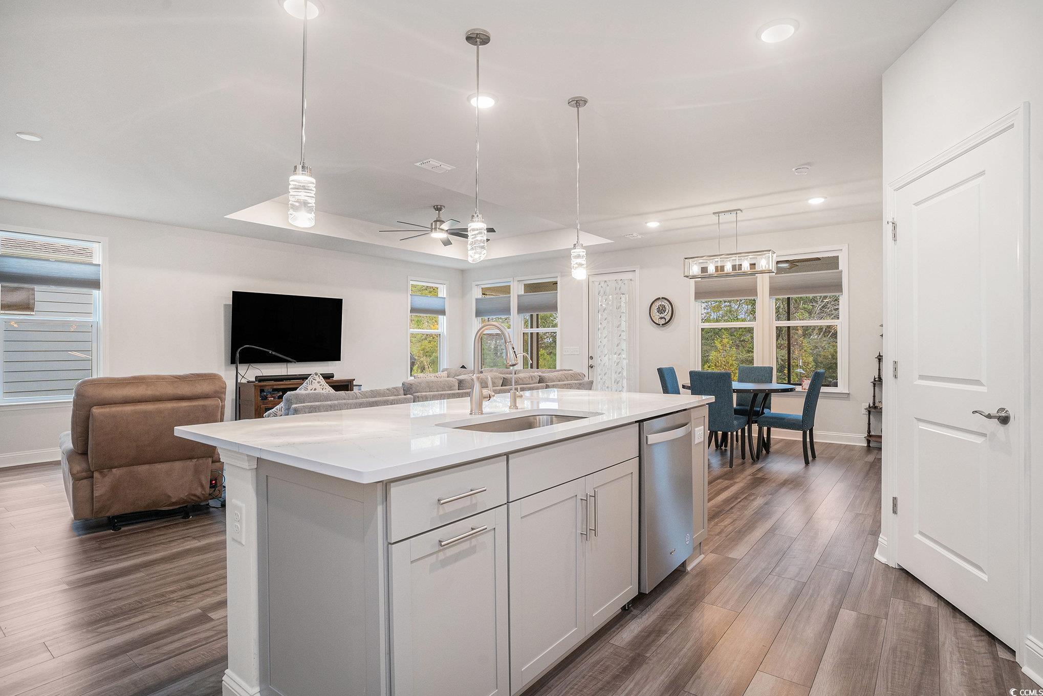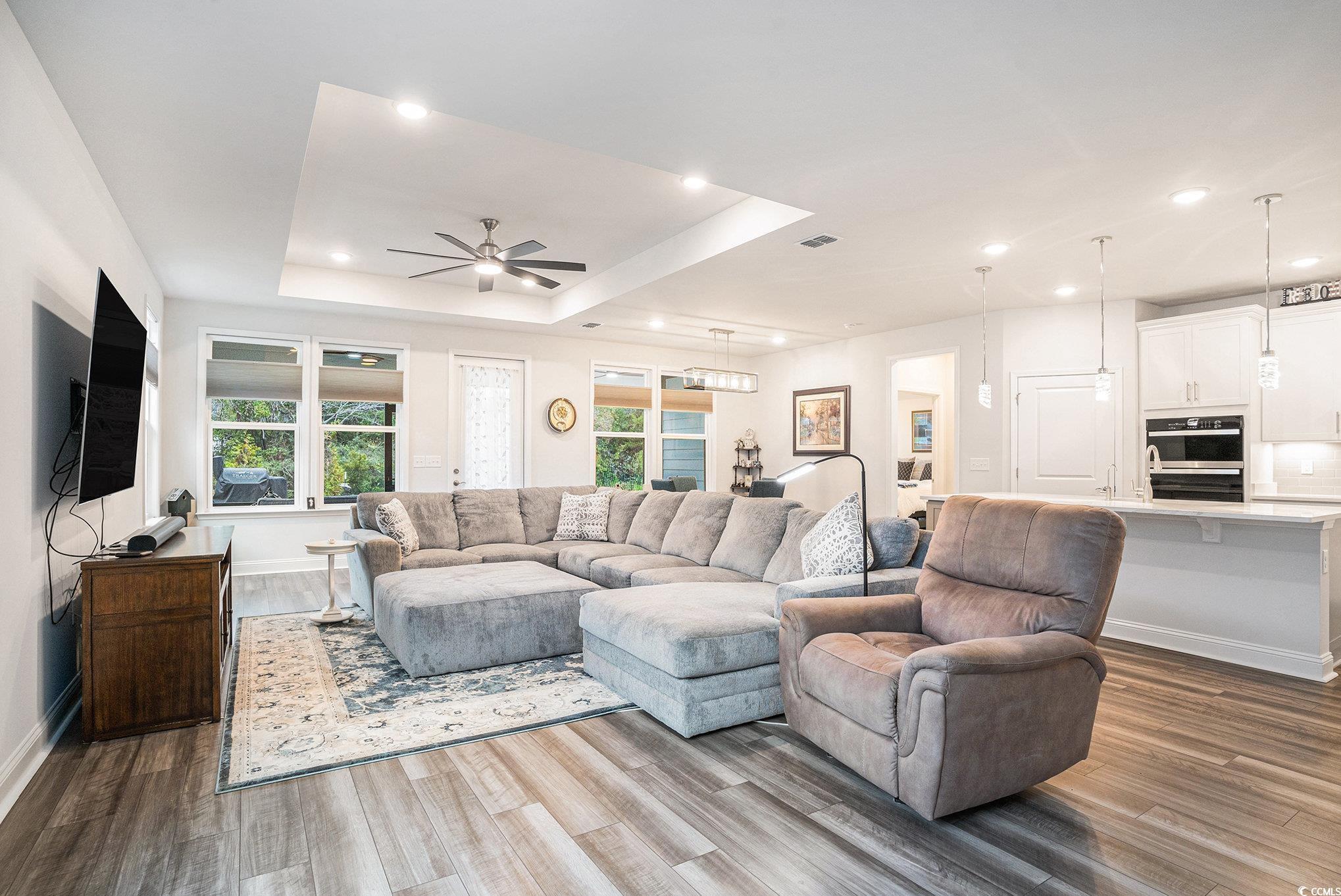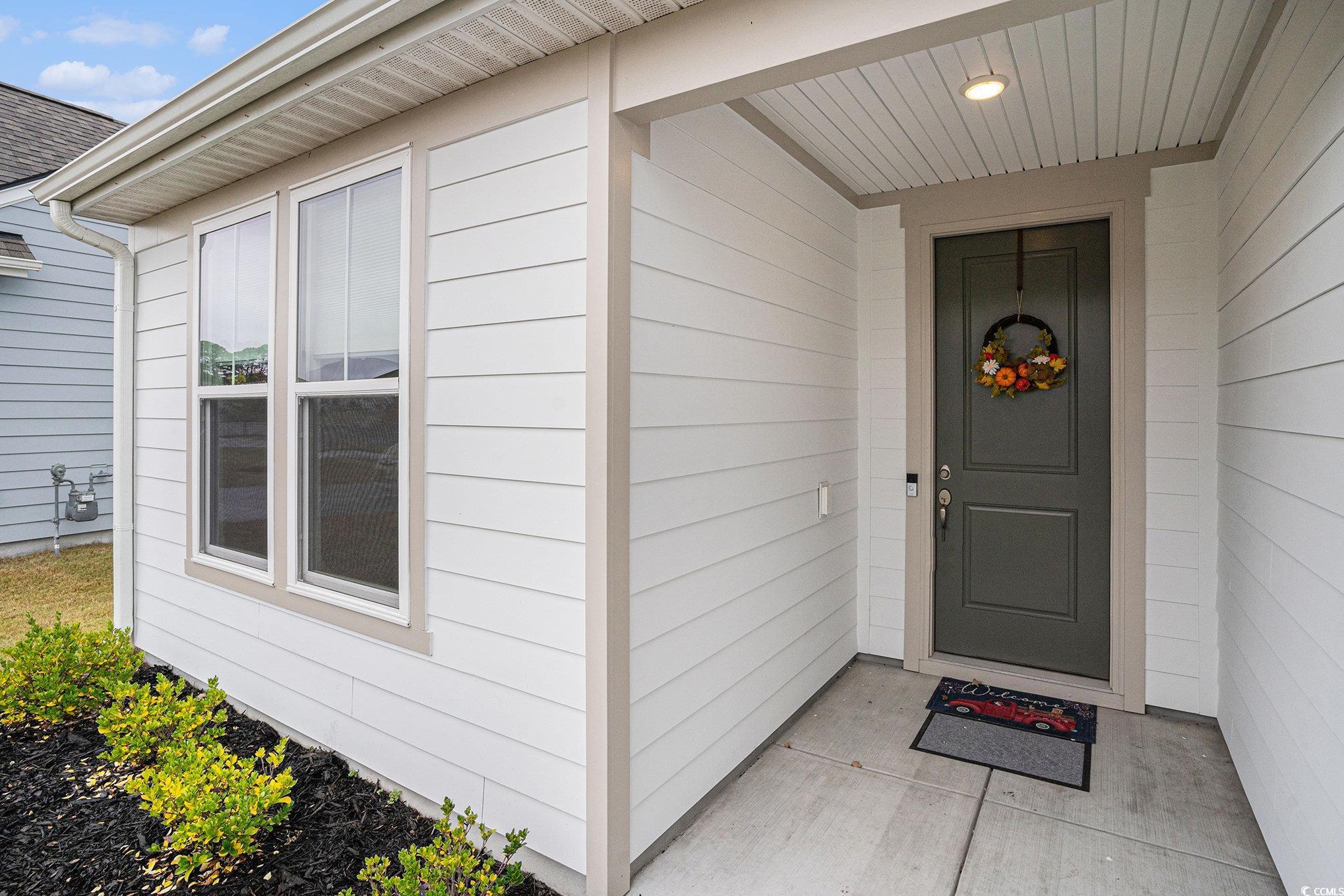 This beautifully maintained home is situated on a private, wooded homesite and offers a spacious open floorplan designed for comfortable coastal living. The extended gathering room flows seamlessly into a gourmet kitchen featuring built-in stainless Whirlpool appliances, a stainless vent hood over the gas cooktop, white and gray cabinetry, quartz countertops, and a desert gray tile backsplash with under-cabinet lighting. The home includes luxury vinyl plank flooring throughout, a large screened lanai with a gas stub-out for a future grill or outdoor kitchen, and a 2-car garage with additional tandem storage or golf cart space. Elegant tray ceilings accent the gathering room, flex/bonus room, and owner’s suite. The owner’s bathroom showcases a fully tiled spa shower with Carrara-style tile and a spacious walk-in closet. Additional upgrades include a custom trim package, brushed nickel finishes, gutters, and an irrigation system. Located within a vibrant 55+ community in central North Myrtle Beach—just a mile from the ocean—residents enjoy golf cart-friendly streets, pet-friendly policies, and fenced yards. HOA dues include yard maintenance, high-speed internet, cable, and access to planned resort-style amenities such as a clubhouse, indoor lap pool, outdoor saltwater pool and hot tub, pickleball and bocce courts, putting green, and a fitness center. A full-time lifestyle director coordinates community events and activities. Conveniently close to shopping, dining, medical facilities, marinas, golf courses, and public beach access, this property combines relaxed coastal living with an active, social community setting. Don't wait. Schedule your private tour today!