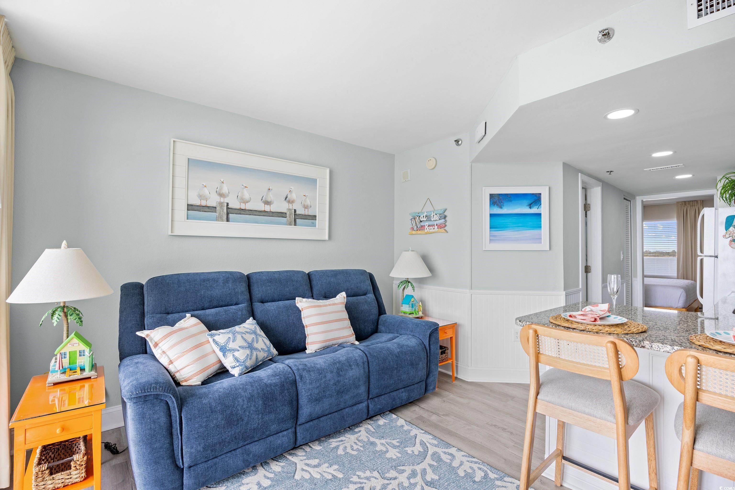 Nicely renovated one-bedroom, one-bathroom condo with a full kitchen and direct oceanfront views from the balcony. This property has smooth ceilings and LVP continuous flooring. The bathroom has a newly tiled walk-in shower with an updated vanity. The kitchen has updated shaker cabinets, a dishwasher, a range, a microwave, and a refrigerator. The living room boasts a ship lap built-in electric fireplace with a flat screen TV. This spacious living area has beadboard walls, newer furniture, and 2 2-seat breakfast bar. There is also a 2-seat pub table on the balcony. Enjoy all of Seawatch's amenities, including two indoor pools, five outdoor pools, 12 jacuzzis, a lazy river, oceanfront restaurant, and much more. This property would make a great second home, rental property, or primary residence. A must see!