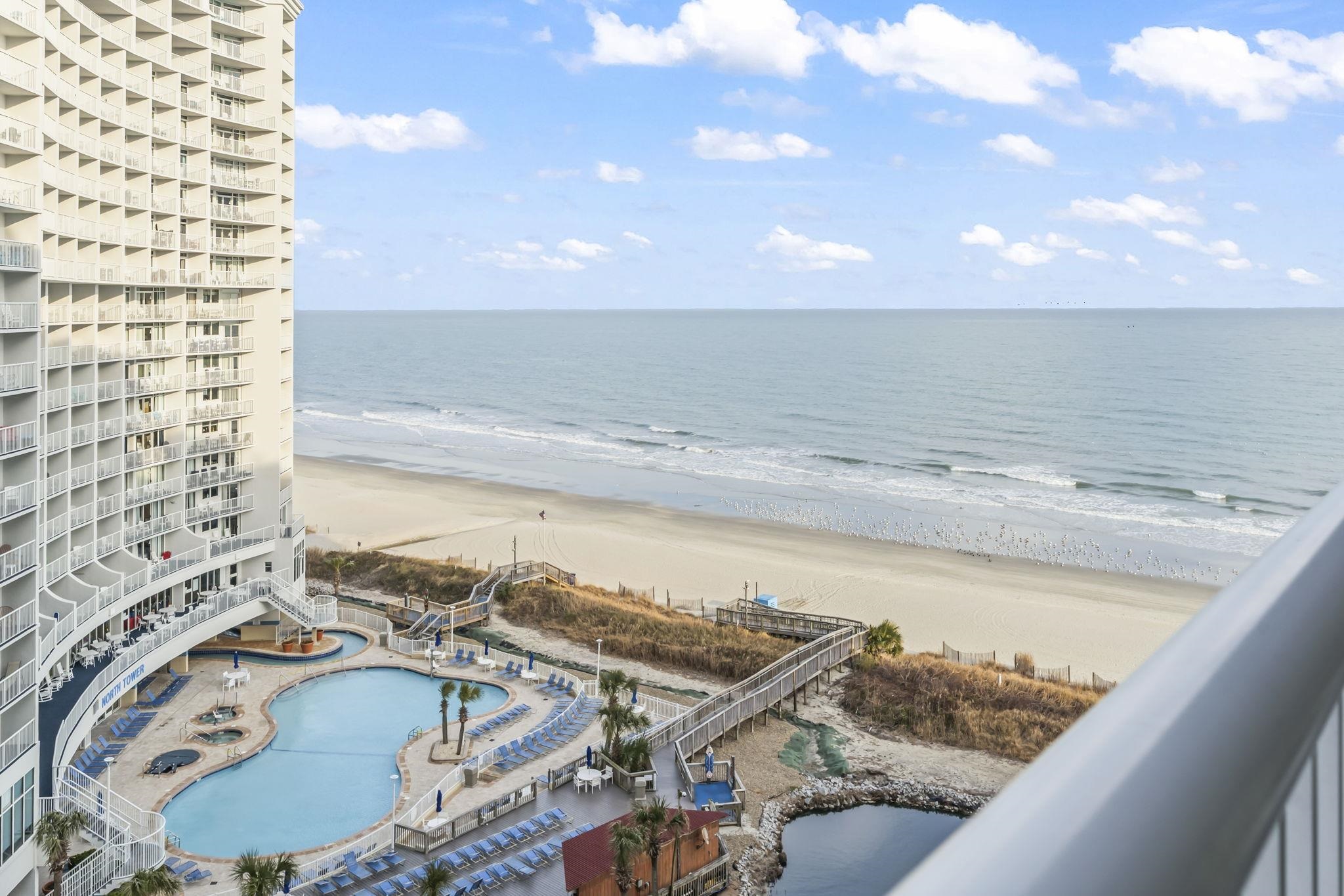 This tastefully decorated move in ready 2 bedroom 2 bath oceanfront condo is located in the highly sought after SeaWatch Resort, a Wyndham-affiliated community in the Arcadian section of Myrtle Beach. Positioned on 10 acres of meticulously landscaped oceanfront property, SeaWatch Resort offers true resort-style living. Enjoy a wealth of amenities including multiple indoor and outdoor pools, two resort-style indoor heated pools perfect for year-round enjoyment, relaxing hot tubs, lazy river, a fitness room, a game room, on-site dining, Starbucks coffee shop and a poolside cabana. This turnkey unit is fully furnished and thoughtfully updated, making it ideal as a rental investment, second home, or primary residence. Both the open living area and the primary bedroom open onto a spacious private balcony, where you can take in stunning ocean views and refreshing coastal breezes. The well appointed kitchen boasts granite countertops and modern appliances, and recent updates ensure a bright, welcoming atmosphere. Conveniently located near shopping, golf, dining, entertainment, and all the area attractions Myrtle Beach has to offer. This condo truly blends comfort and convenience. The HOA fee includes insurance, in-unit electric , cable, internet, phone service, pest control, water/sewer, security and trash- providing exceptional value and ease of ownership.
