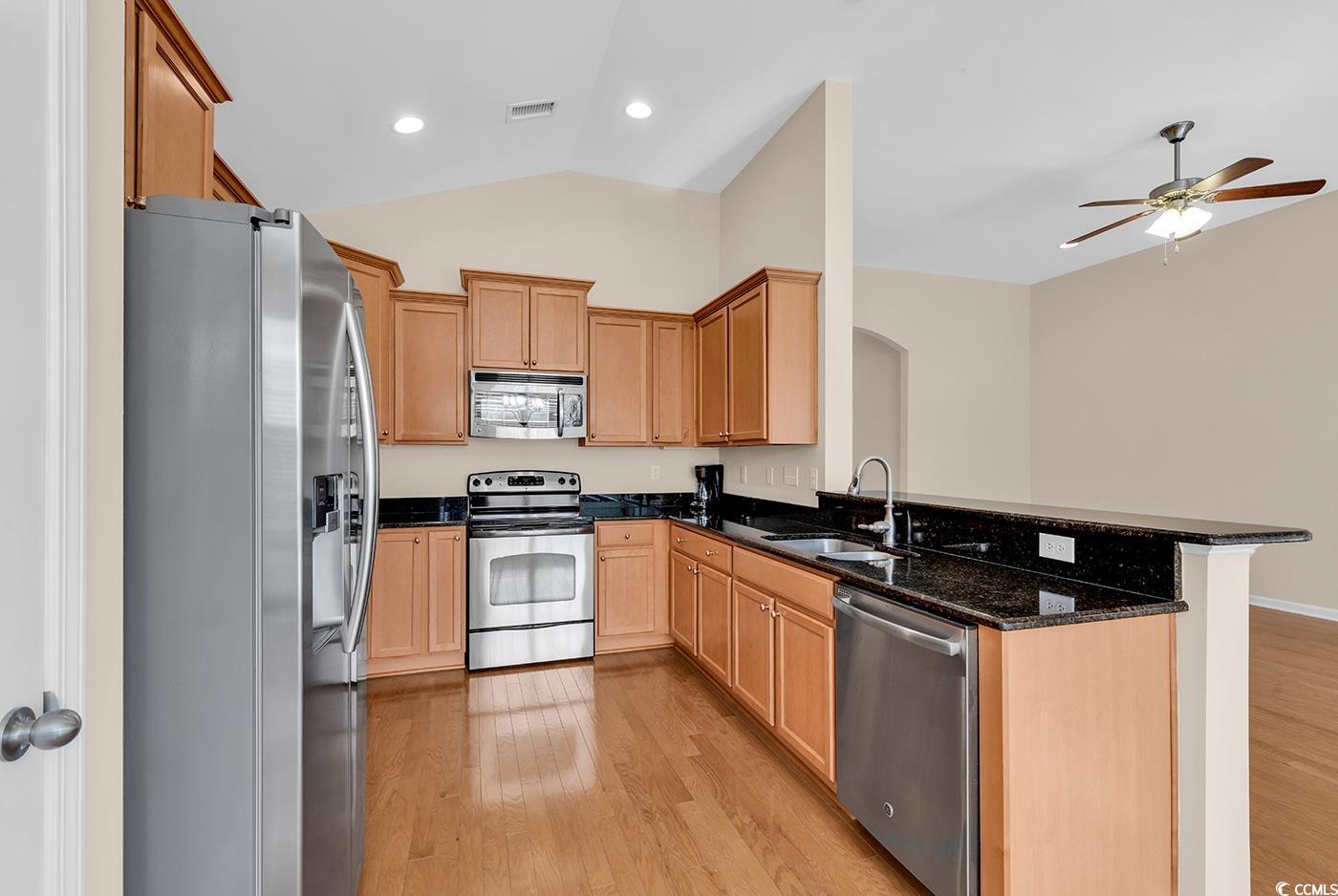 Welcome to 1612 Fairforest Ct, nestled in the desirable Jessica Lakes community of Conway, SC. Set along a sidewalk-lined street, this beautifully maintained single-level home offers exceptional curb appeal with charming brick accents and attractive landscaping. Step inside through the inviting front entry with transom window and sidelights, immediately showcasing the home’s bright and welcoming atmosphere and abundance of natural light. This open-concept residence features a 3-bedroom, 2-bath split-bedroom floor plan that offers both privacy and an open, inviting feel. The expansive foyer leads through an arched entryway into the great room, highlighted by vaulted ceilings and recessed lighting, and opens seamlessly to the kitchen and dining area overlooking the semi-private backyard—ideal for everyday living and entertaining. Beautiful wood flooring flows throughout the foyer, hallways, great room, kitchen, and dining area. The open kitchen is both stylish and functional, featuring granite countertops, stainless steel appliances, ample cabinetry and counter space, a pantry, and a breakfast bar, and flows effortlessly into the dining area. The dining space offers a large double window and sliding glass doors leading to the covered rear porch and patio, perfect for indoor-outdoor enjoyment. The backyard, bordered by mature trees, provides a peaceful setting for relaxing or hosting gatherings, and the property includes irrigation. The spacious owner’s suite serves as a private retreat with a tray ceiling, ceiling fan, multiple windows, and direct access to the backyard patio. The large en-suite bath includes ceramic tile flooring, a dual-sink vanity, garden tub with window above, walk-in shower, water closet, and a generous double-door walk-in closet. Two additional bedrooms feature carpeted floors, ceiling fans, and ample closet space, with the front bedroom also boasting a vaulted ceiling. The guest bathroom offers ceramic tile flooring, a vanity, and a tub/shower combination. Additional highlights include a linen closet, coat/storage closet, laundry room with overhead cabinetry, security system, new wood 2” blinds, and fresh interior paint. All appliances, including the washer and dryer, convey. The double garage features epoxy floors, pull-down attic stairs with storage access, organizational hooks, ample cabinetry, and a main water shut-off valve, providing both functionality and convenience. Conveniently located near downtown Conway, Coastal Carolina University, shopping, dining, entertainment, and just a short drive to the sandy shores of Myrtle Beach, this move-in-ready home offers the perfect blend of comfort, style, and accessibility. 1612 Fairforest Ct is a must-see—schedule your showing today!