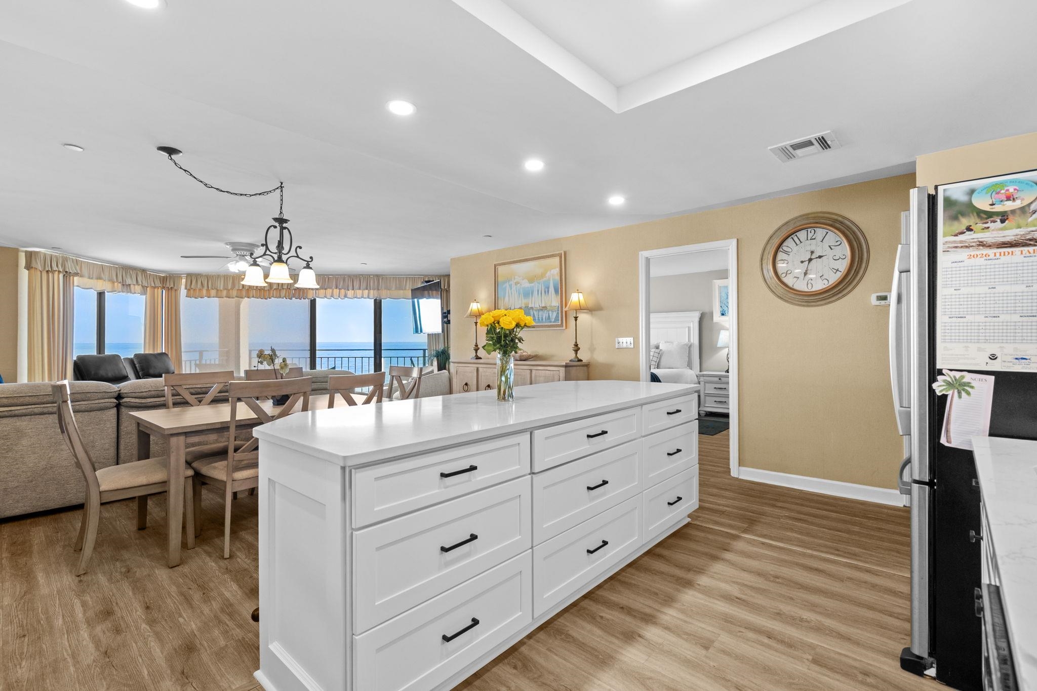 Very rare opportunity to own a 4-week interval in the highly sought-after Surfmaster condominium complex in Garden City Beach. Located on the 5th floor, this spacious 3-bedroom, 3-bath oceanfront residence offers sweeping views of the Atlantic along with a recently renovated kitchen, updated flooring, and beautifully refreshed furnishings throughout. The open and inviting floor plan features luxury vinyl plank flooring and a stunning kitchen complete with white cabinetry, solid surface countertops, stainless steel appliances, and a coastal-inspired tile backsplash. The dining and living areas flow seamlessly onto the private oceanfront balcony—perfect for enjoying sunrise views and the sound of the waves. The oceanfront primary suite provides direct balcony access and breathtaking water views, while two additional bedrooms and baths comfortably accommodate family and guests. A private in-unit washer and dryer add everyday convenience. Surfmaster is located approximately one mile north of the Garden City Pier and features beautifully landscaped grounds surrounding two oceanfront swimming pools, hot tubs, a large sundeck, and an owners-only fitness center. The tiered parking garage provides two designated parking spaces per unit with convenient access to dual elevators. This is a no smoking, no pets, and no rentals unit, creating a quiet, owner-focused environment. Changeover day is Sunday. Enjoy four weeks each year of effortless coastal living in one of Garden City Beach’s premier oceanfront communities.