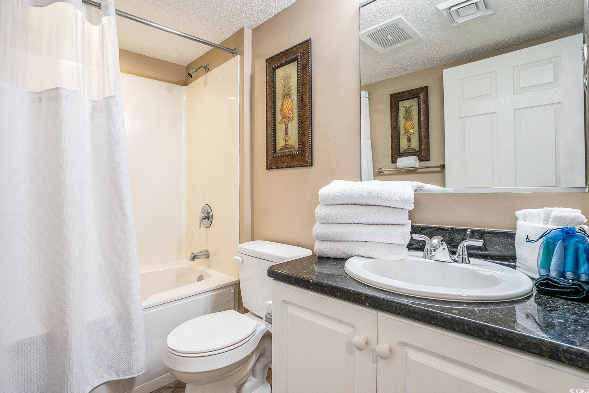 Welcome to this stunning 3 bedroom, 3 bathroom oceanfront condo in the highly desirable Crescent Shores one of North Myrtle Beach's most sought-after luxury buildings. Located on the first floor, this spacious unit boasts an open floor plan with upgraded tile flooring and coastal-chic furnishings and décor throughout. The kitchen is equipped with stainless steel appliances, granite countertops, and a breakfast bar, seamlessly flowing into the dining and living areas all with panoramic ocean views. Each generously sized bedroom features ample closet space and private access to a full bathroom, offering comfort and convenience for guests and owners alike. The oceanfront owners suite includes direct access to your private balcony, along with a double vanity, walk-in shower, and a luxurious garden tub for ultimate relaxation. This unit is being sold fully furnished and includes a washer and dryer, making it truly turn-key for immediate use or rental. Step out onto your spacious balcony to enjoy breathtaking views of the Atlantic, just steps from the sand. Crescent Shores offers resort-style amenities, including indoor and outdoor pools, hot tubs, a lazy river, and private beach access, perfect for enjoying coastal living at its finest. The beauty of this unit is you can watch and converse with your guests in the pool from the balcony with ease. And skip the long line for the elevator - just one short flight up the stairs. Ideally located in the heart of North Myrtle Beach, you'll be minutes from top-rated dining, shopping, entertainment, and world-class golf. Whether you're searching for a second home, vacation getaway, or investment property, this oceanfront gem has it all.