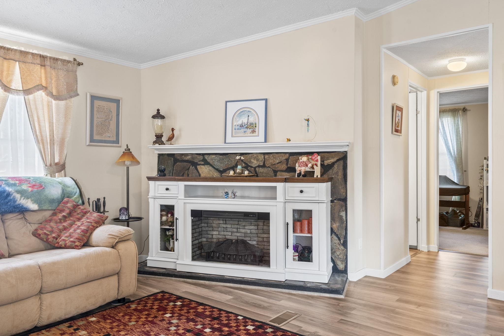 Welcome to Crystal Lake where you can bike or golf cart to the beach, Market Common, grocery stores, dining, and entertainment! This beautifully updated 3-bedroom, 2-bath home is perfectly positioned just steps from a large pond, with pond views from both the front yard and the back deck. The home features a bright Carolina room surrounded by windows added to the rear of the home. Inside, you'll find multiple updates throughout, including new flooring, updated kitchen cabinetry, solid-surface countertops, and appliances, blending modern style with comfortable coastal living. The home also features a wood-burning fireplace that conveys with the property (the electric fireplace does not convey), adding warmth and character to the main living space. Major system upgrades include a HVAC system installed in 2016 and a durable metal roof installed in 2021, giving you added peace of mind. The fenced lot provides space for pets or entertaining, while the covered carport offers ample parking. Additionally, there is a workshop and additional storage above the carport, perfect for beach gear, bikes, and tools. Whether you're searching for a primary residence, second home, or investment property, this Crystal Lake home offers something rare: the ability to golf cart or bike to the beach and Market Common while enjoying tranquil pond-community living, all while benefiting form the comparatively low land lease.