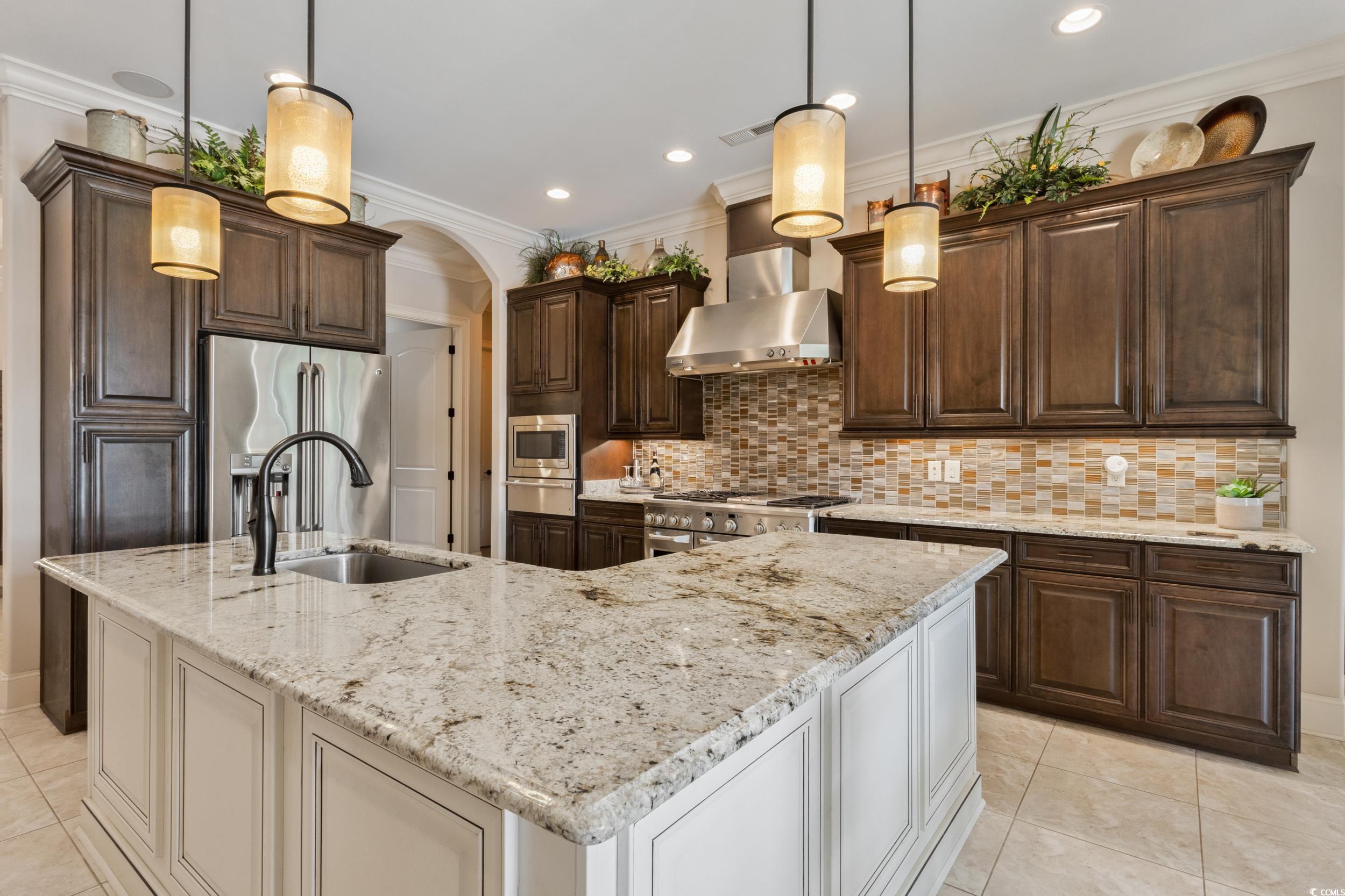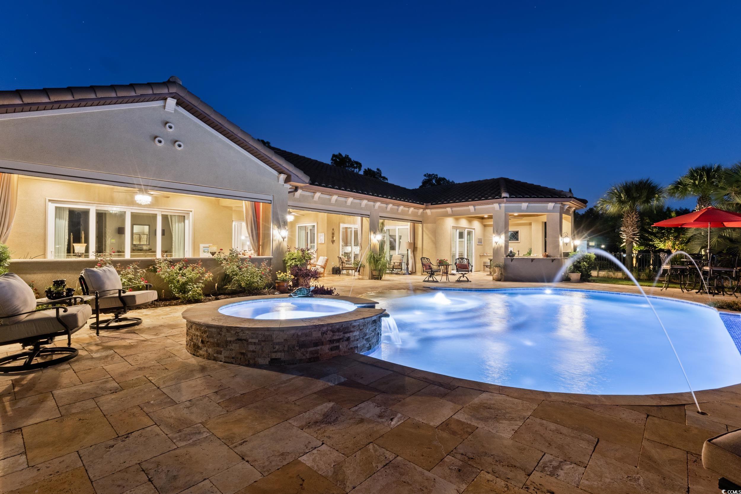 Rare opportunity in the Grande Dunes Members Club! This Mediterranean-style residence is located in the Members Club Cottages—one of the most exclusive enclaves in Grande Dunes—and is the only home offering a direct view of the 18th fairway. Just a three-minute walk to the Members Club itself, the location is unmatched for convenience, privacy, and lifestyle. Step through wrought iron entry doors into an expansive living area with immediate golf course views. The open floor plan blends formal and casual living with a private dining room, an open chef’s kitchen, and seamless indoor-outdoor connections. The kitchen is appointed with custom pull-out cabinetry, dual pantries, and abundant prep space, along with indoor and outdoor breakfast nooks. A coffered-ceiling office/den with closet offers flexible use for work or guest overflow. The primary suite is a true retreat, highlighted by marble flooring, an oversized jetted tub, and a dual, multi-head rain shower. Accordion glass doors open to a private covered lounge, creating a serene extension of the suite. Two additional guest bedrooms are connected by an oversized Jack-and-Jill bath, designed for comfort and privacy. The whole-home surround sound system, including the garage and outdoor living areas, allows for different music in every room, enhancing both relaxation and entertaining. Accordion glass doors extend to three separate outdoor living areas, each outfitted with powered screens and infrared heaters for year-round enjoyment. The outdoor kitchen is designed for gatherings, complete with a large cooking station, bar seating, dual refrigerators, and a sink. The resort-style outdoor space includes a heated, beach-entry saltwater pool with infinity edge overlooking the 18th fairway, spa, waterfall feature, and firepit seating area. The entire lanai and pool deck have been newly finished in travertine tile for timeless elegance. This home runs on natural gas throughout, powering the pool heater and multiple systems for efficiency and convenience. Professionally designed landscaping includes 21 palms that frame the property, while a self-watering fountain in the front yard sets a warm, welcoming tone each time you arrive. An oversized 2.5-car garage with epoxy flooring, built-in cabinetry, and abundant storage completes the property. All furnishings are optional, offering flexibility for a buyer to move right in or personalize the residence to their own taste. The original owners of this residence made sure every detail of this home included luxury craftsmanship both indoor and outdoor living. It is located in one of the most desirable golf course views in Grande Dunes—a rare chance to own in the Members Club Cottages, the most exclusive enclave of the community.