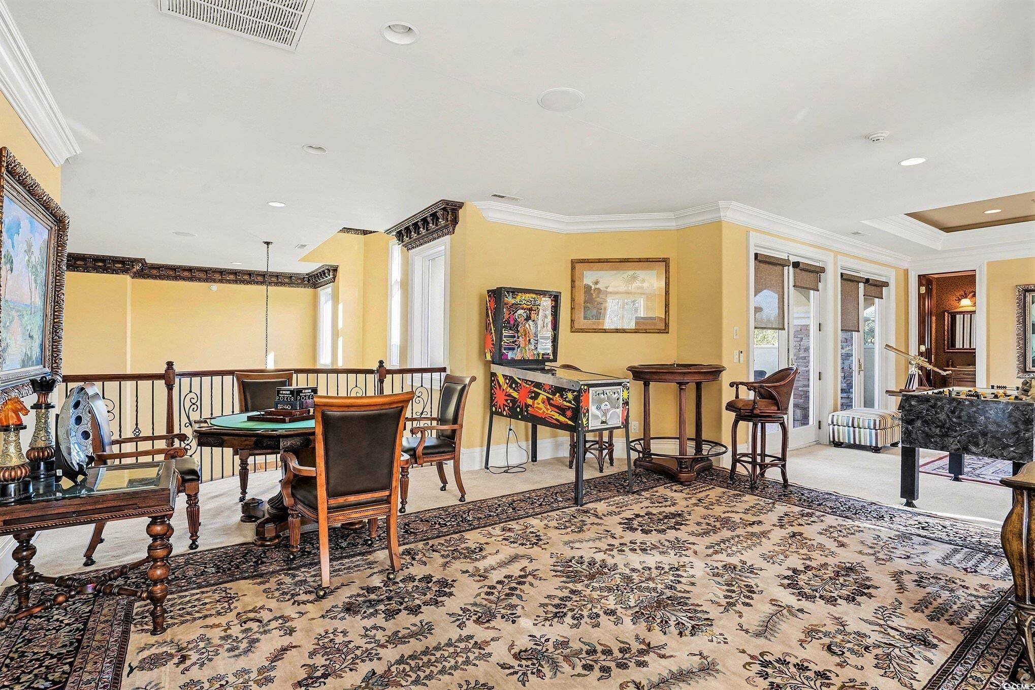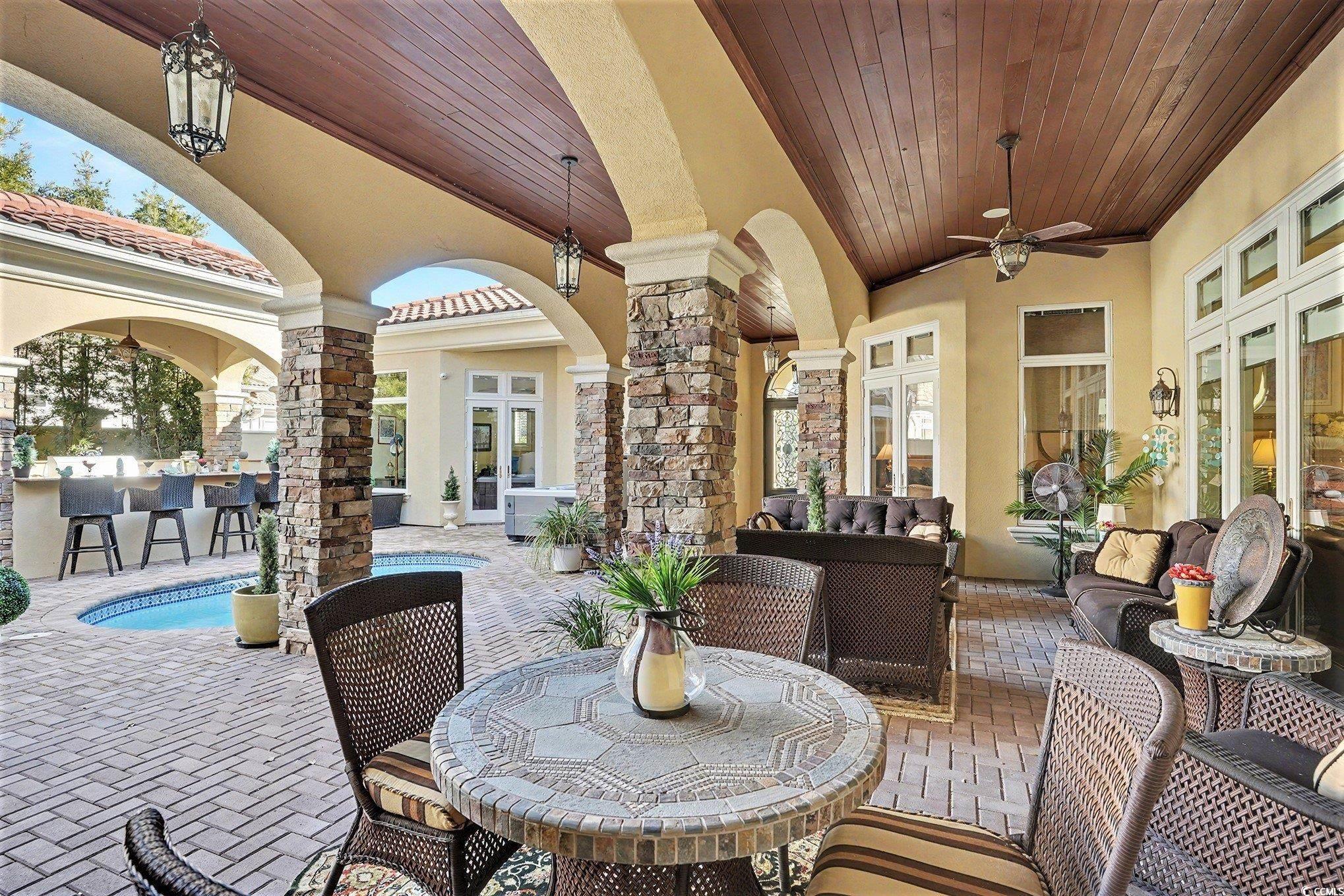 Mediterranean-designed custom home, spanning nearly 6,000 sq. ft., backs onto a picturesque lake/pond and comes beautifully furnished, located in the exclusive, guard-gated community of Grande Dunes. The residence boasts four ensuite bedrooms, two more half baths and ICF fortified construction (Insulated Concrete Form). Beyond the grande iron front doors lies a resort-style courtyard featuring a pool surrounded by covered verandas and patios, New hot tub, outdoor kitchen with built-in grill and wet bar, and a separate casita/in-law quarters. Formal dining and living rooms are adorned with crystal lighting, chandeliers, and soaring two-story windows. The professional chef’s kitchen offers six burners plus a griddle, dual-fuel two-oven range, extensive cabinetry with a multi-station workspace and separate prep sink, and a breakfast room opening to a covered lanai with views of a fountain on the rear lake/pond. The first-floor primary retreat showcases a roaring fireplace, spa-inspired bathroom, two custom walk-in closets, and a sitting room that opens out to the courtyard. A cozy family room centers around a stonecast fireplace with double doors leading to the courtyard. Upstairs, an additional ensuite bedroom opens to a large rear sundeck with views of the backyard and water. The loft/game room features Juliette balconies overlooking the formal areas below, with double doors leading to a covered veranda offering a bird’s-eye view of the courtyard. The state-of-the-art, eight-seat (reclining) movie theater is equipped with a new 125" projection screen and immersive surround sound. An oversized two-car plus golf cart garage provides storage including a pulldown attic storage and epoxy flooring. Additional features include remote-controlled window blinds and Lutron smart lighting switches. ** As a resident of Grande Dunes your HOA fee includes membership to the coveted Ocean Club ocean front w/fine dining, resort style pool/hot tub, poolside food & beverage service, ocean front umbrellas and chairs are provided during the "season", golf cart parking and plenty of fun activities on the calendar almost every day of the month. Grande Dunes is an ocean front neighborhood that expands and bridges over the intracoastal waterway, it is the home of two 18-hole golf courses, The Resort Course (public) and Members Club (private), several on-site restaurants, deep water marina, Har-tru tennis facility and miles or biking/walking trails! Shopping, medical facilities and entertainment within blocks.