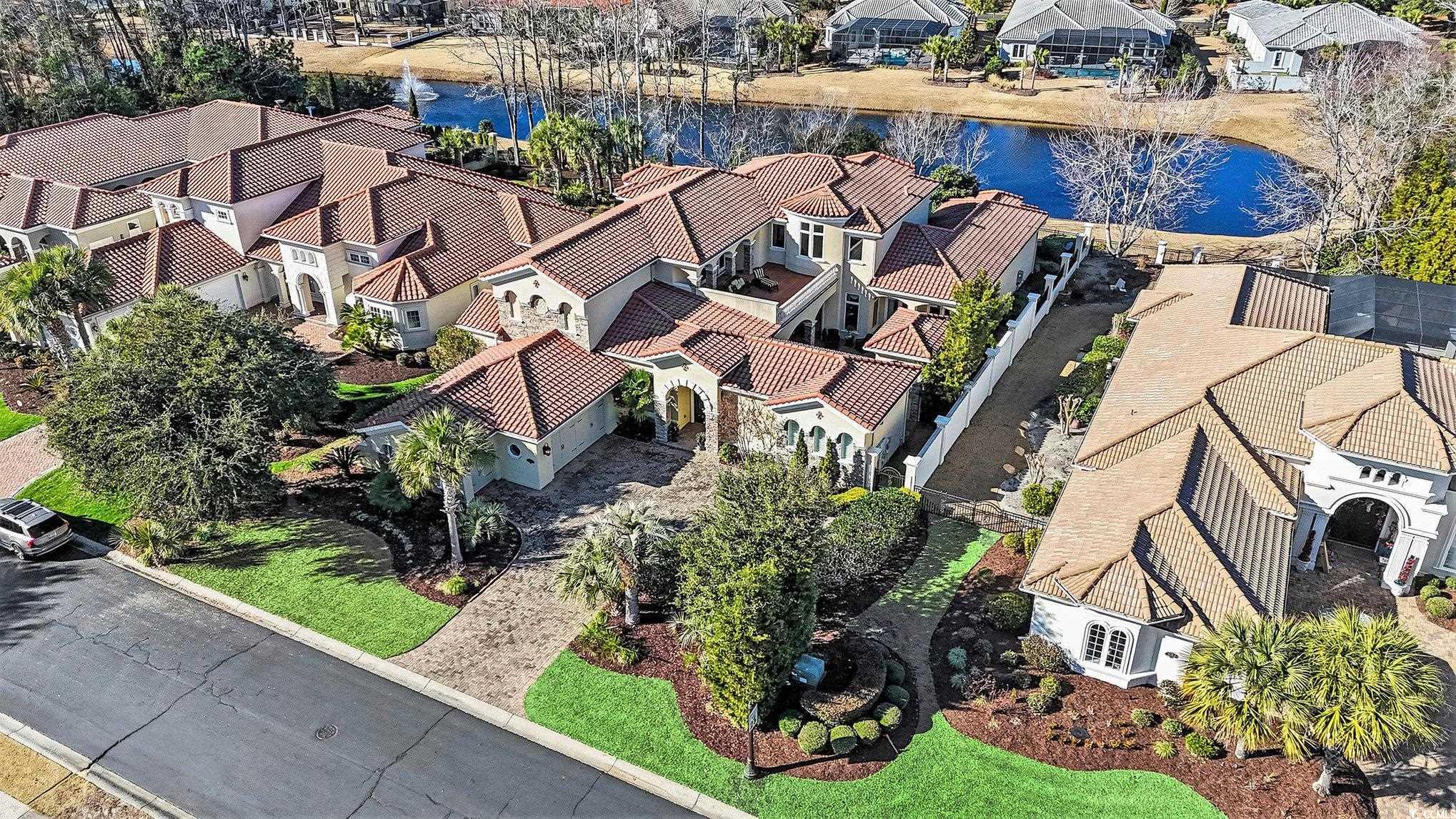 Mediterranean-designed custom home, spanning nearly 6,000 sq. ft., overlooks the picturesque lake/pond and is located in the exclusive, guard-gated community of Grande Dunes. Seller will be leaving the home beautifully furnished (minus a few personal items). The residence boasts four ensuite bedrooms, two more half baths and ICF fortified construction (Insulated Concrete Form). Beyond the grande iron front entry doors a resort-style courtyard featuring a pool surrounded by covered verandas and patios, New hot tub, outdoor kitchen with built-in grill and wet bar, and a separate casita/in-law suite. Formal dining and living rooms are adorned with crystal lighting, chandeliers, and soaring two-story windows. The professional chef’s kitchen offers six burners plus a griddle, dual-fuel two-oven range, extensive cabinetry with a multi-station workspace and separate prep sink, and a breakfast room opening to a covered lanai with views of a fountain on the rear lake/pond. The first-floor primary retreat showcases a roaring fireplace, spa-inspired bathroom, two custom walk-in closets, and a sitting room that opens out to the courtyard. A cozy family room centers around a stonecast fireplace with double doors leading to the courtyard. Upstairs, an additional ensuite bedroom opens to a large rear sundeck with views of the backyard and water. The loft/game room features Juliette balconies overlooking the formal areas below, with double doors leading to a covered veranda offering a bird’s-eye view of the courtyard. The state-of-the-art, eight-seat (reclining) movie theater is equipped with a new 125" projection screen and immersive surround sound. An oversized two-car plus golf cart garage provides storage including a pulldown attic storage and epoxy flooring. Additional features include remote-controlled window blinds and Lutron smart lighting switches. ** As a resident of Grande Dunes your HOA fee includes membership to the coveted Ocean Club ocean front w/fine dining, resort style pool/hot tub, poolside food & beverage service, ocean front umbrellas and chairs are provided during the "season", golf cart parking and plenty of fun activities on the calendar almost every day of the month. Grande Dunes is an ocean front neighborhood that expands and bridges over the intracoastal waterway, it is the home of two 18-hole golf courses, The Resort Course (public) and Members Club (private), several on-site restaurants, deep water marina, Har-tru tennis facility and miles or biking/walking trails! Shopping, medical facilities and entertainment within blocks.