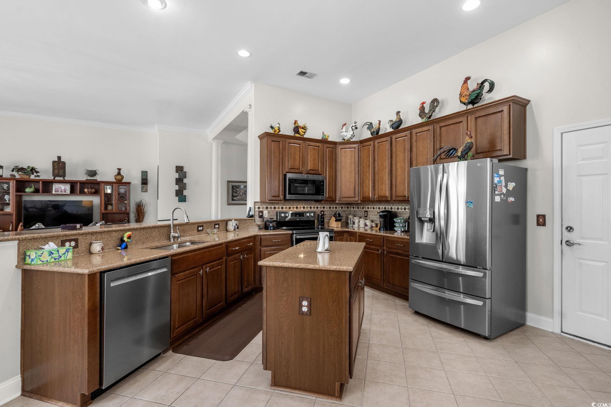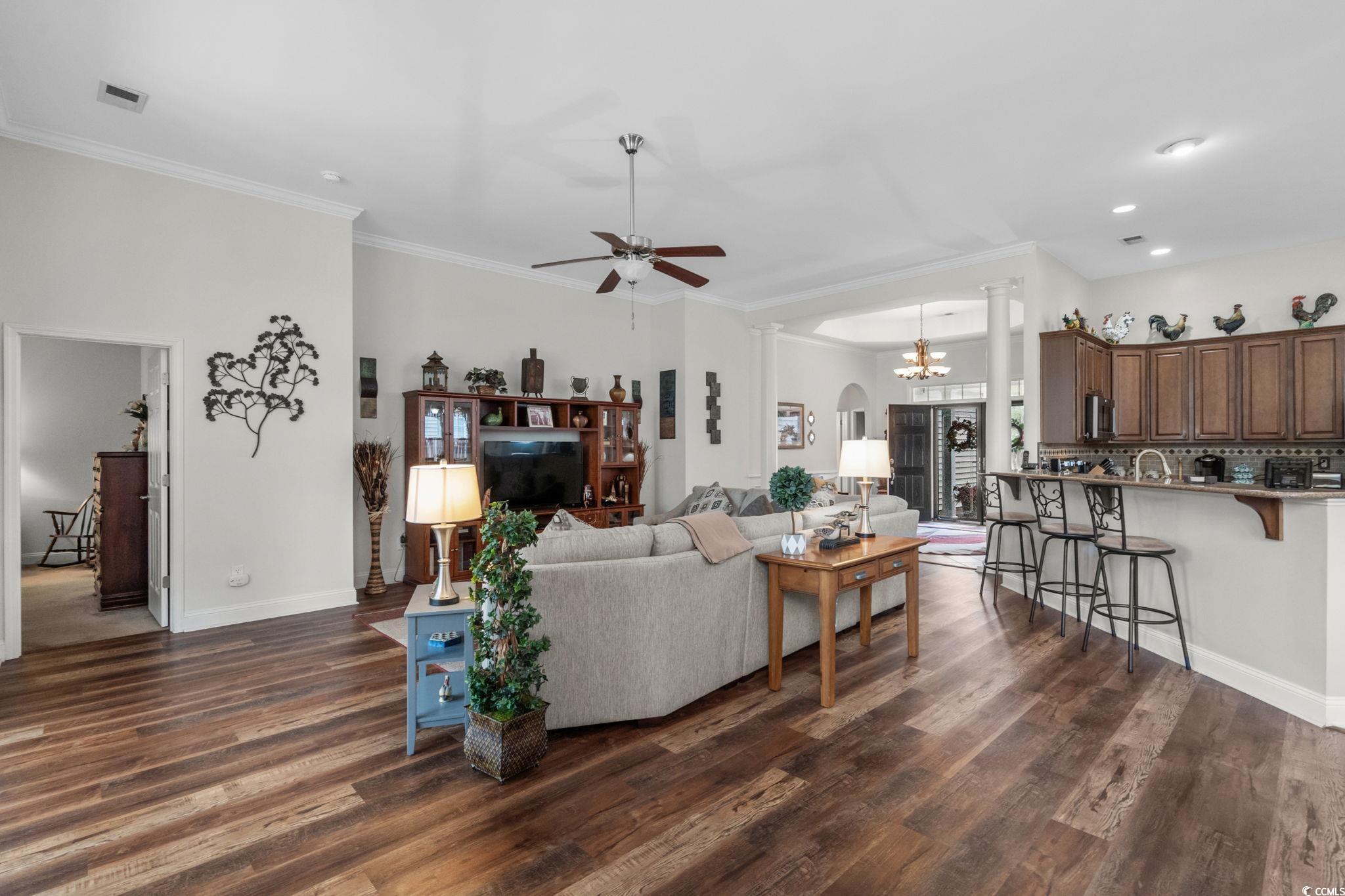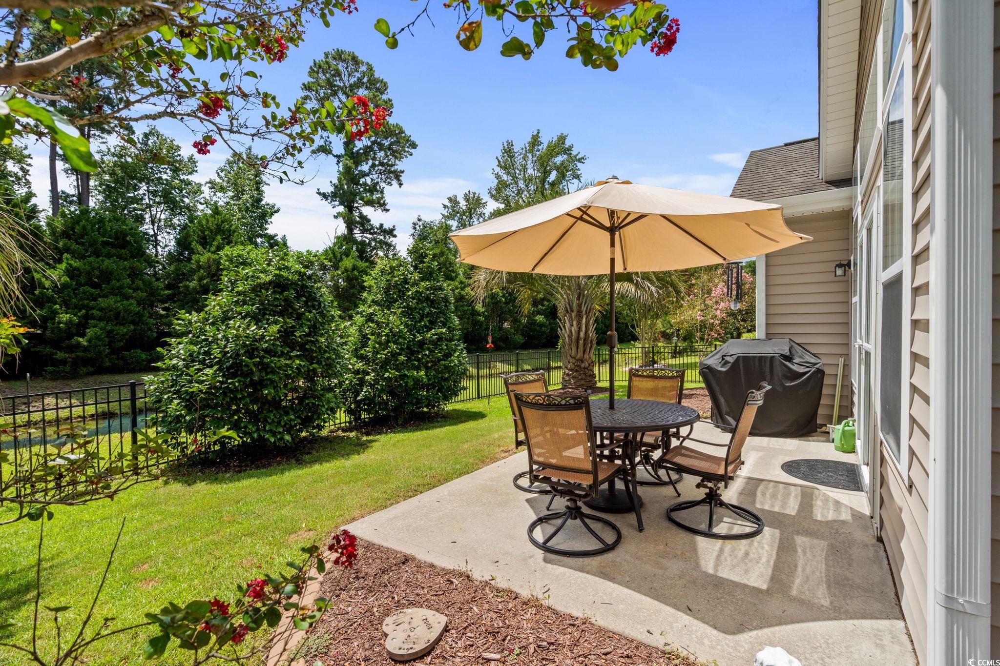 Discover the epitome of refined living in the sought-after 55+ community of Myrtle Trace Grande, just minutes from historic downtown Conway and Myrtle Beach! This elegant Cumberland floor plan features 3 spacious bedrooms, 2.5 baths, and over 2,300 heated square feet, all on a single level with no stairs to climb. Step inside through stunning double doors to an inviting foyer that opens into a bright, expansive living area enhanced by decorative molding and a seamless flow into the chef’s kitchen. Outfitted with quartz countertops, a stylish backsplash, pantry, built-in mail center, breakfast nook, and a more formal dining space, plus a breakfast bar, the kitchen overlooks the family room, making it ideal for entertaining or everyday life. The Carolina room, with double doors, a vaulted ceiling, ceiling fan, and abundant windows, offers a serene space for reading, relaxing, or admiring nature. This room leads to a backyard patio, perfect for grilling, morning coffee, or enjoying the calming water view. The rear yard is fenced and beautifully landscaped, complete with mature plantings and strategic curbscaping. The luxurious primary suite is a true retreat, showcasing a tray ceiling, generous walk-in closet, and a spa-inspired bath featuring a whirlpool tub with tile surround, separate tile shower, and great counter space. Two additional bedrooms, each with a ceiling fan and closet, have nearby access to a full bathroom, while a convenient half bath is available for guests. A well-appointed laundry room, complete with a utility sink, adds practical convenience to the home. Myrtle Trace Grande is a charming neighborhood with homes nestled among mature pines and scenic lakes. Homeowners enjoy access to a clubhouse and outdoor pool. Year-round social events, clubs, and planned outings ensure there is always something engaging happening with new friends nearby. Rest easy knowing you are just a short drive to medical centers, doctors’ offices, pharmacies, banks, post offices, and grocery stores. This home is owned by a SC real estate licensee. HOA information has been provided to the best of our ability. All information should be verified and approved by the buyer. Square footage is approximate and not guaranteed. Buyer is responsible for verification.