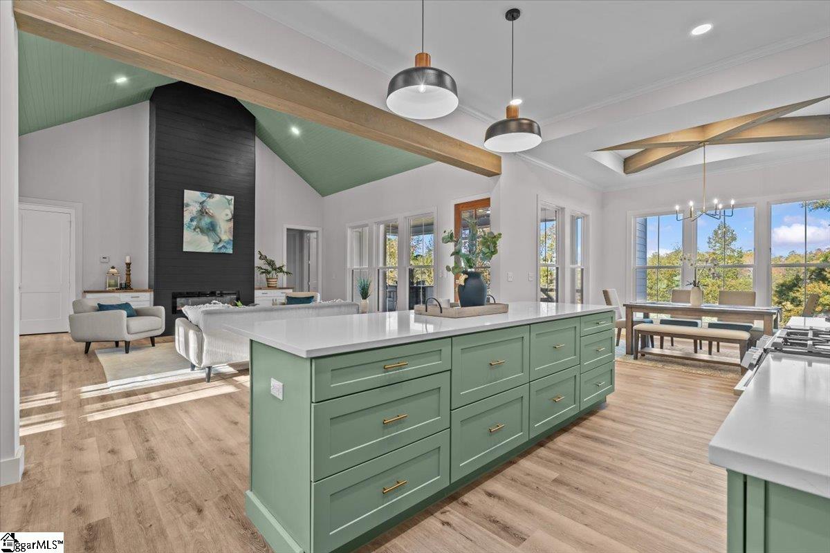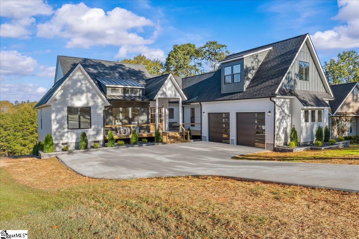 Welcome to modern lake living on Lake Cunningham. This brand-new custom home blends luxury design with peaceful lake views — and it’s already approved for a private dock. Inside, you’ll find soaring ceilings, a bold black shiplap fireplace, and an open floor plan that flows into a stunning kitchen with green cabinetry, quartz countertops, and premium appliances. The spacious primary suite offers tree-lined views, a walk-in closet, and a spa-style bath with gold fixtures and dual vanities. Upstairs, the finished flex space above the garage adds room for guests, recreation, or a home office. Step onto the screened-in back porch with a built-in outdoor kitchen, perfect for entertaining or quiet evenings overlooking the lake. Set on a quiet cul-de-sac just minutes from downtown Greer, this home delivers comfort, craftsmanship, and waterfront living at its best. Dock-approved and move-in ready — 17 Cunningham Point Court invites you to live the lake life.