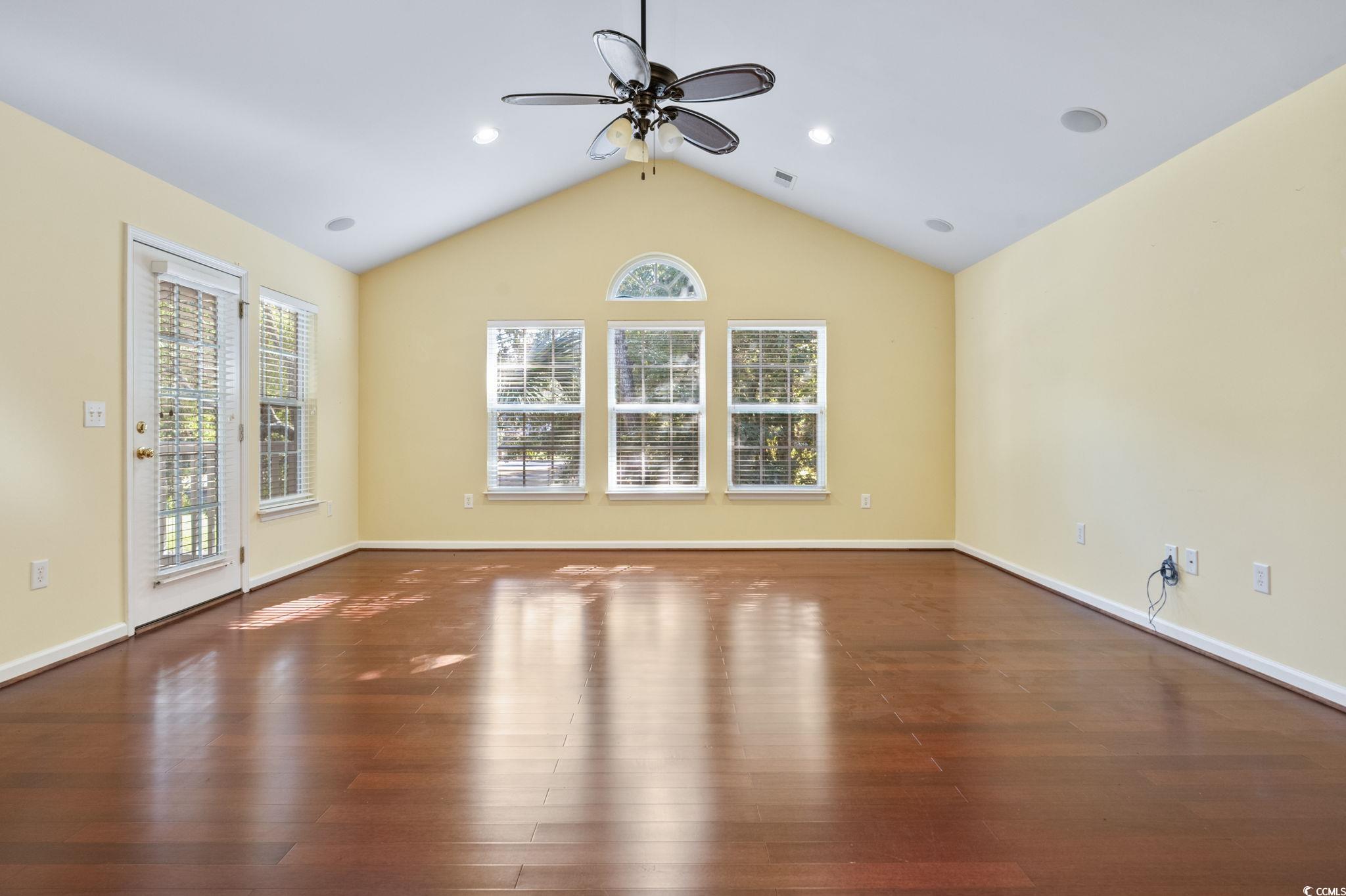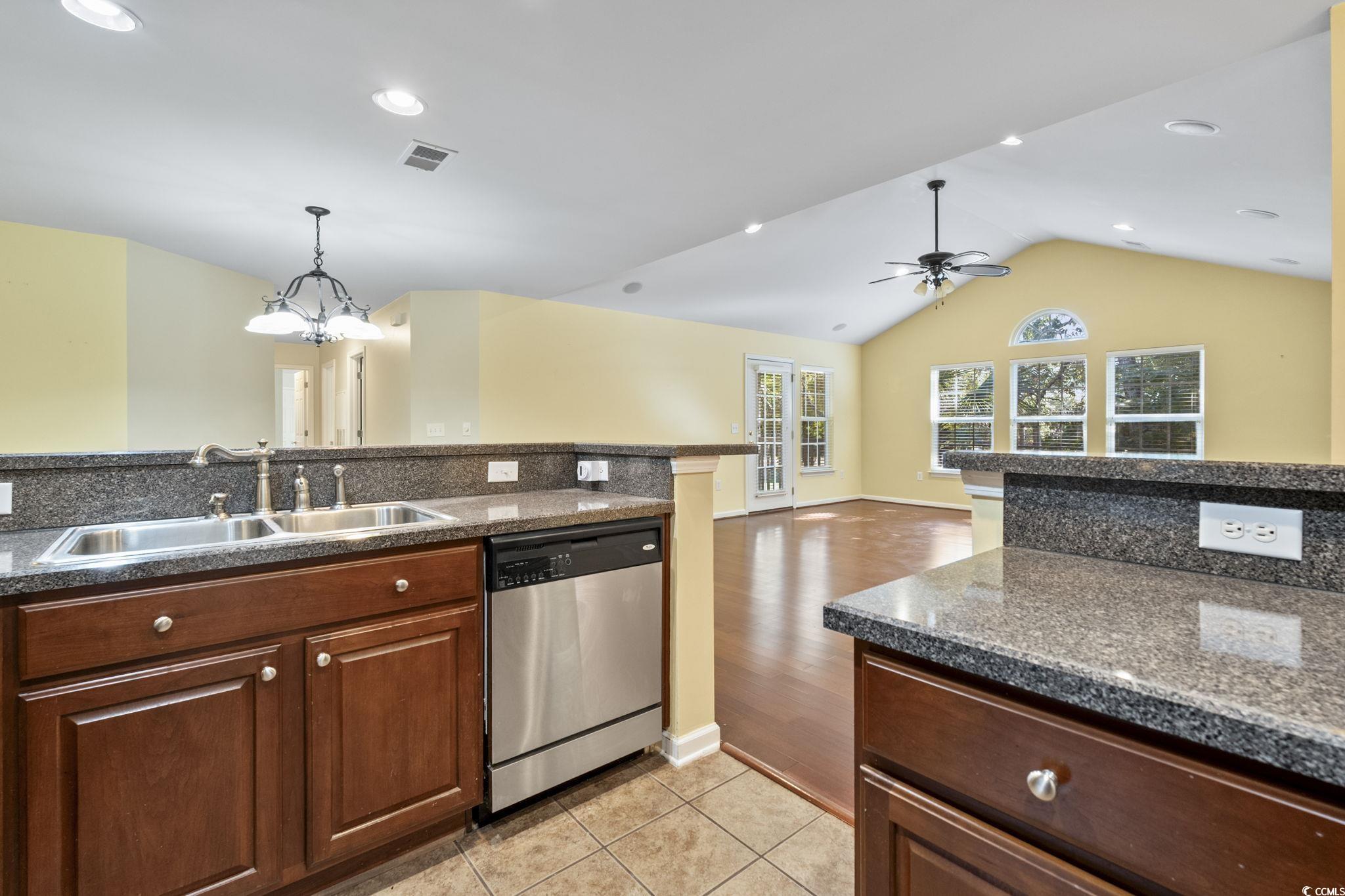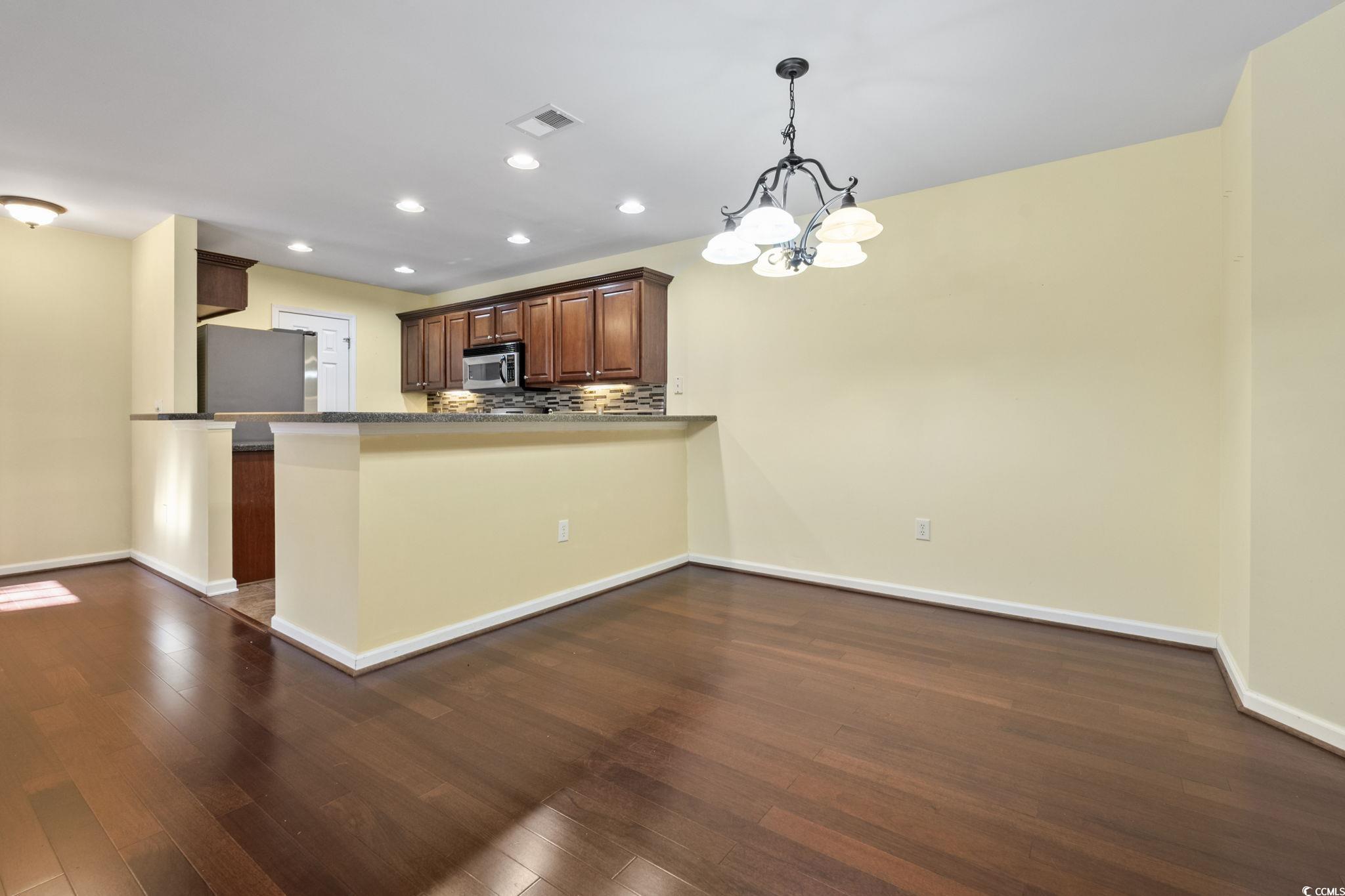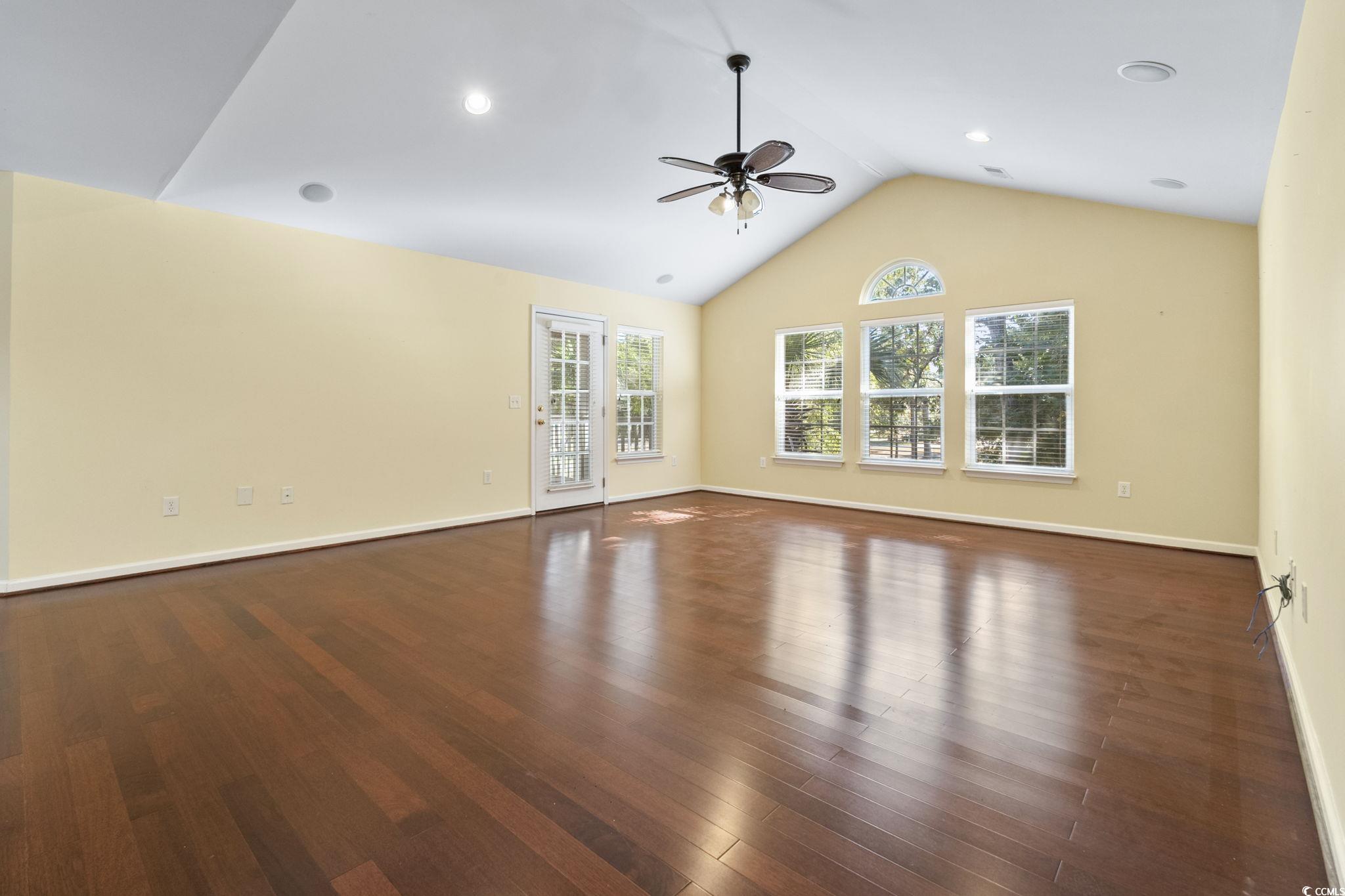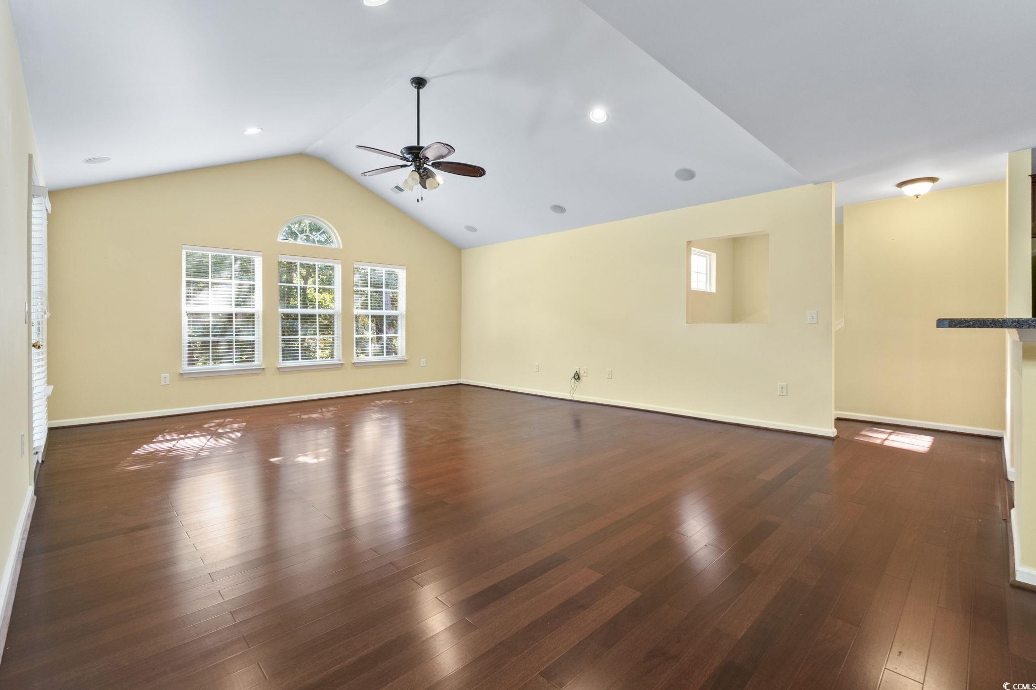 All the space you need, in a community where every day feels like a getaway, with 3 spacious bedrooms, 2 full bathrooms, and soaring ceilings with an abundance of natural light in the living area. The layout is open and functional, designed to maximize comfort and privacy. The spacious living room with vaulted ceilings flows seamlessly into the dining area and kitchen, creating a bright and inviting central gathering space. The kitchen features stainless steel appliances, granite-style counters, tile backsplash, and plenty of cabinetry for storage. The primary suite is tucked away with its own walk-in closet and full bath, while two additional bedrooms and baths provide flexibility for family, guests, or a home office. One bedroom enjoys private access to a screened balcony, perfect for relaxing outdoors with golf course views. Hardwood floors, fresh paint, new carpeting in guest rooms and thoughtful updates throughout make this home truly turnkey. As a resident of the gated Wachesaw East and Winchester community, you'll enjoy an impressive list of amenities including two resort-style pools, tennis and pickleball courts, a well-equipped fitness center, and miles of scenic walking and fitness trails. HOA dues cover exterior maintenance, landscaping, pest control, insurance, garbage removal, and 24/7 gated security - providing both convenience and peace of mind. The location places you minutes from the Murrells Inlet MarshWalk, Huntington Beach State Park, Brookgreen Gardens, a public marina, and Tidelands Hospital. Whether you're searching for a primary residence or a weekend retreat, this property offers a relaxed coastal lifestyle in a premier golf course community where every day feels like a getaway. Measurements are not guaranteed. Buyer is responsible for verifying.