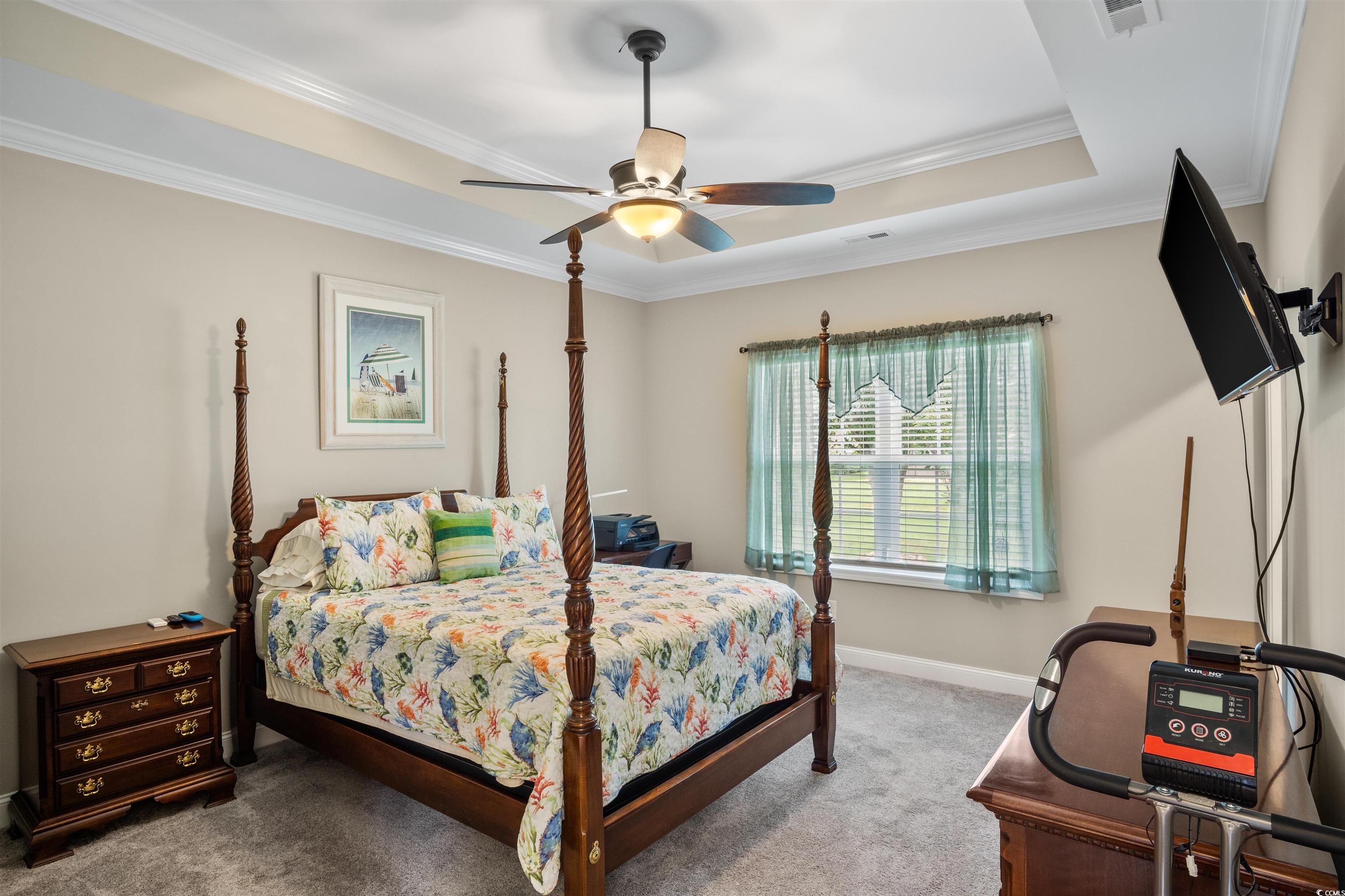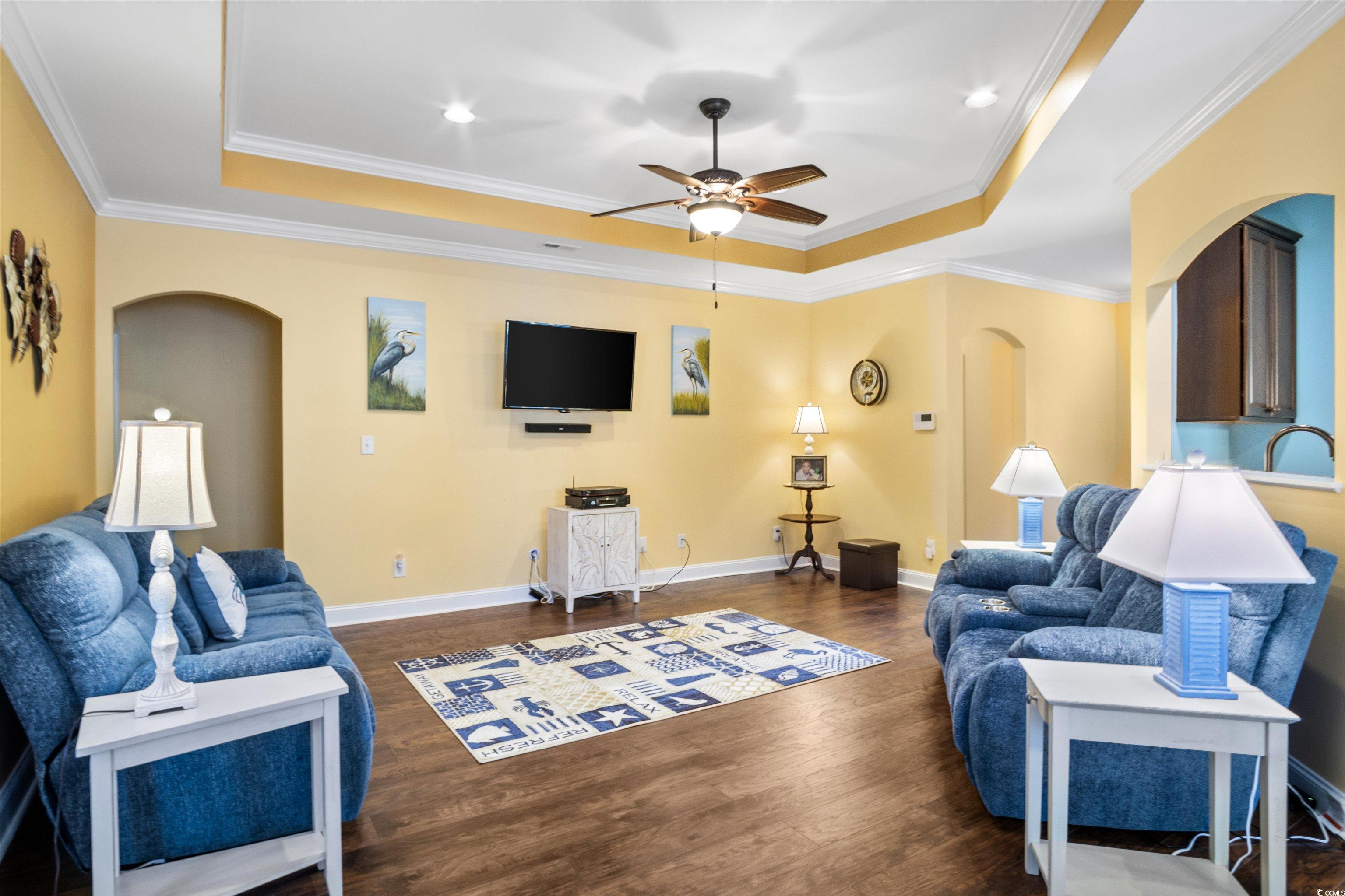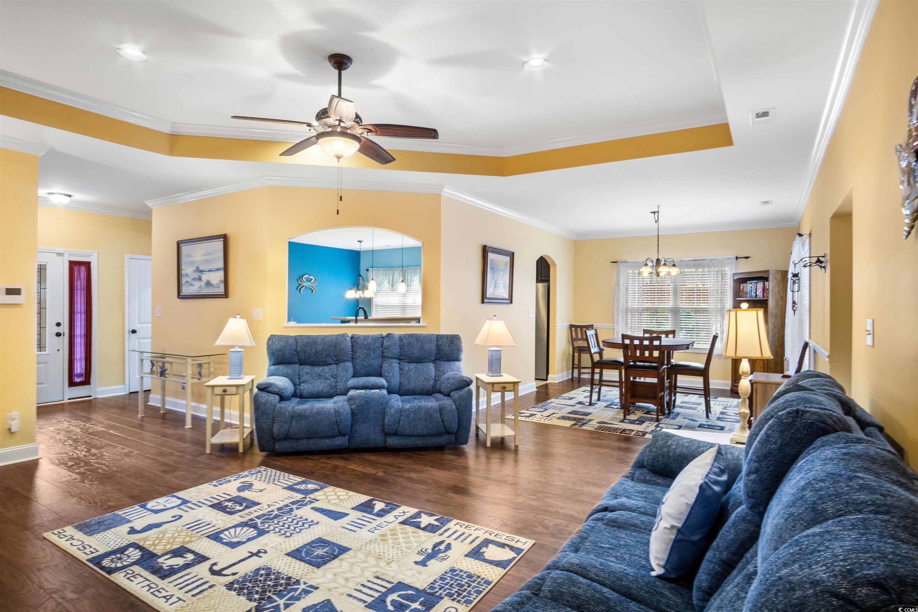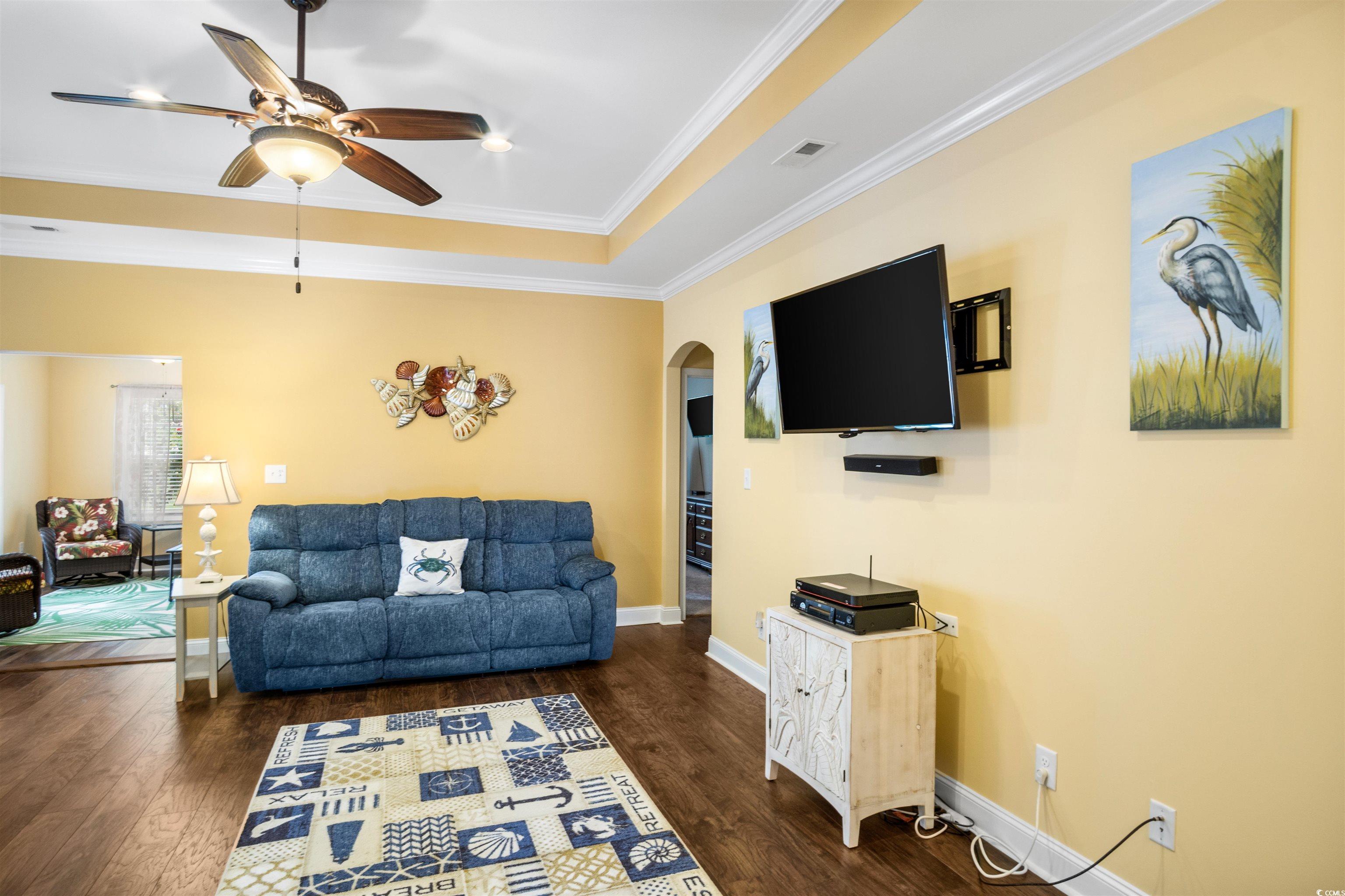 Beautiful brick home in small secluded quiet neighborhood of The Preserve. The home has a fantastic lake view and only a quick 5 minute golf cart ride to the beautiful blue Atlantic Ocean! This 3 bedroom 2 bath split bedroom floorplan is great for all the family and has been meticulously maintained. The kitchen is a wonderful center of the home boasting beautiful quartz counters, large center work island, breakfast room, upgraded cabinets, recessed lighting, chair railing and wood flooring. The island bar is a plus for entertaining guests and family gatherings. The kitchen also has wood blinds, large tile flooring and large pantry for storage. The kitchen opens up into living room so everyone can socialize. The dining room is spacious with wood floors and chair railing that accentuate this home. The living room/family room is beautifully appointed with tray ceiling, wood floors and recessed lighting. Just off the living area is a pocket door that opens up into the newly added lanai for relaxation and conversation. The Master bedroom is its own oasis for privacy with large ensuite including a garden tub, oversize beautifully tiled shower and double vanities. The master walk-in closet has an abundance of custom shelving and storage for hanging all of your clothes, shoes and storage needs. The 2 other bedrooms share a guest bathroom which provides plenty of space for family and friends to quietly enjoy. The laundry room is large with hanging space and a sink for soaking. The garage is oversized with custom privacy screens, workshop area and pull down attic storage. The yard is professionally landscaped with Zoysia grass and mature flowering trees and shrubs. Located at the beginning of Restaurant Row and convenient to all the highlights of Myrtle Beach - Alabama Theater, Carolina Opry, Dublin Winery, Barefoot Landing & Tanger Outlets. Don't miss this opportunity to own a slice of paradise!