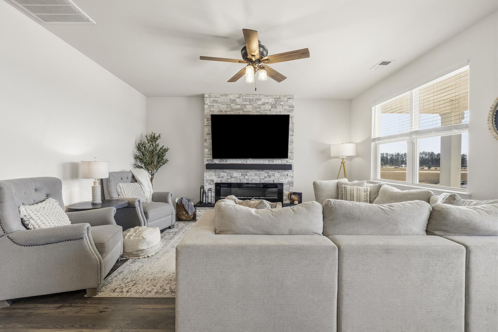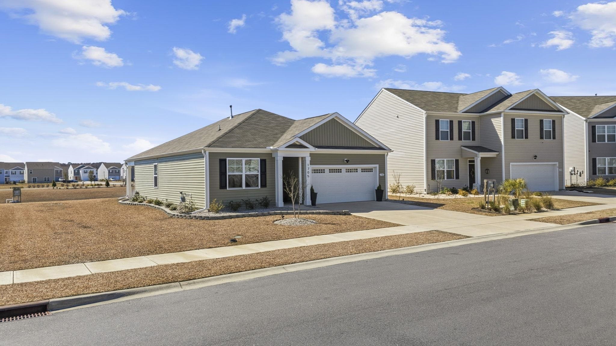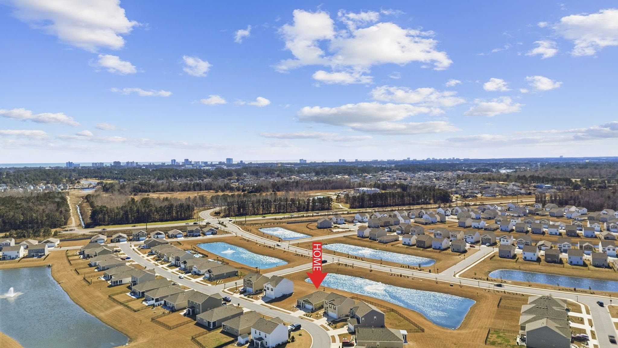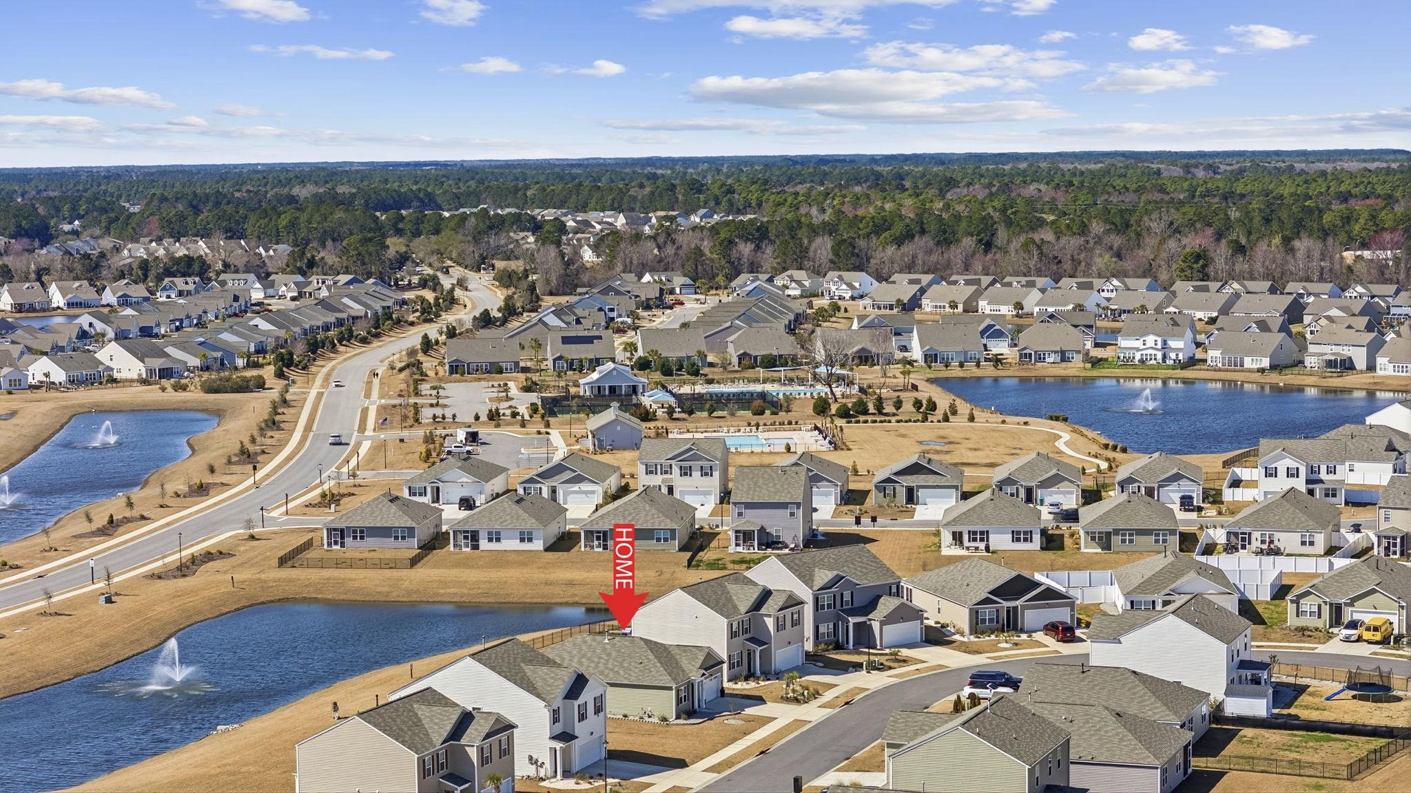 Welcome to this beautifully upgraded 3 bedroom, 2 bath ranch home in the heart of Carolina Forest, located in the Village Oaks community. Situated on a peaceful water lot with a tranquil fountain view and an easement to the left offering additional space and privacy. This popular Aria floor plan offers the perfect combination of modern design, comfort, and thoughtful upgrades. Step inside to an open concept layout featuring 9 foot ceilings and an abundance of windows that flood the home with natural light. The kitchen truly serves as the heart of the home, complete with 36 inch staggered cabinetry, granite countertops, stainless steel appliances, gas cooking, upgraded lighting, and generous prep space. It flows seamlessly into the dining and living areas, creating a warm and inviting space where everyone naturally gathers. This is where memories are made and where you are welcomed home each day. The cozy living area is anchored by a custom electric fireplace, adding warmth and charm. Just off the dining room, the covered rear porch opens to an extended patio overlooking the water, offering peaceful views and effortless indoor-outdoor entertaining. The split bedroom layout provides privacy for the spacious primary suite, while two additional bedrooms offer flexibility for family, guests, or a home office. The secondary bath features a glass shower door for a clean, elevated finish. Additional upgrades include a custom garage door with windows for enhanced curb appeal, upgraded stone landscaping, gutters, a sprinkler system, security system, tankless hot water heater, and an industry leading smart home technology package that allows you to monitor and control your home from anywhere. Located in the center of Carolina Forest, you are just minutes from top rated schools, shopping, dining, and the beach. This home offers not only modern features but a cozy, welcoming layout that has truly been loved and thoughtfully enhanced.
