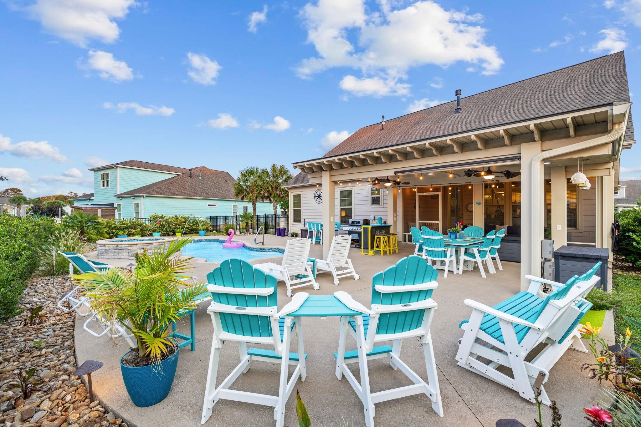 Look no further, heated salt water pool, golf cart ride to the beach, east of 17 in a gated community! You could be taking a relaxing swim in your own private pool this spring. Envision your perfect home at the beach, step inside 1715 Lake Egret Dr, a beautifully designed coastal chic 3-bedroom, 3-bathroom home with a heated saltwater pool & spa, located in the highly sought-after gated community of Seabrook Plantation in North Myrtle Beach, just a short golf cart ride to the beautiful beaches of Cherry Grove. This home offers an ideal blend of luxury, space, and coastal convenience. Step inside to discover an open concept that can be used as a formal living/dining area or flex room, an abundance of living & storage space featuring a generously sized family room with 2-story vaulted ceilings, custom fireplace, and details throughout. The modern kitchen is a chef's dream with granite countertops, stainless steel appliances, customized cabinetry with rollout storage, and a seamless flow into the main living areas-perfect for entertaining. The first-floor master suite is a true retreat with a large walk-in closet, and a spa-inspired bathroom with tile shower. A second bedroom and full bathroom are conveniently located just off the kitchen, offering comfort and privacy for guests or home office space. Upstairs, you'll find a generously sized loft area that leads to a third bedroom and another private bath, ideal for a guest suite, as well as two walk-in attic storage rooms. But the real showstopper is the outdoor living space. Enjoy year-round relaxation on the screened porch and pergola covered patio-complete with twin ceiling breeze fans-that overlook your private oasis. The fenced backyard boasts a custom heated saltwater pool and spa with water features, perfect for both quiet mornings and festive gatherings. Surrounding the custom pool is immaculate professionally landscaped plantings & hardscape. Imagine relaxing on a warm summer evening by the pool that features built-in lighting for nighttime ambiance. In addition to the outdoor living area, the 30ft extended garage has been outfitted with a mini-split to provide additional entertaining space, including a billiards table and 70" TV, both will convey with the home. Seabrook Plantation offers residents exclusive access to a community pool, RV/boat storage, and proximity to shopping, dining, golf, and, of course, the beach! This home is not in a flood zone and does not require flood insurance. Don't miss the opportunity to own this exceptional home in one of North Myrtle Beach's most desirable communities. Schedule your private tour today and ask about the items and furnishings that will convey with the property! Be sure to watch the video tour.