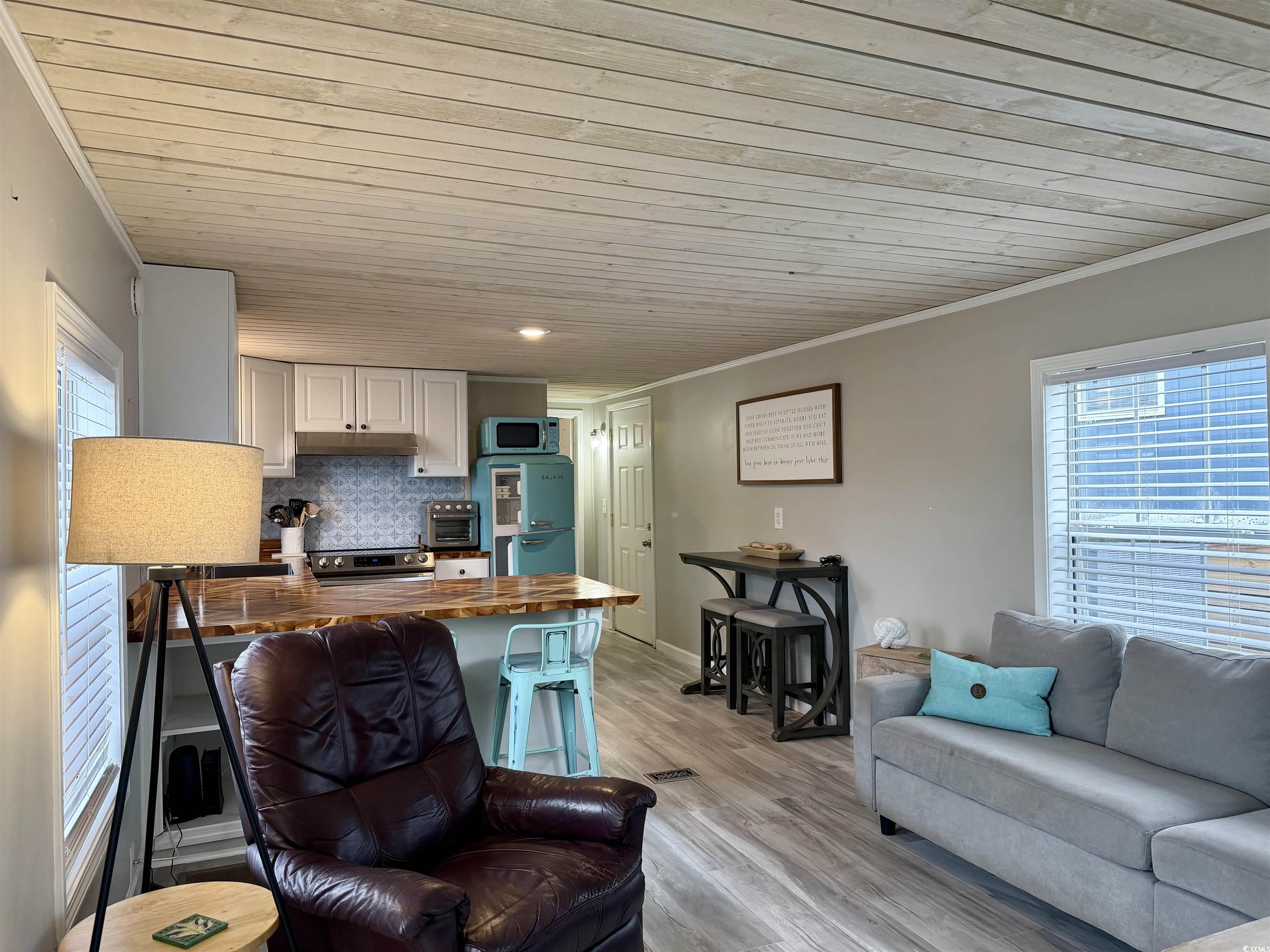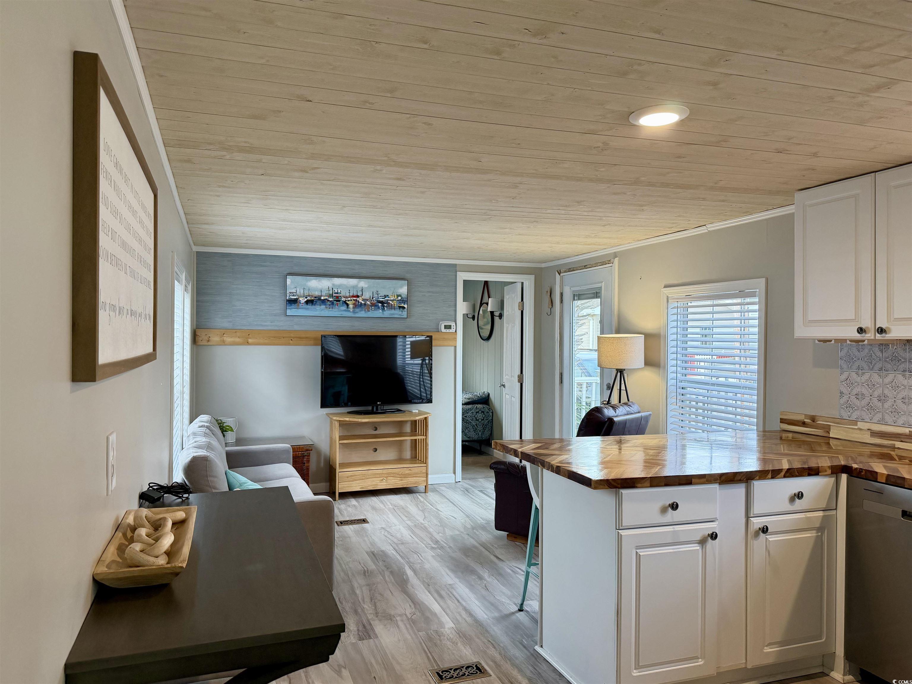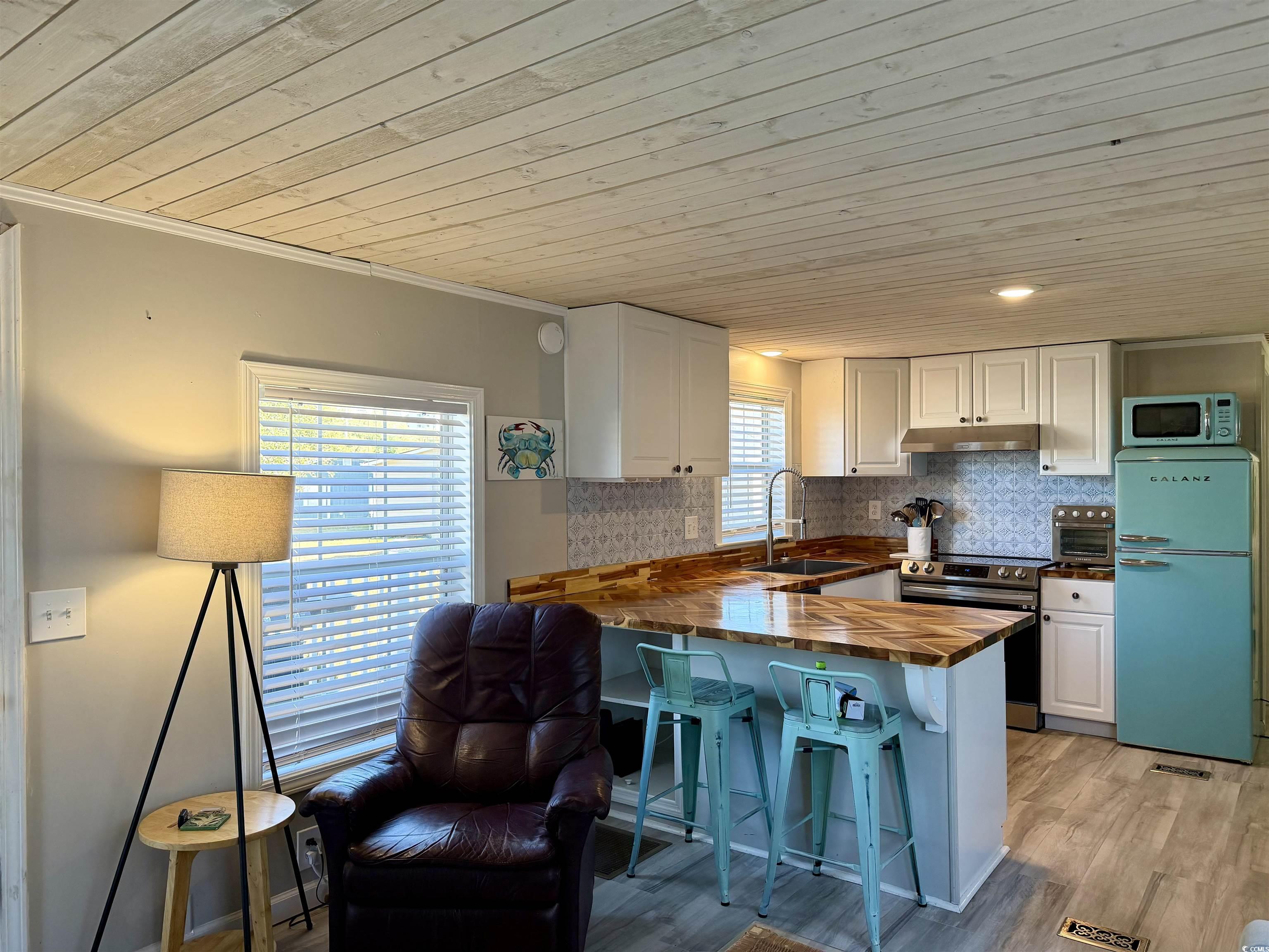Perfect beach getaway, located in the gated golf cart community of Oceanside Village just east of 17. This open concept home features 2 bedrooms, and 1 bath. Updates include shiplap ceilings, butcherblock countertops, 2025 HVAC, spray foam underside for enhanced insulation, 2025 electrical panel, and more. Oceanside Village offers an array of amenities, including private beach front parking, indoor & outdoor pools, kids splash pad, bark park, tennis, pickle ball and so much more.