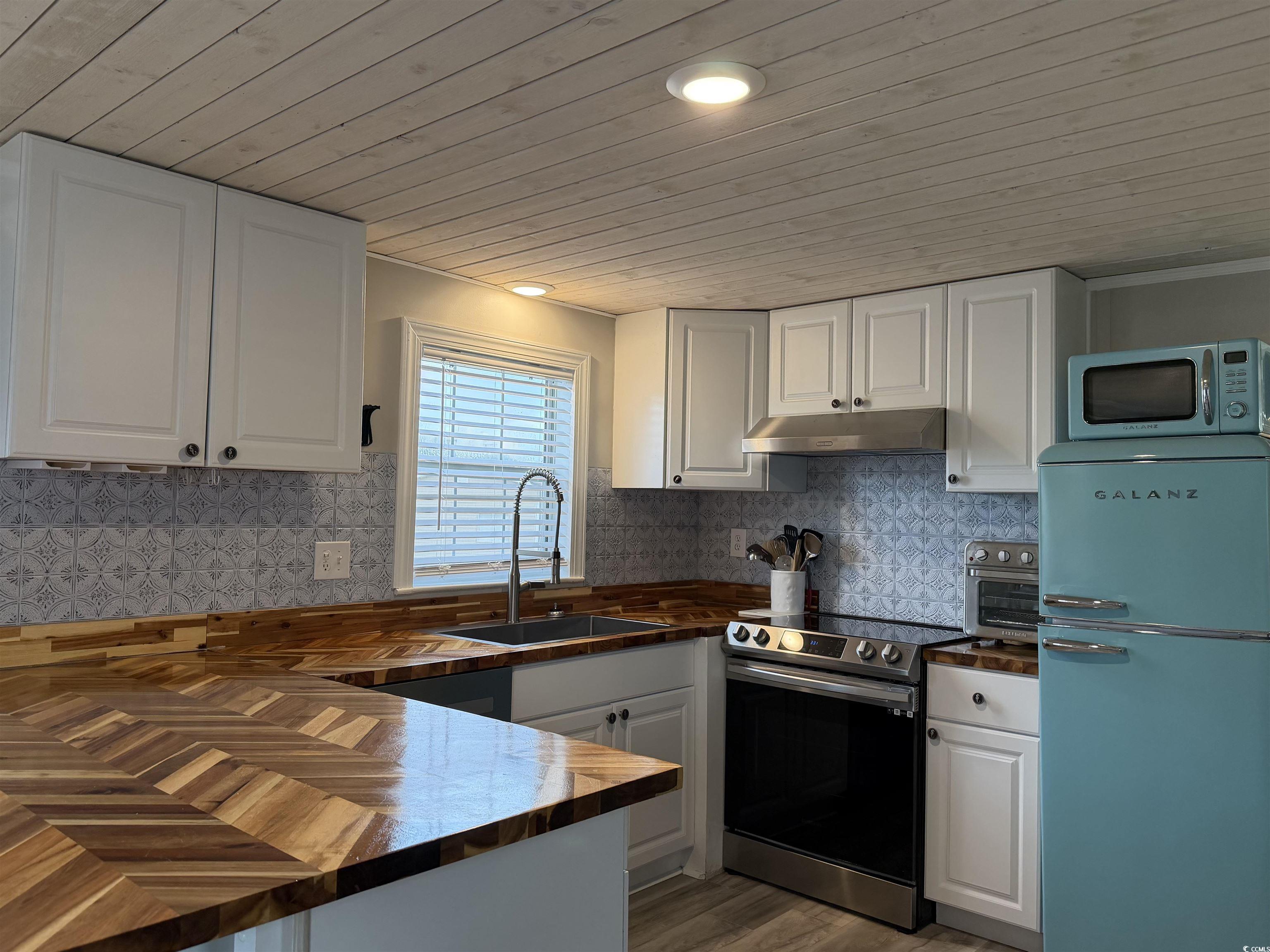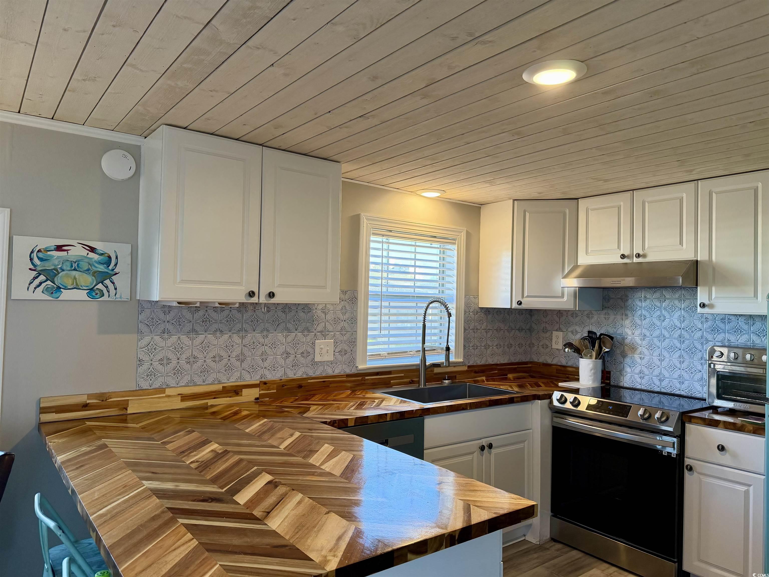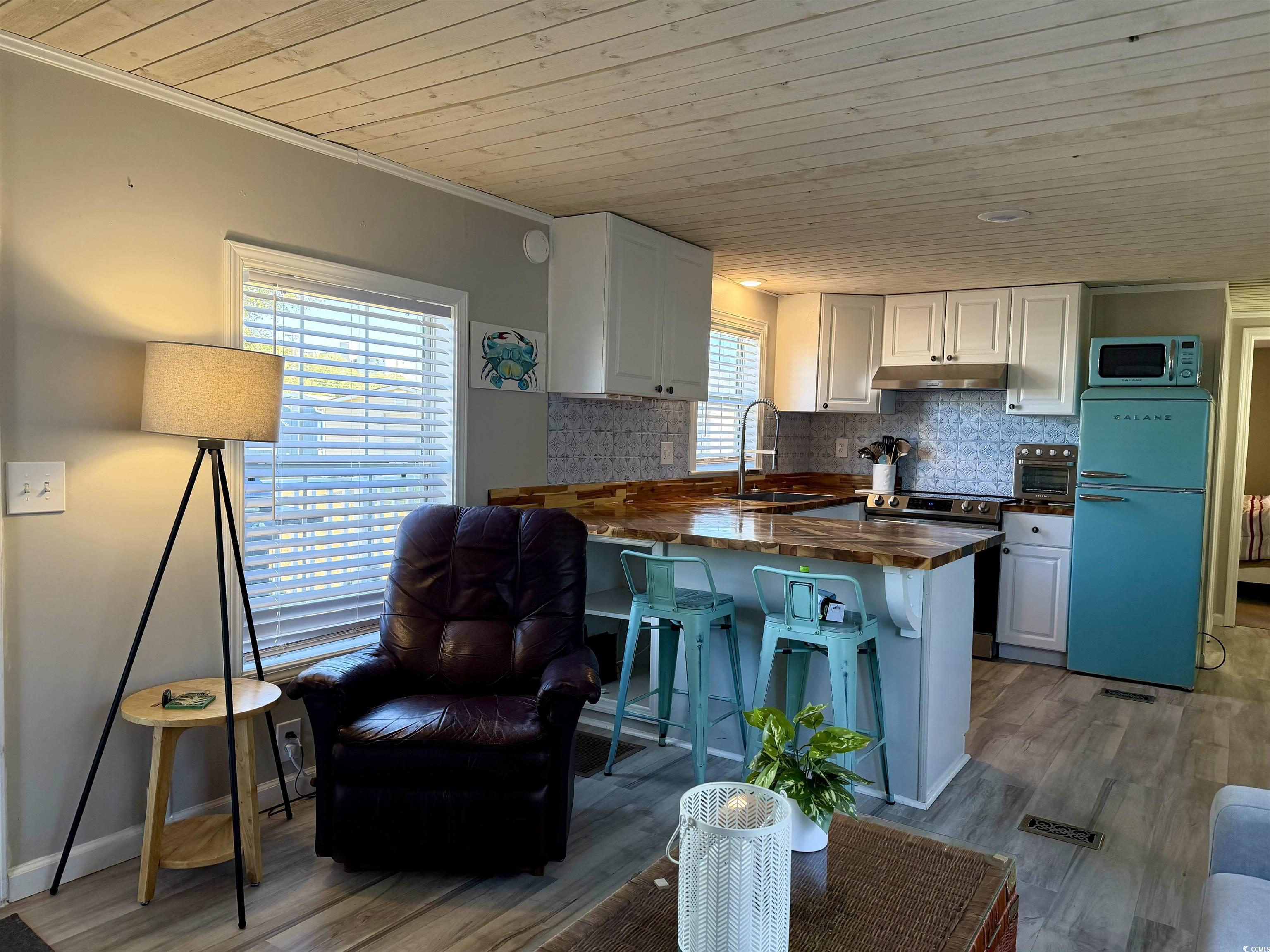 Perfect beach getaway, located in the gated golf cart community of Oceanside Village just east of 17. This open concept home features 2 bedrooms, and 1 bath. Updates include shiplap ceilings, butcherblock countertops, 2025 HVAC, spray foam underside for enhanced insulation, 2025 electrical panel, and more. Oceanside Village offers an array of amenities, including private beach front parking, indoor & outdoor pools, kids splash pad, bark park, tennis, pickle ball and so much more.