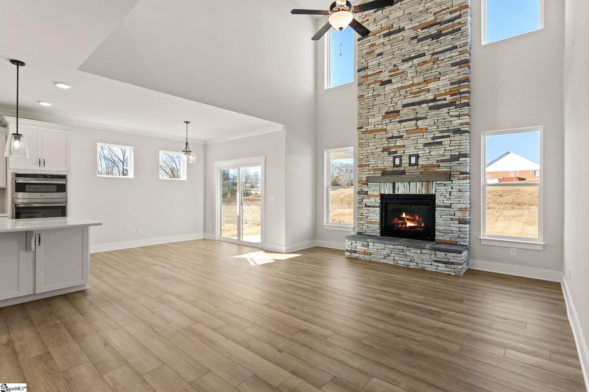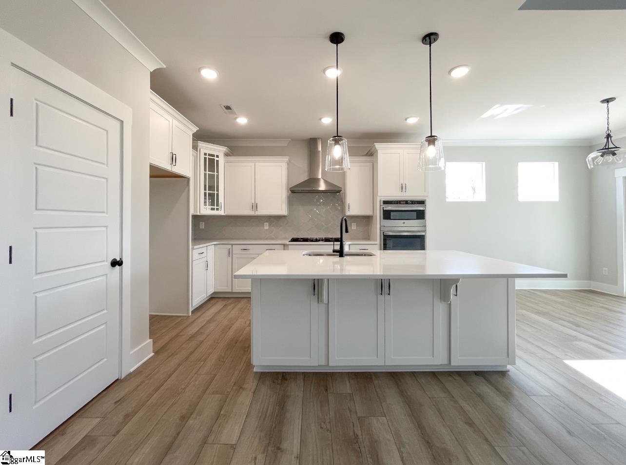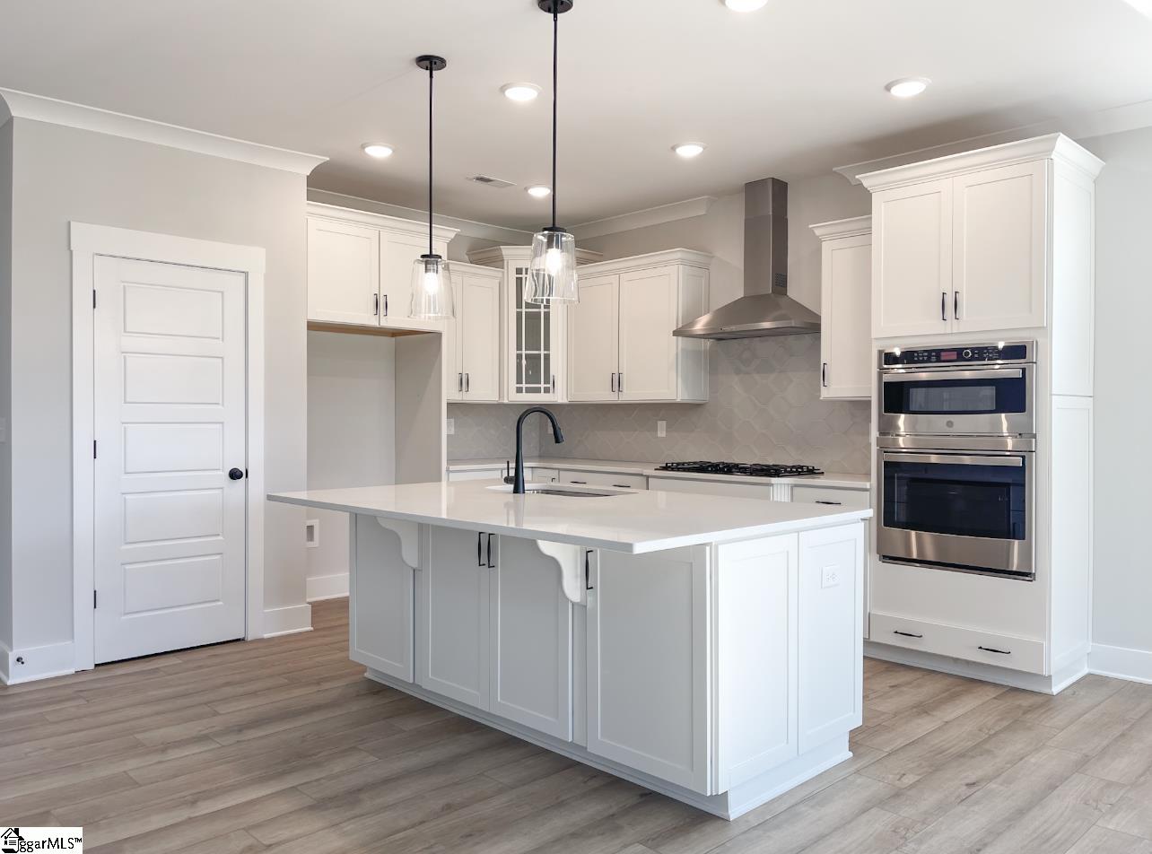 New construction. 4 bedrooms, 2.5 bathrooms, and a 2-car garage. The main level includes a foyer with upgraded trim and a home office with French doors. An open-concept kitchen, dining area, and two-story family room are located at the back of the home. The designer kitchen features a built-in microwave/oven combination, gas cooktop, stainless steel range hood and dishwasher, quartz countertops, tile backsplash, LED lighting, and pendant fixtures. The family room includes a gas-log fireplace. The primary suite is located on the main level and includes a tiled walk-in shower, dual sinks, and a large walk-in closet. All bathrooms feature upgraded cabinetry, lighting, and plumbing fixtures. The second floor includes a loft, three secondary bedrooms, and a full hall bath. Additional features include a structured wiring package, built-in pest control system, enhanced vinyl plank flooring, and a finished garage with drywall, paint, lighting, and electrical outlets. Community amenities include two pickleball courts.