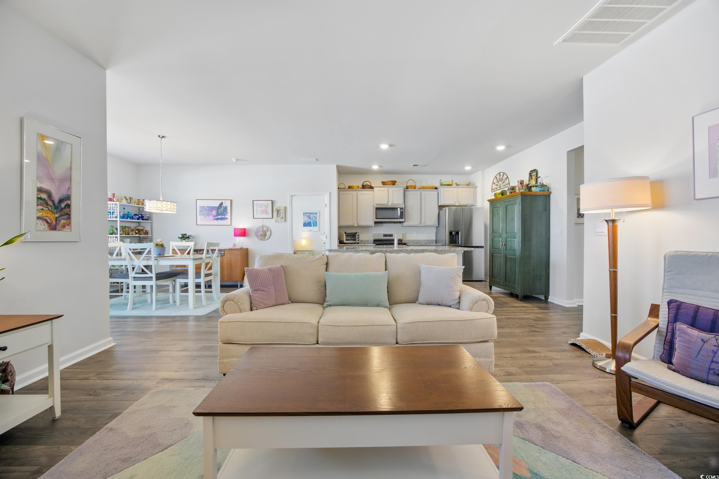 Welcome to 1723 Perthshire Loop in the sought-after Village Oaks community of Myrtle Beach! This beautifully designed Aria floor plan offers the perfect blend of modern style, everyday functionality, and low-maintenance living — all in a prime location just minutes from International Drive, Highway 31, and Highway 22. All the essentials that new homeowners typically add, have already been taken care of (Window coverings, gutters, remote ceiling lights with fans in the bedrooms and living room, 6 foot privacy fence, screened porch, and extended outdoor patio). Step inside to discover an open-concept layout filled with natural light and 9-foot ceilings that enhance the spacious feel. The kitchen features 36" staggered cabinetry, sleek granite countertops, stainless steel appliances, and a large breakfast bar overlooking the living and dining areas — perfect for entertaining or relaxing at home. The split -bedroom floor plan ensures privacy, with a spacious owner’s suite tucked away in the back of the home, complete with a walk-in closet and en-suite bath. Two additional bedrooms and a full bath provide flexible space for guests, family, or a home office. Enjoy outdoor living year-round on the covered screen rear porch with extened patio for backyard BBQ’s— ideal for morning coffee or evening gatherings. Additional features include gas cooking, a tankless water heater, and an industry-leading smart home package, allowing you to control lights, locks, and more from your phone or tablet and gutters. Village Oaks offers a convenient coastal lifestyle with low-maintenance homes and quick access to dining, shopping, golf, and the beach.