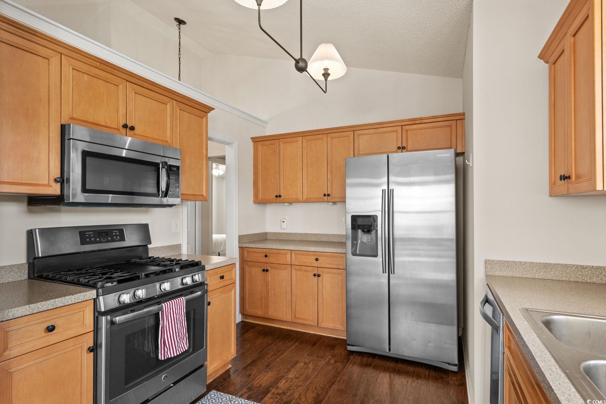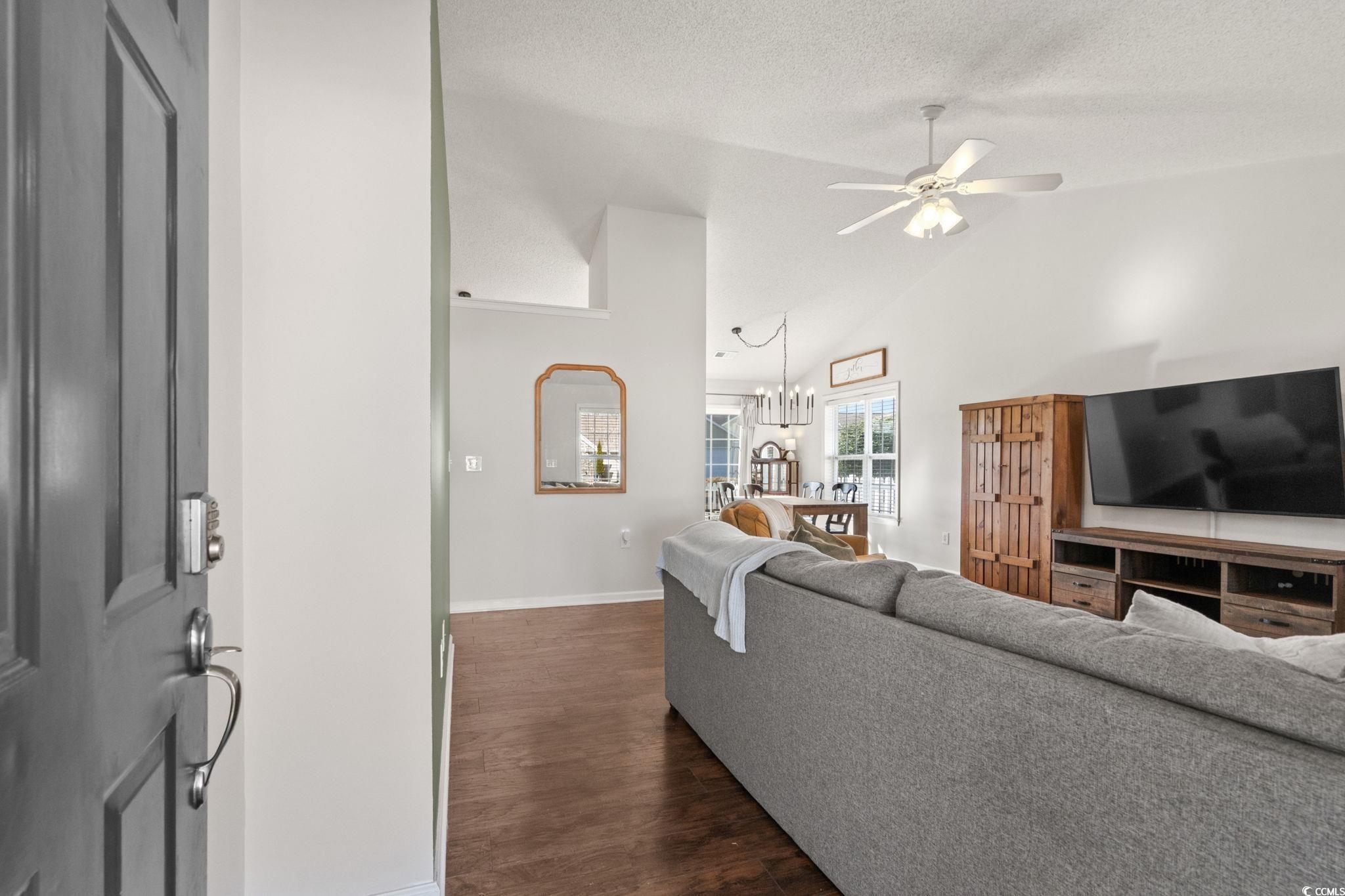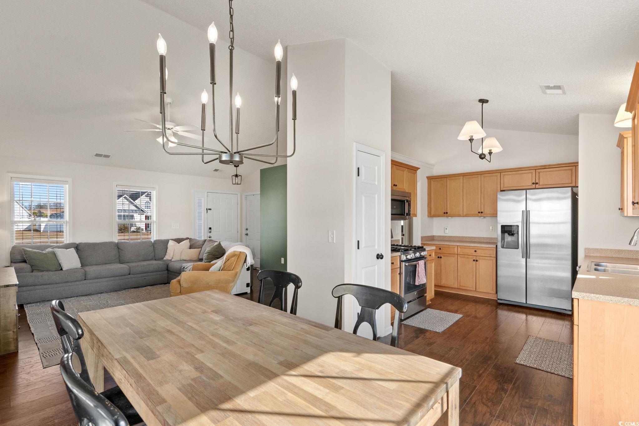 Welcome to this beautifully updated 3-bedroom, 2-bath home located in the highly sought-after Hideaway community of Myrtle Beach. This inviting open-concept floor plan blends modern upgrades with comfortable living and includes new laminate flooring, new light fixtures and a brand-new water heater. The home features vaulted ceilings and a spacious living and dining area that opens to the backyard—perfect for entertaining or relaxing. The kitchen offers ample cabinet and counter space along with stainless steel appliances, making it both functional and welcoming. The master bathroom has been upgraded with a custom tile shower and glass enclosure, offering a fresh, modern feel. Two additional bedrooms and a full guest bath provide flexibility for family, guests, or a home office. Additional highlights include a fenced backyard, irrigation system, two-car attached garage, gas range, freshly painted rooms and updates throughout the home. This move-in-ready home offers comfort, amazing community and proximity to all that Myrtle Beach has to offer.