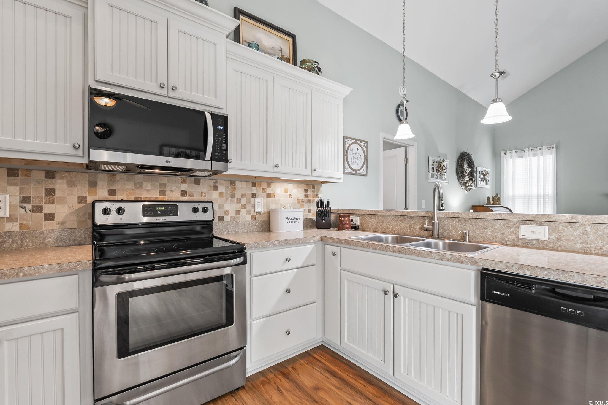 Welcome to this well-maintained 3 bedroom, 2 bathroom single-story home in the Silver Creek community of Socastee. Built in 2015, this home offers approximately 1,299 heated square feet and features a bright open floor plan with vaulted ceilings, creating a spacious and inviting feel. Inside, you'll find laminate and LVP flooring throughout (no carpet), a cozy gas fireplace, and a kitchen designed with soft close cabinets, tile backsplash, and stainless steel appliances. The split bedroom layout provides privacy, as well. The exterior offers a fenced back yard with an outdoor storage shed, perfect for extra storage or hobbies. Silver Creek residents enjoy access to a community pool and low monthly HOA Fees. Conveniently located near the airport, Hwy 31, shopping, dining, and the beach, this home combines comfort and convenience. Move-in ready, well-maintained, and priced to sell!