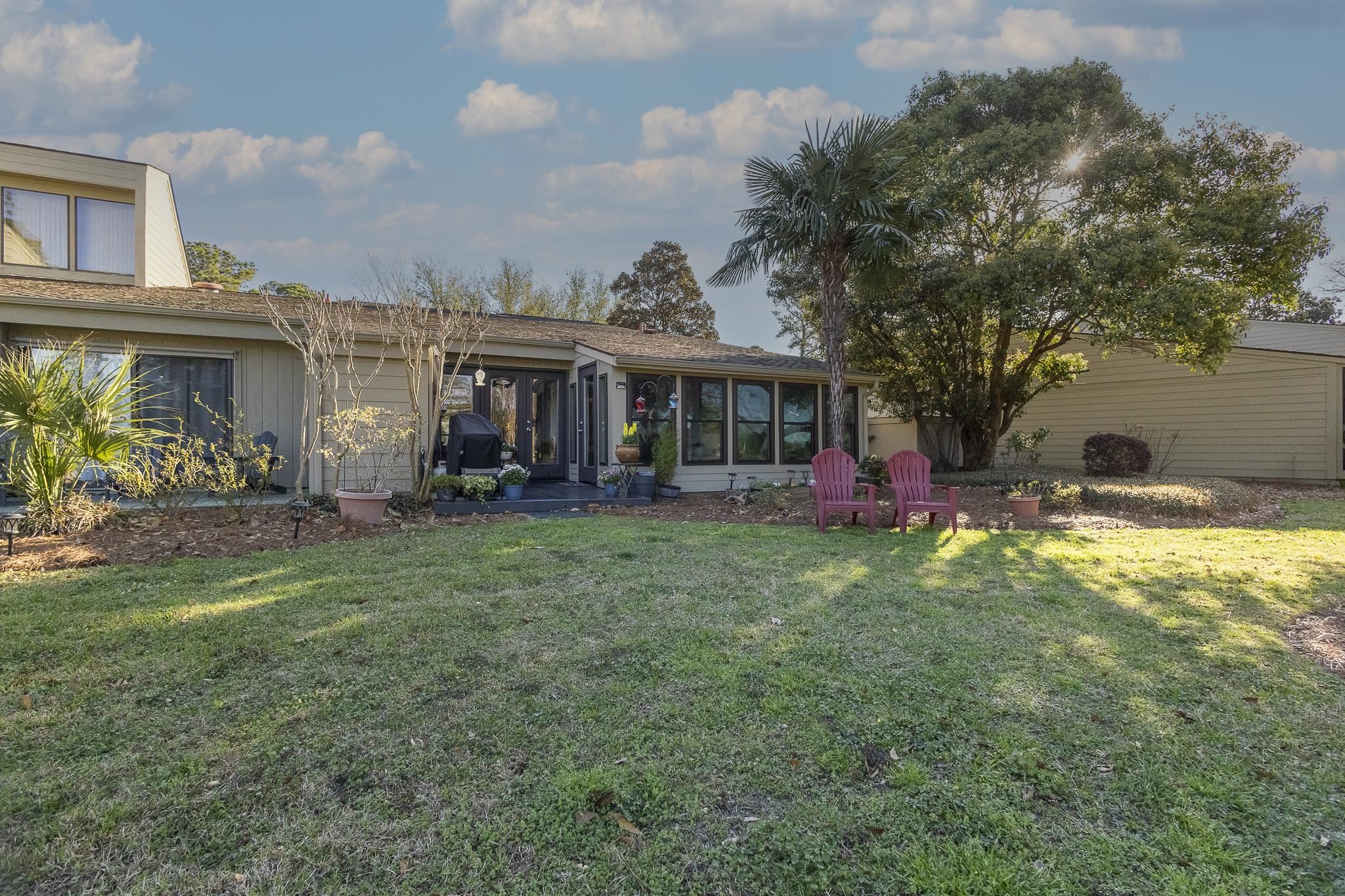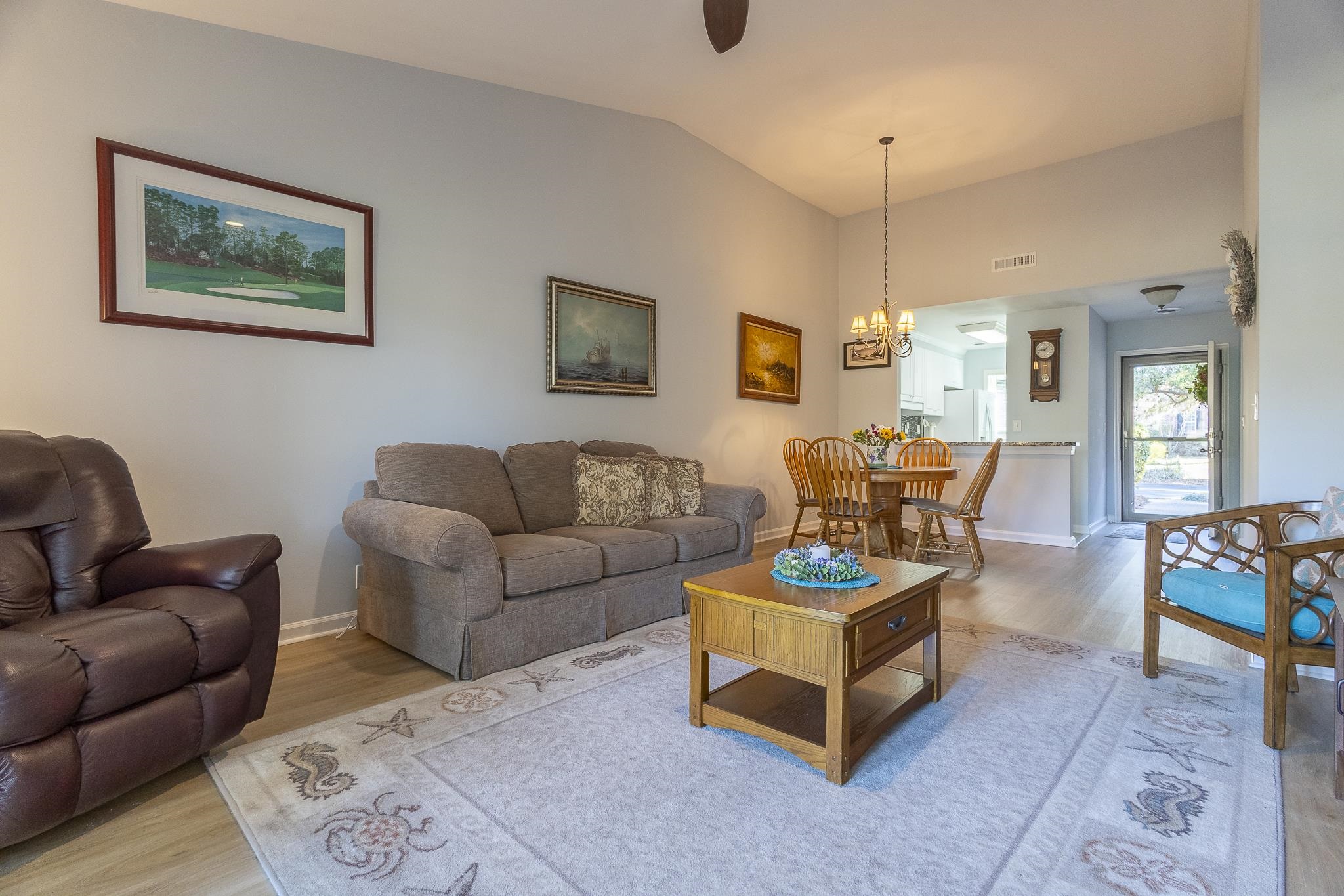 Perfectly positioned along the 9th fairway of River Club, this beautifully refreshed one-level golf villa offers a rare combination of comfort, privacy, and scenic golf course views. As a desirable end-unit, the home enjoys additional natural light and an open, airy feel enhanced by vaulted ceilings and a thoughtful floor plan. Recent updates include upgraded luxury vinyl plank flooring throughout and a custom tiled shower in the primary bath. One of the most distinctive features of this villa is the heated and cooled sunroom addition, providing extra living space with peaceful views of the fairway. This space also features additional exterior access doors unique to this unit, a rare enhancement not found in other villas within the community. The home also offers excellent storage, including a floored attic space for added convenience. Located in the sought-after River Club community, this villa places you just minutes from the beaches of Litchfield and Pawleys Island, renowned golf courses, dining, shopping, and all the charm of the South Strand. Also note that PRIVATE BEACH ACCESS through Litchfield by the sea is included with this community