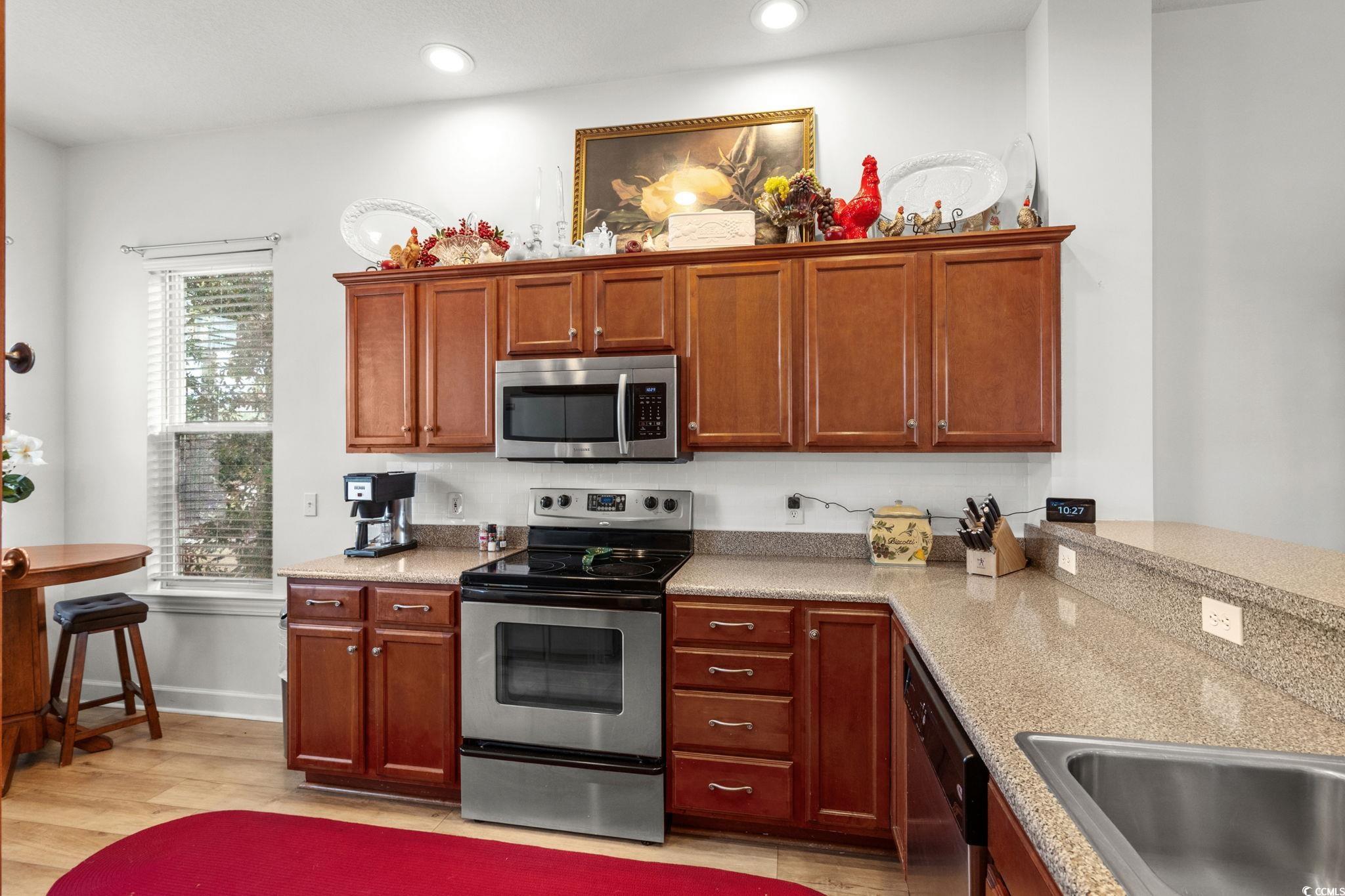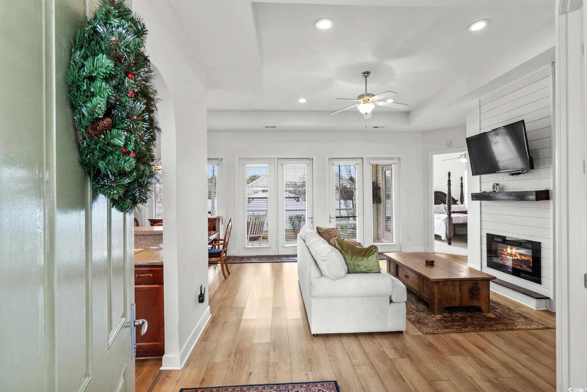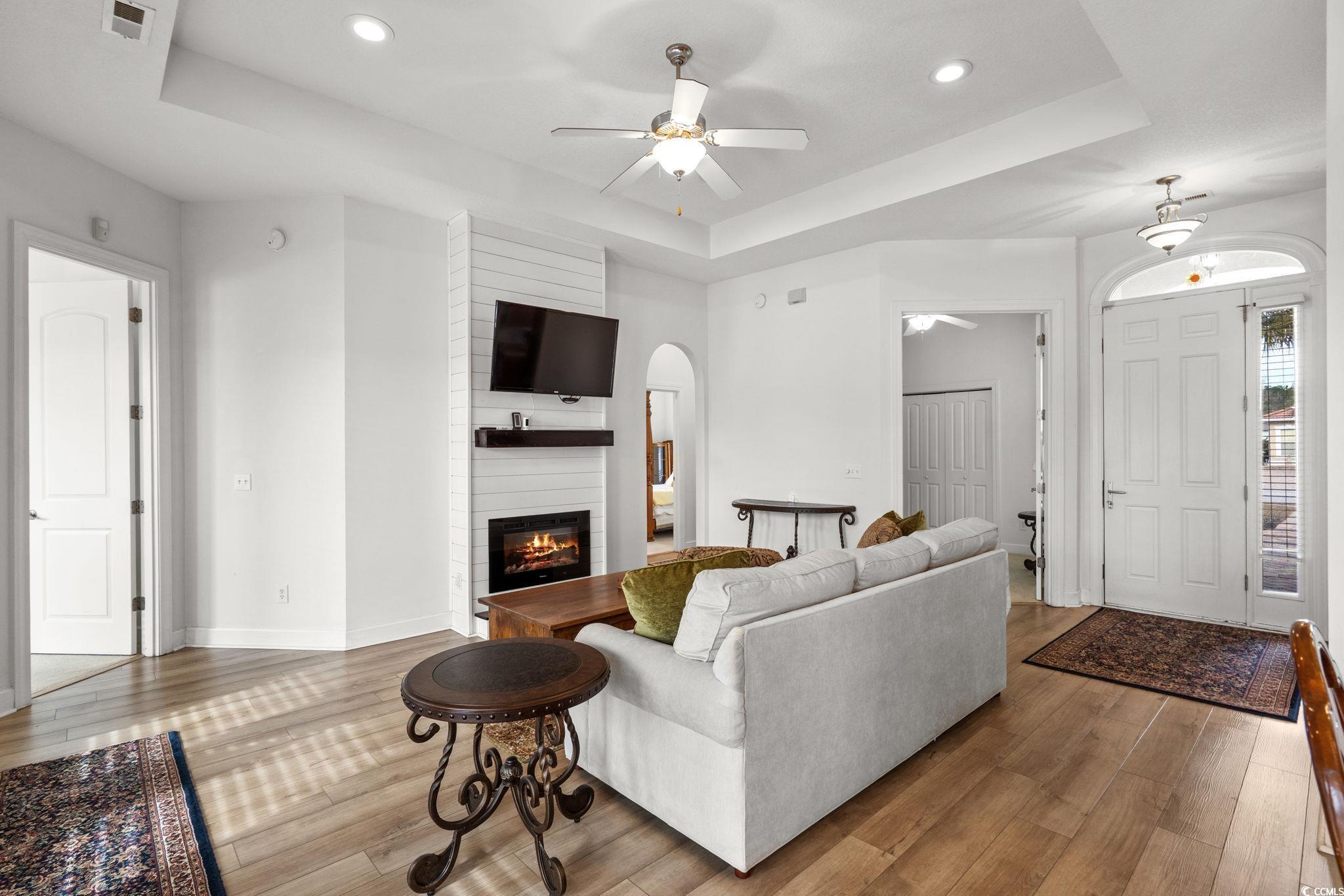 Welcome to this charming Mediterranean-style home located in the desirable North Village community of Little River. With its elegant stucco exterior, tile roof, and palm-lined landscaping, this single-level residence offers the perfect blend of coastal living and modern comfort. Step inside to a bright and beautifully maintained interior featuring an open floor plan, updated flooring, and abundant natural light. The spacious living room showcases a tray ceiling, recessed lighting, and a cozy shiplap fireplace—creating an inviting space for relaxing or entertaining. A wall of windows and French doors leads to the screened-in porch, allowing for effortless indoor-outdoor living. The galley style kitchen is thoughtfully designed with warm cabinetry, stainless steel appliances, a breakfast bar, and plenty of counter space for cooking and hosting. The adjacent dining area is ideal for gatherings and flows seamlessly into the main living space. The primary bedroom provides a peaceful retreat with generous space and natural light, while the primary bath includes a double-sink vanity and walk-in shower. Additional bedrooms offer versatility for guests, a home office, or hobbies. One of the home’s standout features is the expansive screened-in porch overlooking the fenced backyard—perfect for morning coffee, evening breezes, or simply enjoying the quiet charm of the neighborhood. The yard offers plenty of green space for play, pets, gardening, or future enhancements. A paver driveway, 2-car garage, and well-maintained landscaping complete the exterior, enhancing both curb appeal and functionality. North Village is a well-established community conveniently located near shopping, dining, healthcare, golf courses, and the Little River waterfront. You’re just a short drive to North Myrtle Beach’s beautiful coastline, yet tucked away in a peaceful residential setting. If you’re seeking a thoughtfully cared-for home with timeless curb appeal and a comfortable layout this is a must-see. Buyer is responsible for veification.