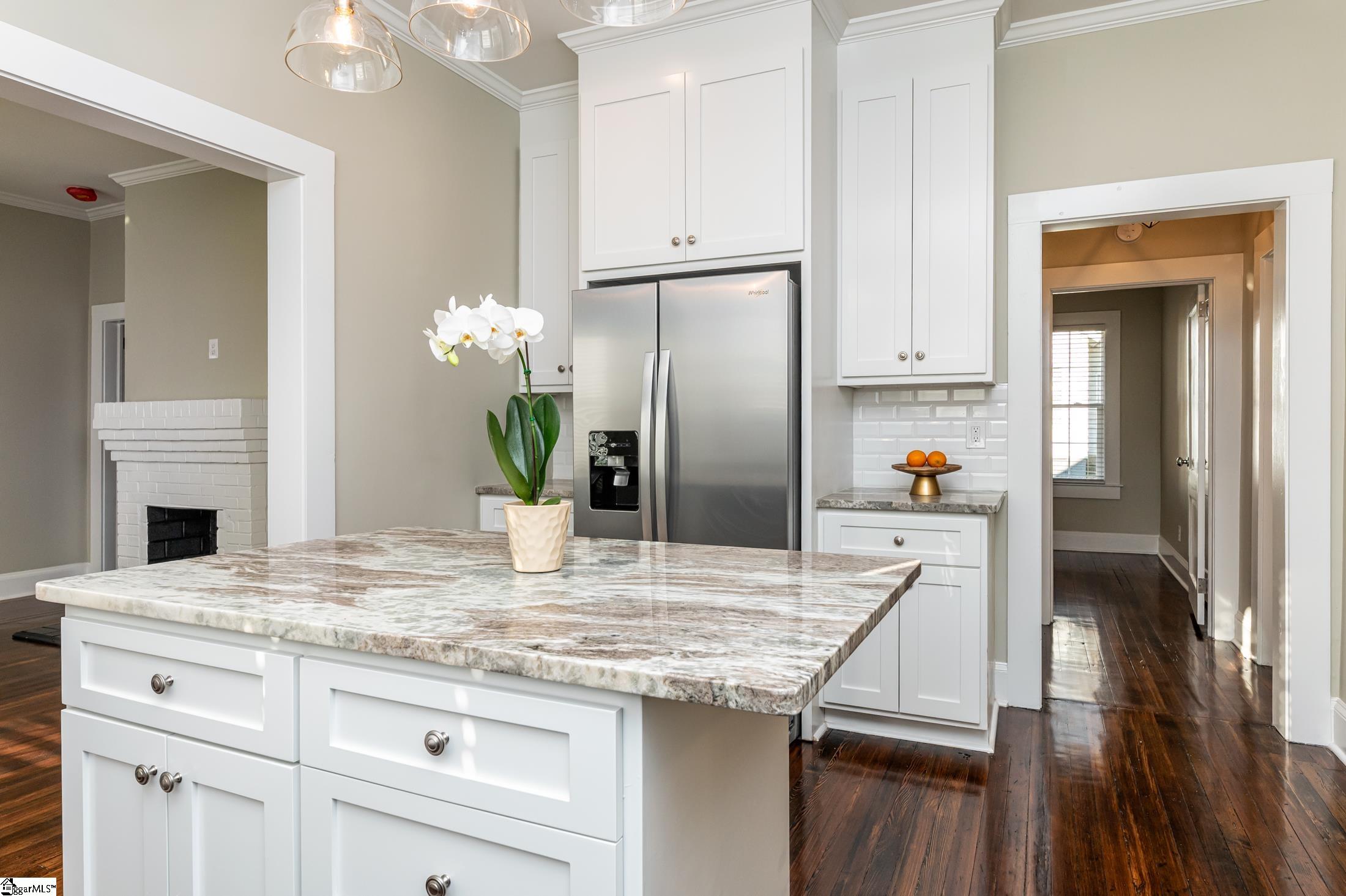 Completely renovated in 2021, this downtown bungalow is adjacent to Prisma Health and Bon Secours hospitals, downtown Greenville and the Augusta Road area. This updated home offers 2 bedrooms with 2 full baths. Features include: soaring 10 foot ceilings, all new custom trim mouldings, and original heart pine hardwood floors. The open living area flows well with a large living room that includes a brick fireplace. The large kitchen features custom built, shaker style cabinets that are ceiling height, a large island for entertaining, granite countertops, and a full suite of stainless appliances including a gas range. The primary bedroom offers a full bath complete with designer tile. Other 2021 updates include electrical, plumbing with pex pipes, gas HVAC unit, hot water heater, plantation blinds, vinyl siding, thermal windows, architectural shingled roof, insulation in the attic and crawl space, moisture barrier in crawl space, large deck overlooking the completely fenced in backyard, gutters, lighting and more! Please verify any information you deem important.