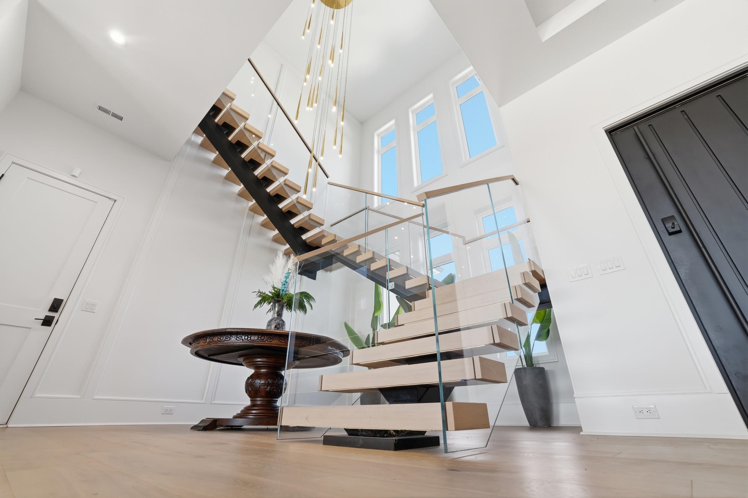 Set on 2.58 acres along the Intracoastal Waterway, this exceptional estate offers an incredibly rare combination of expansive land, deep water frontage (approx. 185 feet), and a thoughtfully designed dual residence layout ideal for both everyday living and entertaining. The property features a stunning 5,900 sq ft main residence and a 3,000 sq ft guest house, seamlessly connected by a utility corridor, creating privacy while maintaining convenience. The main home showcases refined craftsmanship and modern coastal elegance with 6 bedrooms, 5.5 baths, and a 4 car garage. Inside, you’ll find a bright, open floor plan enhanced by 14 foot tray ceilings, engineered hardwood flooring throughout, and floor to ceiling sliders that frame sweeping water views from both levels. The gourmet kitchen is equipped with Thermador appliances, custom cabinetry, and quartzite countertops with mitered edges, flowing effortlessly into expansive living and dining areas. The downstairs primary suite offers a private retreat with an oversized walk-in closet and a spa inspired bath, while additional highlights include a floating staircase, dedicated office with Juliet balcony, large den, and a 1,200 sq ft bonus room complete with a full bar. Dual laundry areas, a whole-home water filtration system, integrated sound system, and full security and camera system provide both comfort and peace of mind. The upper level features a full-length balcony spanning the entire rear of the home, maximizing views of the Intracoastal. Outdoor living is equally impressive, centered around a saltwater pool with integrated spa, complemented by a fully equipped outdoor kitchen, dining space, and lounge areas, all finished with limestone pavers perfect for entertaining or relaxing waterfront evenings. The guest house is a private, fully appointed residence offering 3 bedrooms and 3.5 baths, a sunroom, and an upstairs bonus space. Mirroring the quality of the main home, it includes a gourmet kitchen with Thermador appliances, quartzite countertops, custom cabinetry, and engineered hardwood flooring throughout. The downstairs primary suite features a spacious walk-in closet, while 14 foot coffered ceilings and a rear patio complete the space. This is a rare opportunity to own a true Intracoastal estate with scale, privacy, and luxury features seldom found in one offering.