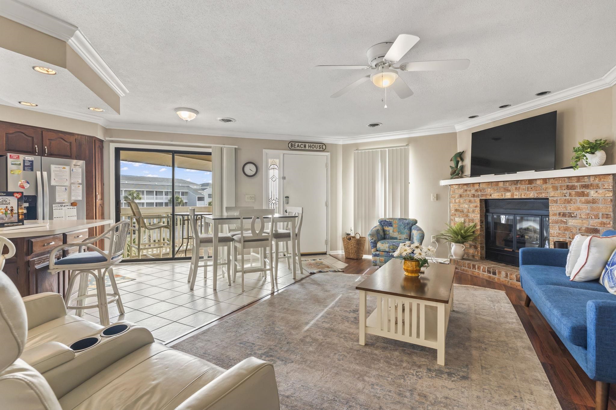 The beach lifestyle is calling with this spacious two bedroom end unit condo offering beautiful ocean views and the added privacy of a second floor location with no neighbors above, and as you step inside you are welcomed by warm neutral paint, crown molding, and durable wood look LVP flooring flowing through the main living areas and bathrooms, while the kitchen just off the entry features stainless steel appliances, solid wood cabinetry, a breakfast bar, space for a dining table, and a full size pantry, opening into a bright living and dining area that is perfect for relaxing, entertaining, or enjoying a movie night by the electric fireplace, and the private front balcony is an ideal place to start the day with coffee while watching the sunrise over the Atlantic or unwind in the evening with sunset views overlooking the lake, fountain, and community pool and hot tub, while both generously sized bedrooms are filled with natural light and include sliding doors leading to a rear balcony overlooking the pool along with their own private bathrooms featuring double vanities and tub and shower combinations, plus the convenience of a full size washer and dryer located in the unit, and when you are ready to enjoy the outdoors the beach is just across the street with an exterior storage closet for your beach gear and owner allowed golf carts or motorcycles making it easy to explore nearby restaurants, shopping, and attractions throughout North Myrtle Beach, while an outdoor spigot and hose below the unit makes rinsing off after the beach simple and also includes a plug for golf cart charging, and the well maintained Tilghman Lakes community offers newer roofs and siding with no current assessments and an HOA fee that includes insurance, water, sewer, trash, pest control, and cable, making this property a great option whether you are looking for a vacation getaway, investment property, or your own place to enjoy the beach.
