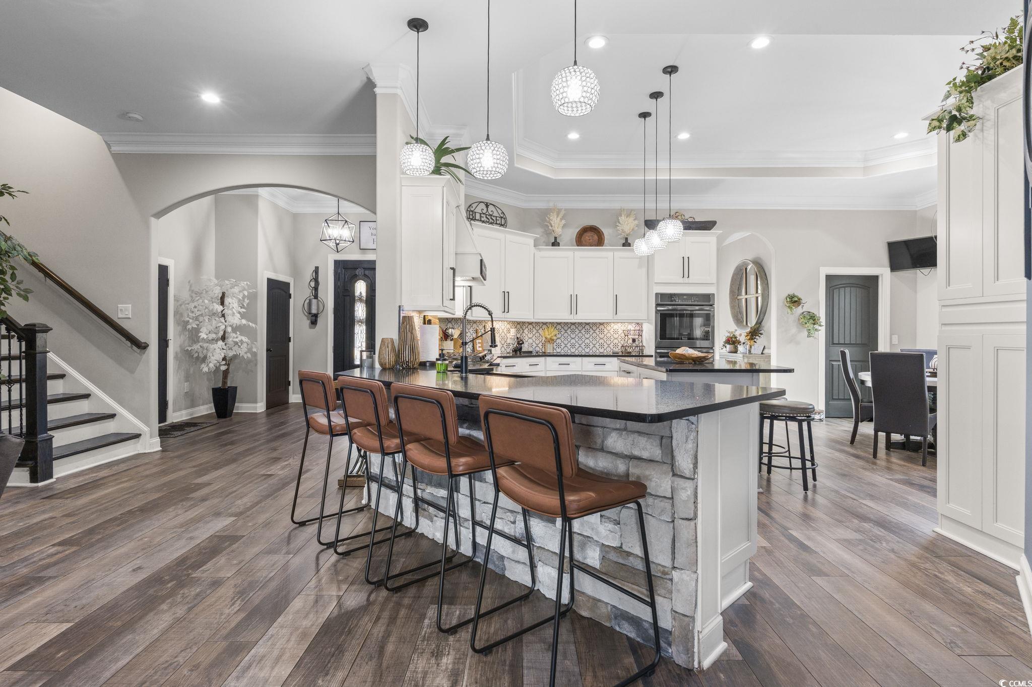 Welcome to this stunning custom-built 2021 stucco home, perfectly positioned on a serene pond within a desirable golf course community. Thoughtfully designed with exquisite craftsmanship and fine details throughout, this four-bedroom, three-and-a-half-bath residence offers luxury, space, and comfort at every turn. Fall in love upon entry into the inviting foyer, featuring a stunning formal dining room positioned just off to the left, setting the tone for the elegance found throughout the home. The heart of the home is the massive gourmet kitchen, featuring an oversized layout, abundant cabinetry, quartz countertops, stainless steel appliances, double wall ovens, 36" gas cooktop, and a walk-in pantry ideal for both everyday living and entertaining. Soaring 11-foot ceilings, with select areas reaching up to 13 feet, enhance the open and airy feel, while beautiful tiled flooring throughout adds both style and durability. A bright Carolina room extends off the oversized formal living room equipped with cozy gas fireplace, provides breathtaking pond views and the perfect setting for morning coffee or evening relaxation. Beyond the Carolina Room is an oversized screened porch and additional patio space creating an ideal outdoor entertaining area perfect for barbecues and gatherings. The fenced-in yard adds privacy while remaining easy to maintain. The primary suite is conveniently located on the first floor with his and her walk-in closets, offering a peaceful retreat that leads into a spa-like en-suite which includes dual vanities, a relaxing soaking tub overlooking the water, and a stunning walk-in tiled shower. Two additional bedrooms on the main level share a well-appointed bathroom with 2 separate vanities while upstairs you'll find a spacious bonus room with its own en-suite, perfect for guests or a private retreat, along with walk-in attic storage for added convenience. This exceptional home seamlessly blends luxury, functionality, and scenic views an absolute must-see in a premier golf course community! Furnishings, golf cart, and ride-on lawnmower are negotiable, offering a move-in-ready option for added convenience. Residents enjoy access to an impressive lineup of resort-style amenities and clubhouse, including a massive pool, lap pool, hot tub, waterslide, and kiddie pool. The community also features tennis and pickleball courts, basketball courts, a playground, and a private boat ramp, making it easy to enjoy an active outdoor lifestyle. For added flexibility, boat and RV storage are available, perfect for those who love to explore on land or water. Schedule your showing today to become a part of such a desirable community!!!