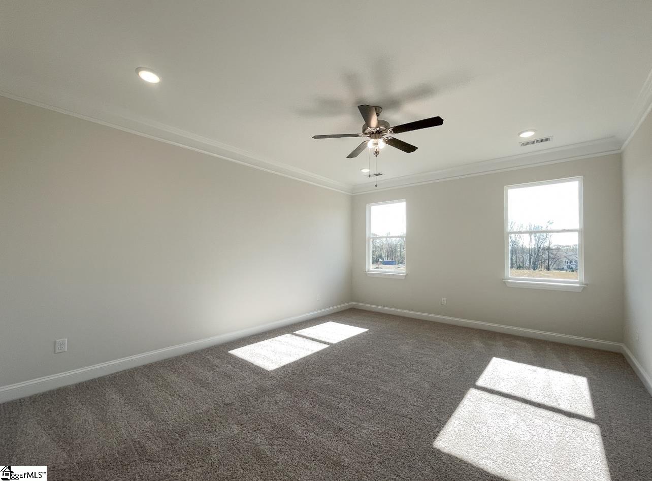 New construction. 5 bedrooms, 3 bathrooms, and a 2-car garage. A defined foyer leads into the home, passing two bedrooms and a dining room before reaching the open living area at the back. The kitchen features a built-in microwave/oven combination, gas cooktop, designer range hood, stainless steel dishwasher, quartz countertops, backsplash, LED lighting, and pendant fixtures. The family room is open to the kitchen and provides access to the main-level primary suite, which includes a tiled walk-in shower, dual sinks, a linen closet, and a large walk-in closet. Upstairs includes two additional bedrooms and a full bath. All bathrooms feature upgraded cabinetry, quartz countertops, and coordinated fixtures. Additional features include a rear patio, upgraded trim, lighting, and plumbing packages, structured wiring, a built-in pest control system, and a finished garage with drywall, paint, electrical outlets, and lighting. Community amenities include two pickleball courts.