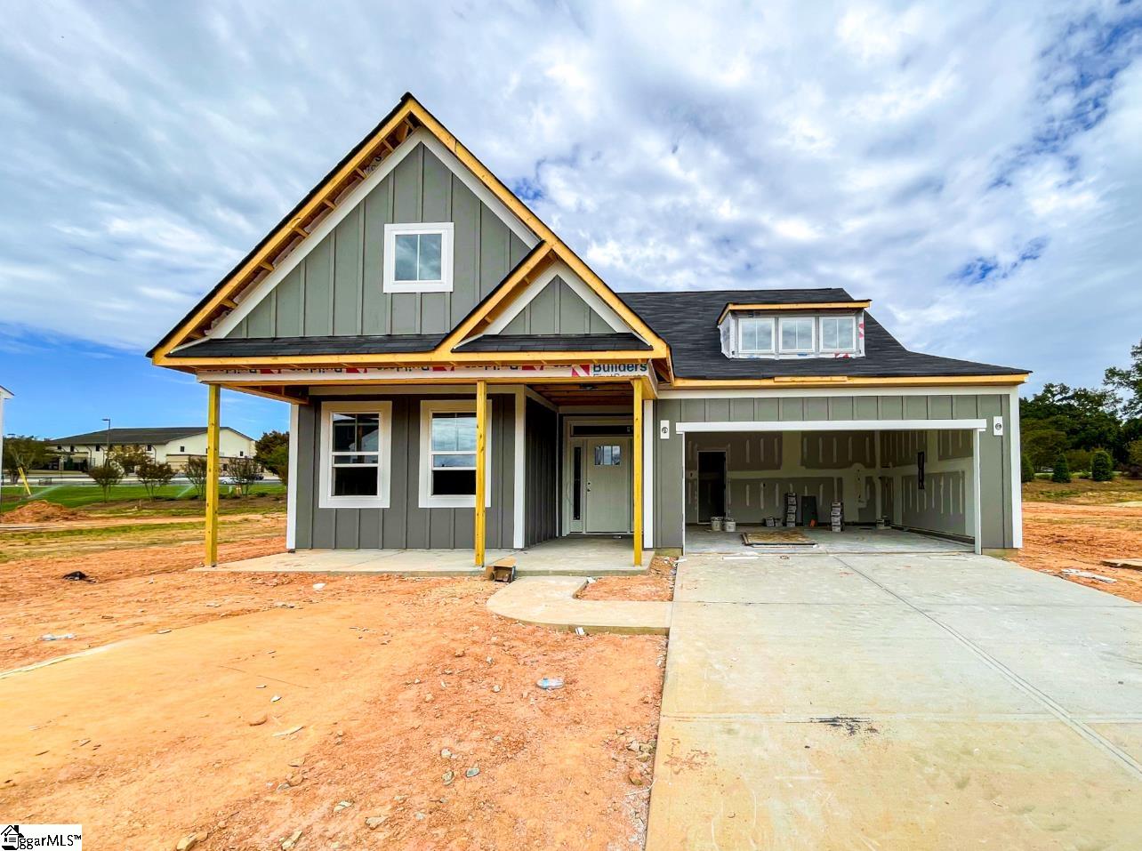 New construction. 4 bedrooms, 3 bathrooms, large open loft, and a rear covered porch. The main level includes a foyer leading to the open living area at the back of the home. The great room features large windows for natural light. The kitchen includes upgraded cabinetry, quartz countertops, tile backsplash, stainless steel appliances, LED disc lighting, and pendant lights over the island. The adjacent dining area provides access to a covered rear porch and an additional patio for outdoor use. The primary bedroom is on the main level and features a bathroom with a tiled walk-in shower, garden tub, dual sinks, and tile flooring. A laundry pass-through connects to the primary suite. Upstairs includes a large loft, fourth bedroom, and third full bathroom. All bathrooms feature quartz countertops. Additional upgrades include enhanced vinyl plank flooring, upgraded lighting, plumbing, and trim packages. Structured wiring and built-in pest control system included. Finished garage is drywalled, painted, and includes electrical outlets and lighting. Community amenities include two pickleball courts.