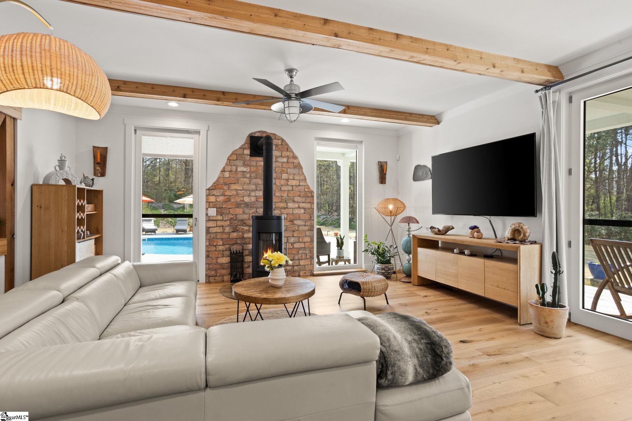 Custom-built in 2019, this home sits on approximately 3 private acres with no HOA or restrictions, offering a layout designed for primary living on the main level. The main level flows seamlessly from an open kitchen and dining, to bright living spaces, and access to outdoor areas. The primary suite is located on the main floor, with additional bedrooms and flexible space upstairs. The outdoor setting is a key feature, with a saltwater pool, patio, screened porch, and a covered wraparound porch. The property is set back from the road and bordered by woods, making it easy to enjoy your quiet, relaxing retreat! In addition to the main home, there is a fully conditioned detached structure with a garage, flex space, bathroom, and finished upper-level loft, offering clear ADU potential. A separate four-car garage provides additional storage and utility for vehicles, equipment, or workshop use. The home was built with a focus on efficiency and performance, including owned solar, high-quality windows and doors, and premium insulation. The result is a property that prioritizes function, privacy, and long-term usability. Conveniently located under 30 minutes to downtown Greenville, approximately 10 minutes to Main Street Spartanburg, and less than 20 minutes to GSP Airport.