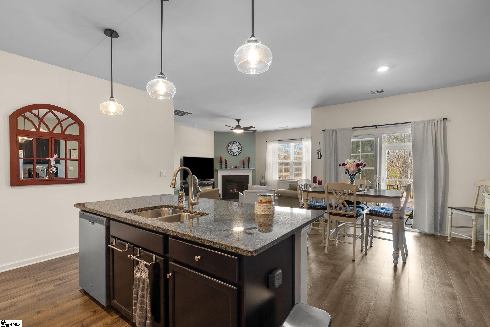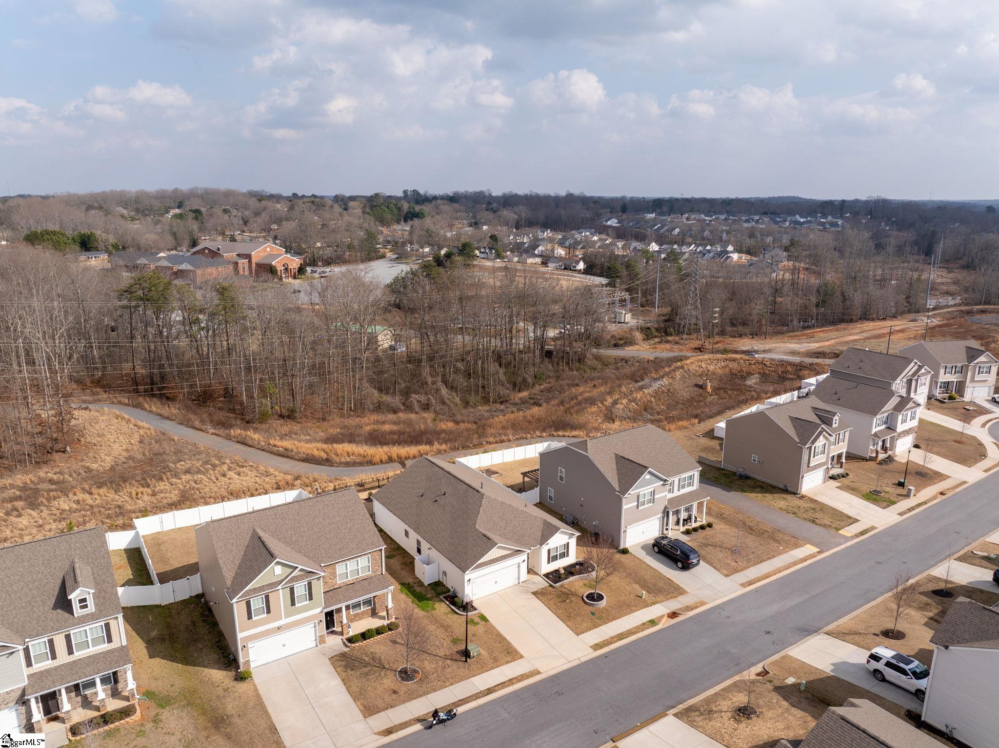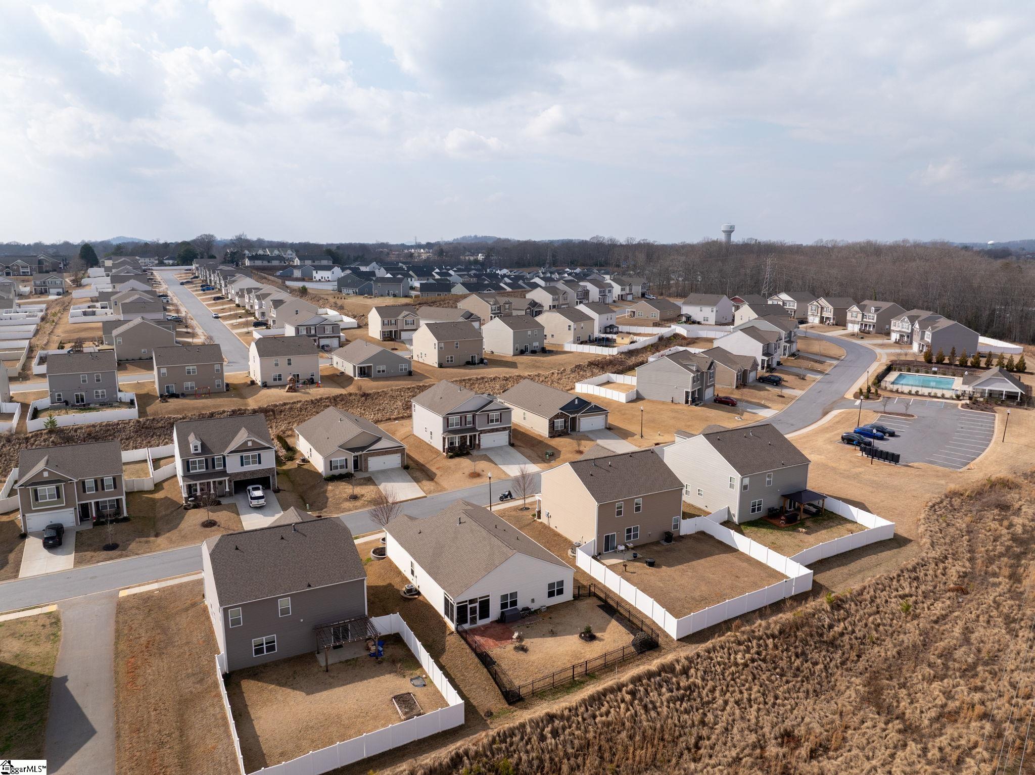Welcome home to this beautifully maintained 4-bedroom, 2-bath single level home in the sought after Pearson Farms community, zoned for Forest Acres Elementary, Richard H. Gettys Middle, and Easley High School. Built in 2022, this home offers approximately 1,774 sq ft with a bright, open concept layout perfect for everyday living and entertaining. The inviting living area centers around a cozy gas fireplace and flows effortlessly into the kitchen, complete with dark cabinetry, stainless steel appliances, a spacious walk-in pantry, and an upgraded backsplash. Laminate plank flooring anchors the main living spaces, while the bedrooms offer plush carpet for added comfort. The primary suite impresses with vaulted ceilings, a walk-in closet, and an en-suite bath with double sinks. Step into the enclosed sunroom, a perfect flex space, that leads to the extended back patio with a paved BBQ area and large fenced-in yard. Beyond the fence, a private wooded area offers lasting privacy and is planned to include hiking and walking trails, while still preserving your serene backyard retreat. The home also features a 2-car garage and is within walking distance to the community pool, making it a complete package for comfort, style, and lifestyle.