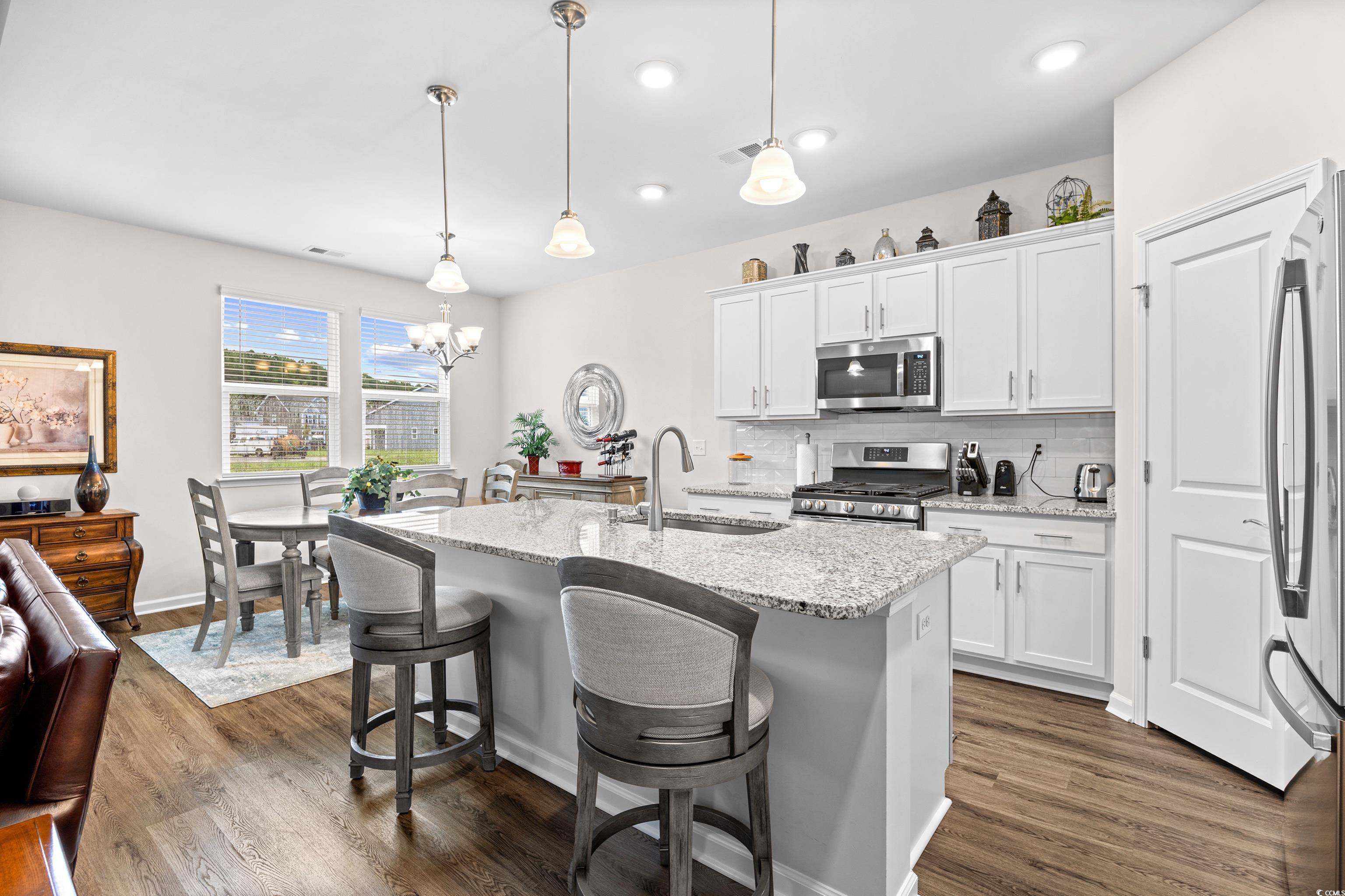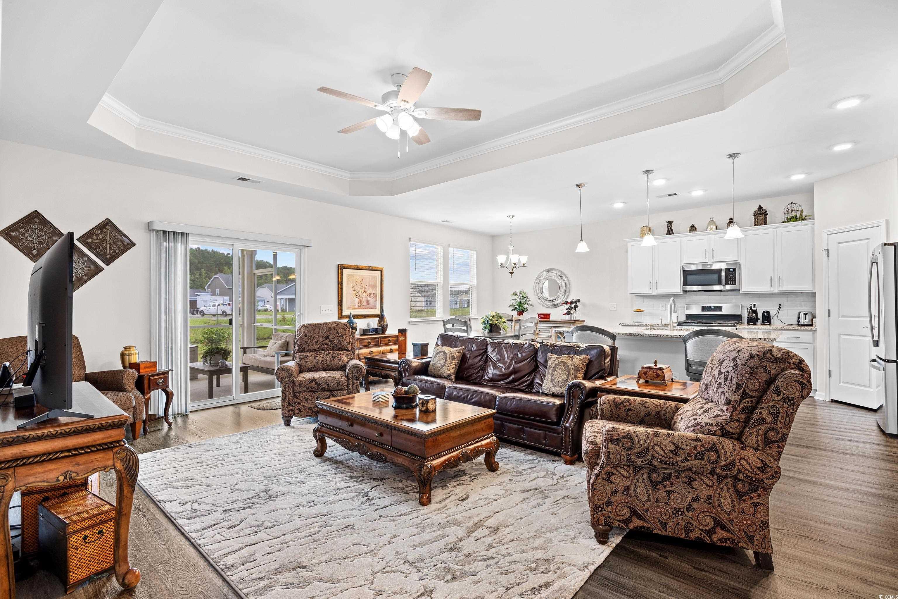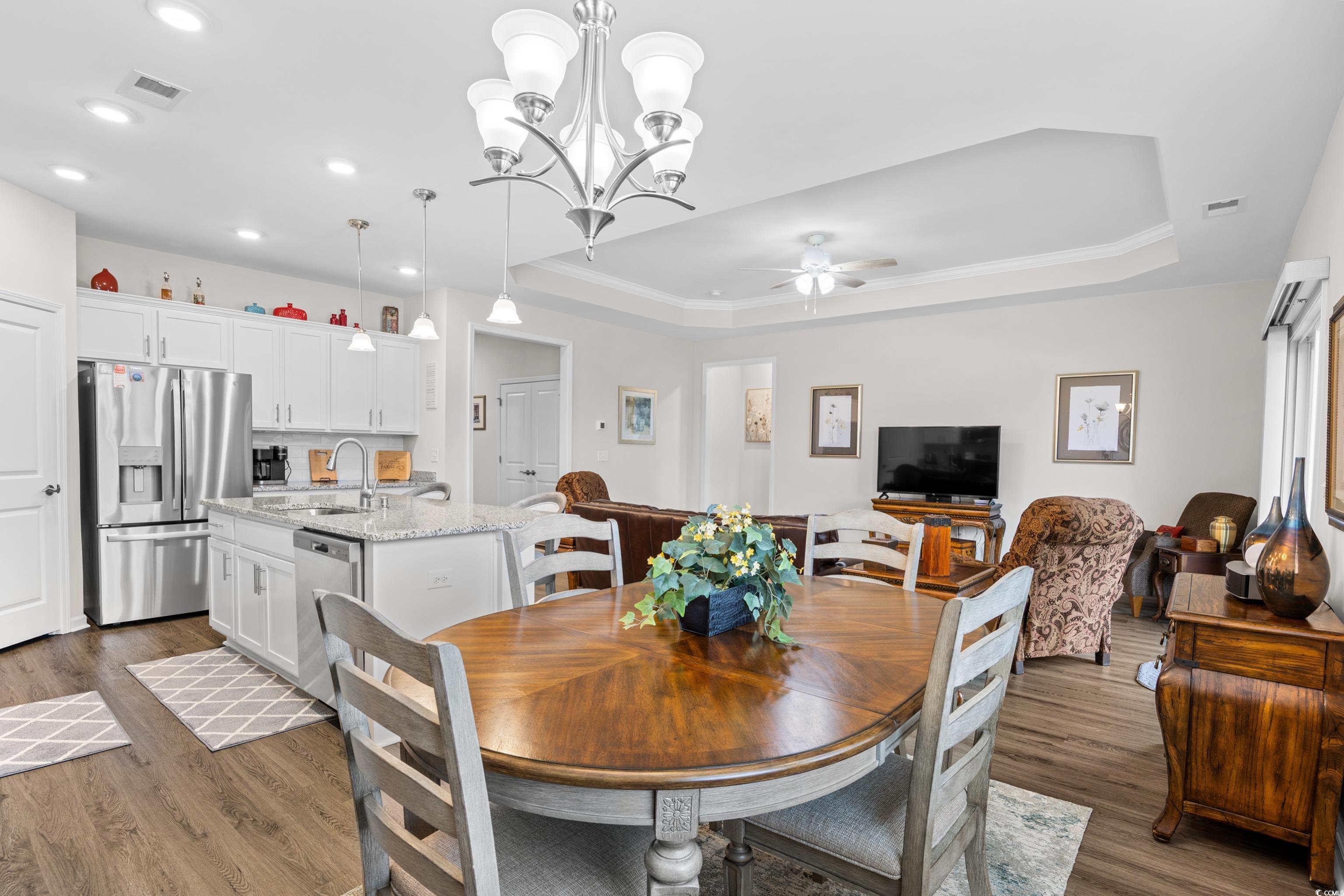 Welcome to your dream home in Longs! This beautifully maintained 3-bedroom, 2-bath residence offers the perfect blend of comfort and style. Located in a quiet neighborhood just minutes from North Myrtle Beach, this home features an open-concept floor plan with tray ceilings, abundant natural light, and a spacious living area ideal for entertaining. The kitchen boasts modern cabinetry, ample counter space, and a breakfast bar for casual dining. The primary suite offers a walk-in closet and a private bath with a double vanity and a walk-in shower. Step outside to a backyard with a covered patio—perfect for relaxing or hosting gatherings. With its convenient location near shopping, dining, golf, and sandy beaches, this home is move-in ready and waiting for you!
