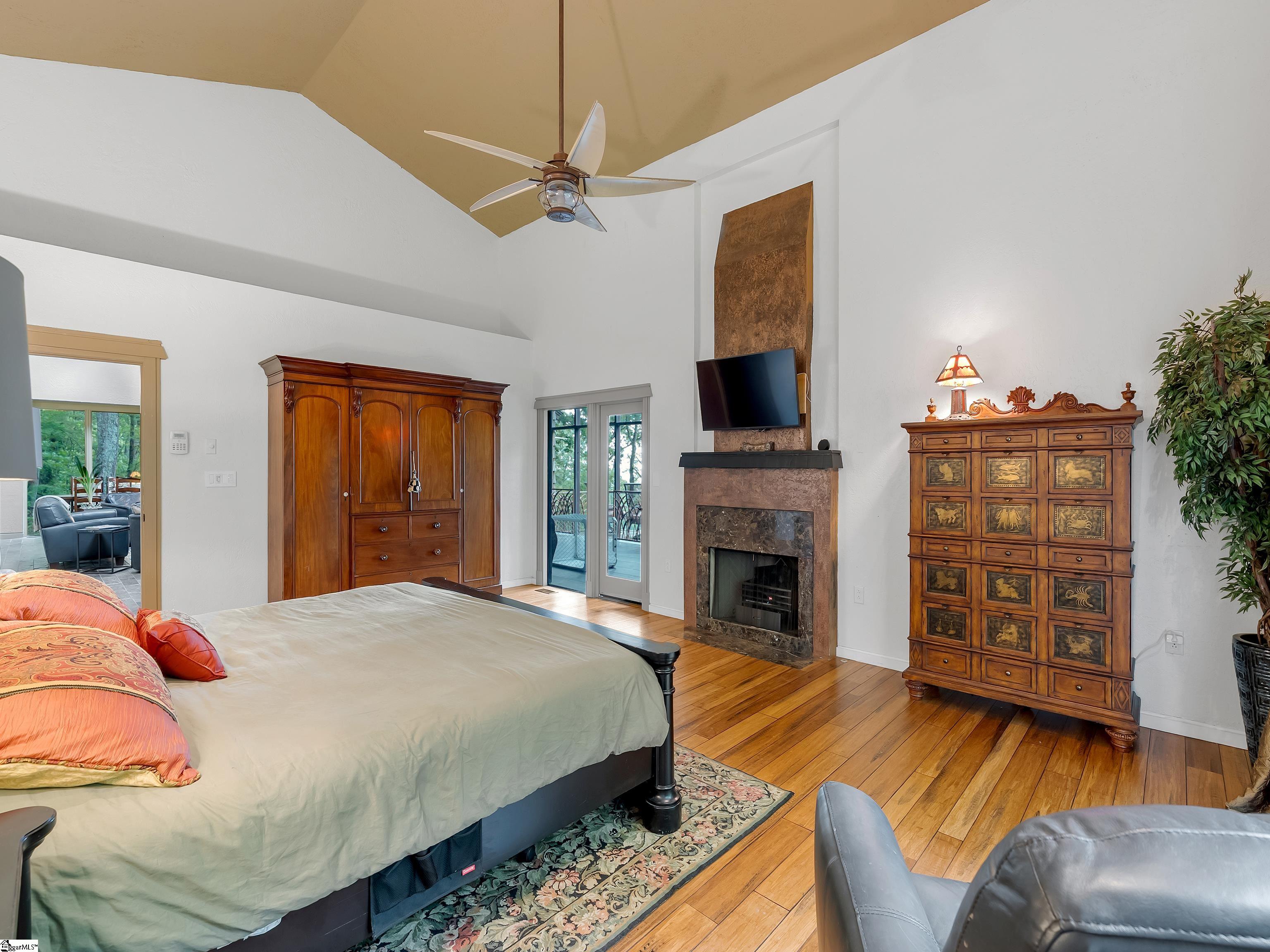 Nestled within the cliffs at glassy, this extraordinary estate spans over five acres, seamlessly blending refined architecture with the natural beauty of its surroundings. Thoughtfully designed to embrace the landscape—including a striking natural waterfall—this one-of-a-kind home is a sanctuary of artistry & elegance. A sense of wonder greets you upon arrival. A custom bridge, adorned with metalwork by acclaimed artist-blacksmith John Boyd Smith, spans a water feature, guiding you to the entrance. There a handcrafted copper door—framed by locally made stained-glass transoms—invites you in where craftsmanship, design, & nature exist in perfect harmony. Step into this Frank Lloyd Wright-inspired masterpiece & discover a symphony of design & natural light that highlights the home’s organic elegance. The entryway opens to a breathtaking, panoramic view of Paris Mountain. At the heart of the home, the great room features a stone gas fireplace, an indoor 9’ recirculating water wall & sealed slate floors. Just beyond, a spacious deck, with custom-forged metal railings, invites seamless indoor-outdoor living. A handcrafted light fixture, artfully designed to reflect the leaf of every type of tree found on the property, serves as a natural conversation piece. Whether gathered around the wood-burning fireplace or gazing off one of the four balconies, you’ll find endless opportunities to unwind & take in the serene beauty of Glassy Mountain. At the heart of the home, the custom-designed gourmet kitchen caters to culinary enthusiasts with high-end appliances, including a Viking range with double ovens, Sub-Zero refrigerator, two dishwashers, a warming drawer, a wine chiller, an ice machine, & three sinks. A butcher block countertop with built-in bread-cutting station adding both function & charm, compliments the surrounding granite countertops. Blending rustic character with contemporary style, a raised beveled glass bar & a copper-finished serving counter introduce artistic flair. An updated walk-in butler’s pantry—with additional cabinetry & a full size freezer—provides ample storage space. Adding to the charm of this exceptional kitchen is one of the home’s four gas fireplaces. Just off the kitchen, the cozy breakfast room offers a built-in Bosch coffee station & sweeping views of mountains, making every morning a serene experience. The primary bedroom features a cathedral ceiling, gas fireplace, & bamboo-striated floors. It seamlessly connects to the keeping room with a private balcony, currently used as a home office, framing the landscape of Paris Mountain & the natural waterfall. A walk-in closet with stacked washer/dryer leads to a private workspace above via a spiral staircase. The primary bath is a spa-like sanctuary with Kohler glass vessel sinks, soaking tub, & makeup vanity. The lower level features two spacious en-suite bedrooms, one with views of the waterfall. Bathrooms include frameless glass showers, heated tile floors, a sauna, & a private water closet. A theater/recreation room with cedar ceilings & skylights offers the perfect space for entertaining, alongside a fully equipped wet bar & a wine cellar with cork flooring, dual chillers, & room for 250 bottles. The theater includes a 110-inch screen, built-in bookcases, & custom media cabinets. Above the garage, a secluded guest suite offers versatile space—perfect for visitors, recreation, or hobbies. Thoughtful upgrades include new lighting along the driveway and east side path along the house, multiple redesigned storage spaces, high-end appliances, new lighting & ceiling fans, fresh paint, & smart switches & thermostats integrated with Alexa for voice control. This estate is a rare blend of natural beauty & artistic vision—a sanctuary that inspires creativity, nurtures tranquility, & celebrates the art of living in harmony with the world around you. A Club membership at The Cliffs is available with this property giving you access to all seven communities.