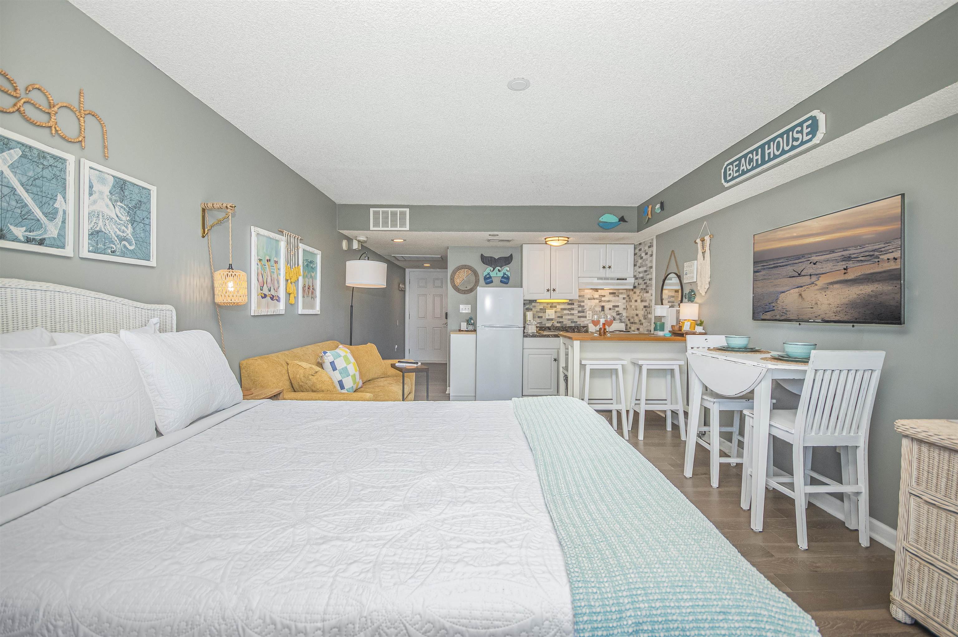 PRICE IMPROVED, CURRENTLY LOWEST PRICED CONDO IN BLUEWATER VILLAS II! Welcome to Bluewater Villas II Unit 308-B known as "Sea Hooks". This beautiful 3rd-floor efficiency truly captures the essence of beach living. Renovated throughout since 2023 with features of new appliances, tile backsplash, updated bathroom, and new HVAC system (2023), this condo offers peace of mind along with modern coastal style. It's currently set up to sleep 2 with a queen size bed but could sleep 4 by adding a sleeper sofa. From the moment you enter the foyer, the view is immediate and unforgettable from sunrise to sundown — direct, unobstructed ocean views fill the space with natural light and that calming coastal feel everyone searches for. This villa offers incredible sightlines from the private balcony, perfect for soaking in the scenery of Hurl Rock Park and even a little people-watching along South Ocean Boulevard. Located on the third floor, you get the ideal vantage point for views — and no worries about stairs. The elevator conveniently transports you and your beach gear to your unit, and to the laundry room located just one level down. Ownership includes all utilities of interior electric, cable, internet, water & sewer, pest control, lawn & common area maintenance as well as building insurance, full access to the private pool and hot tub for the building and on-site outdoor grill areas, as well as the extensive resort style amenities at the oceanfront Bluewater Tower just across the street including oceanfront indoor and outdoor pools with plenty of lounge chairs, relaxing lazy river, hot tubs, on-site dining, bar, arcade and gaming areas, fully equipped fitness center and direct beach access. Parking is abundant with ground-level spaces under the building, street-level lots, and a large parking garage exclusively for resort guests and owners. Just minutes from the SkyWheel, Broadway at the Beach, Coastal Grand Mall, Myrtle Beach International Airport and a short drive south to Surfside Beach, Garden City Beach, Murrells Inlet, and Pawleys Island or north to Barefoot Landing, Ocean Drive and Cherry Grove in North Myrtle Beach. You’re so close to everything that makes Myrtle Beach such a beloved destination from the beach, golfing, boating, fishing, shopping, etc. This efficiency unit is being sold furnished with some exclusions, making it an easy turnkey opportunity for a primary residence, vacation getaway, or income-producing property. Very easy to show — and even easier to fall in love with. Schedule your private tour today! All information, measurements and square footage are approximate, deemed reliable, but not guaranteed. Buyer or buyer's representative is responsible for verification. *Non-Conveyance List available for furnishings exclusions, ask agent for more details.*