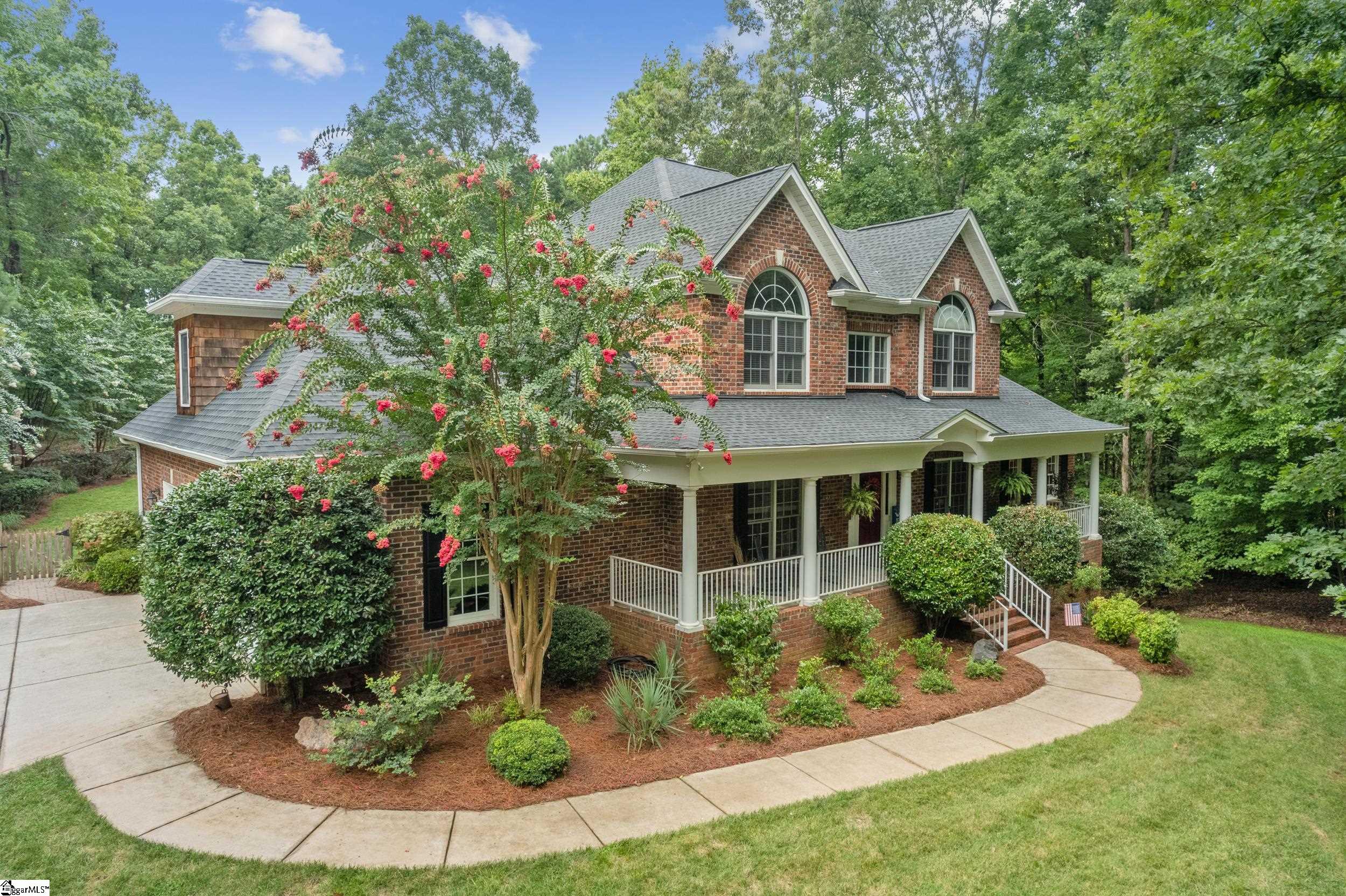 This custom retreat on nearly 2 wooded acres offers unmatched privacy with lush landscaping. An impressive driveway leads to a full-brick home in Lake Wylie, featuring hardwood floors, custom cabinetry, and crown molding. The entertainer’s kitchen includes granite countertops, stainless steel appliances, a massive center island, an eat-in area, and a walk-in pantry. The family room, with built-in bookcases, a fireplace, and coffered ceilings, opens to a large screened-in porch overlooking the private, wooded backyard, ideal for a pool. The main-level primary bedroom features a double trey ceiling, a sitting area, and an ensuite bathroom with double sinks, double closets, a Jacuzzi tub, and a tiled shower. Upstairs are four bedrooms, including one with an ensuite bathroom. The three-car side-load garage has space for a workshop or golf cart. In a no-HOA neighborhood, this property blends privacy, luxury, and convenience.