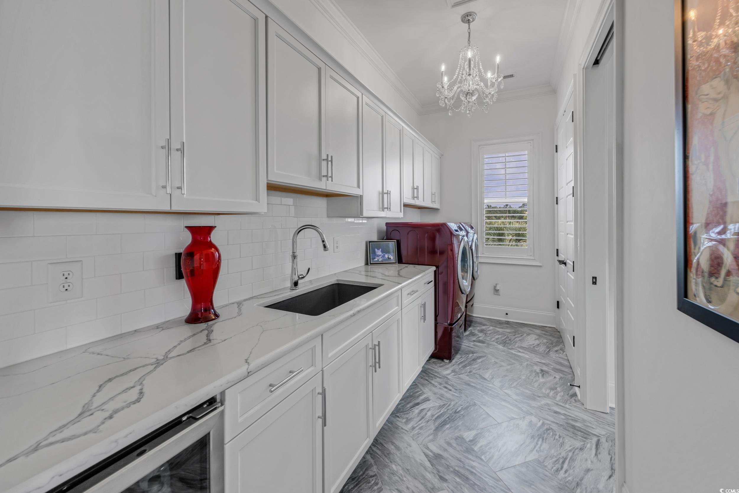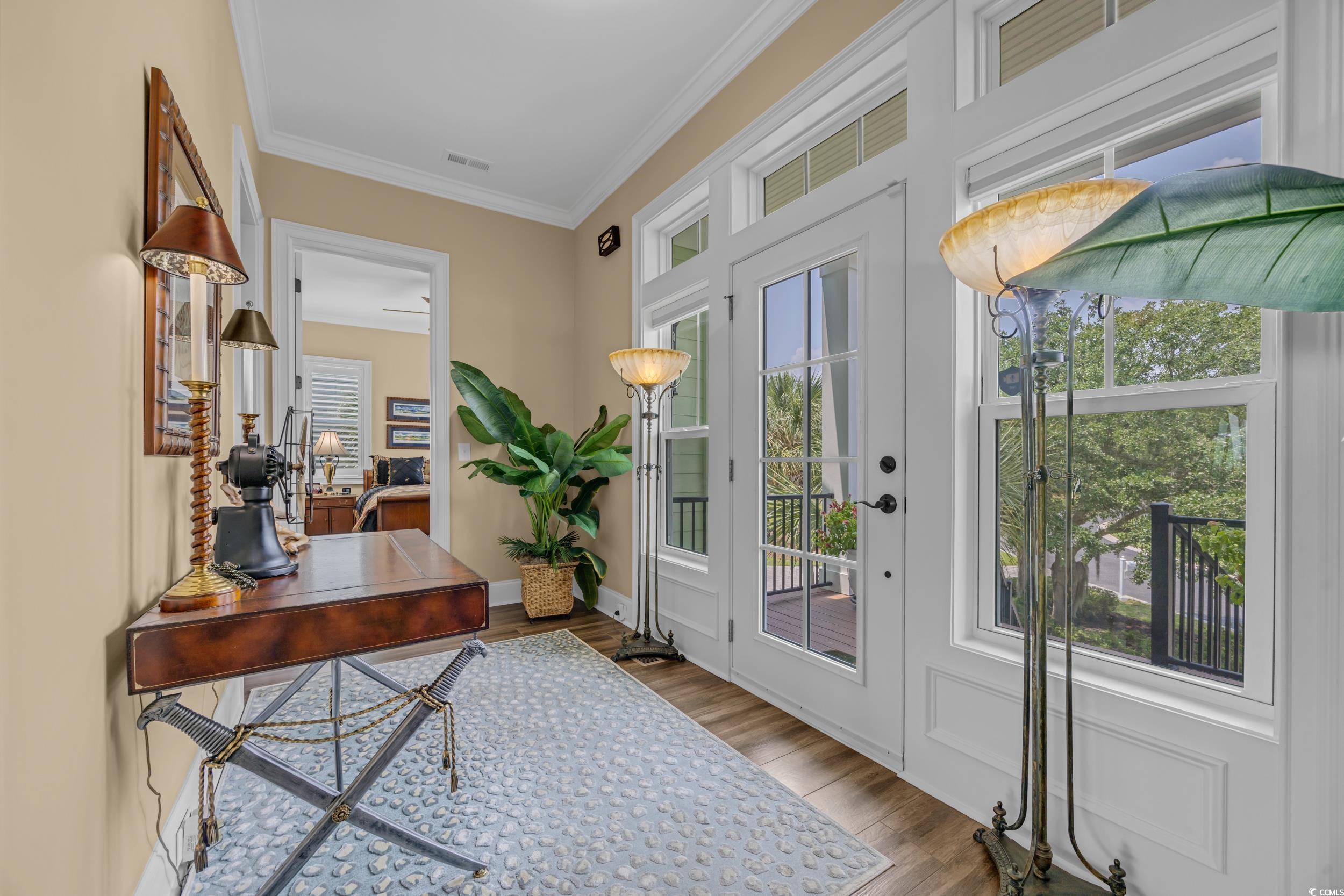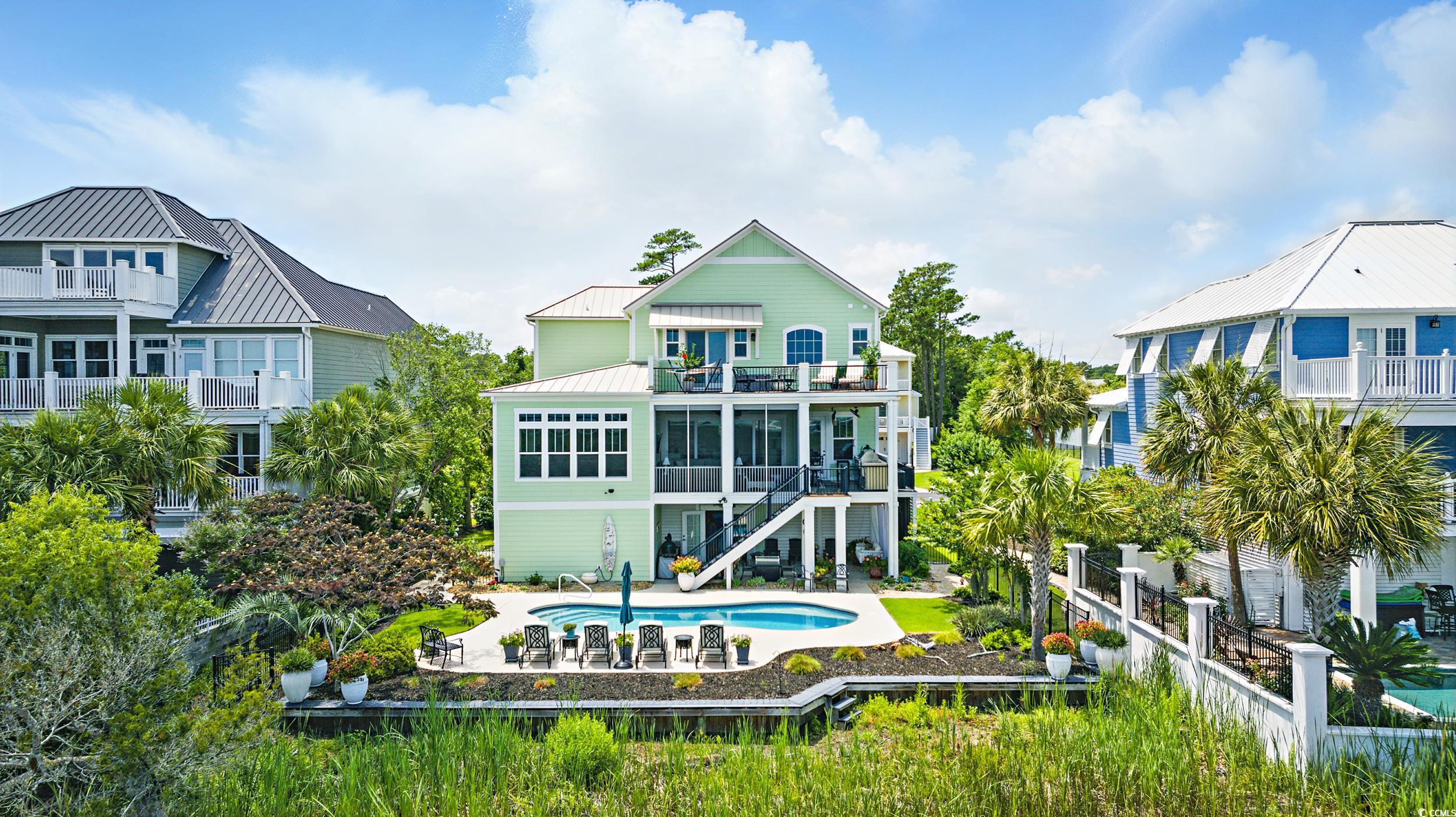 Discover breathtaking views of the creek, marshlands, and shimmering Atlantic from this custom-built luxury residence, crafted in 2019 to exacting standards, offering a harmonious blend of timeless design and cutting-edge engineering. Every element was designed with both elegance and functionality in mind, from the hurricane-rated windows and complete “spray foam insulation” to the whole-home dehumidifier integrated with the air conditioning system and whole-house Generac Guardian generator for total peace of mind. From nearly every vantage point, the scenery stretches outward in a panoramic display of coastal splendor, inviting natural beauty into the everyday experience. Arriving guests are welcomed by a dramatic sweeping staircase and a spacious foyer that sets a tone of elegance and scale. Ten-foot ceilings, eight-foot solid doors, and richly hued wood-look ceramic tile flooring define the home’s craftsmanship, while plantation shutters and fine architectural details enhance the aesthetic throughout. A beautifully appointed elevator servicing all three floors, Sonos surround sound to most rooms and outdoors, and a top-tier alarm system provide comfort and connectivity. At the heart of the home, the chef’s kitchen is a masterpiece—Anchored by a 36" Wolf six-burner gas range, an essential pot filler and custom vent hood, the kitchen features a Sub-Zero 36" refrigerator, a matching 36" Sub-Zero freezer with an ice maker, dual KitchenAid dishwashers, a Scotsman nugget ice maker with filter, and InSinkErator hot water dispenser. The stunning quartz countertops covering all surfaces, custom cabinetry with built-in drawer organizers and pull-out shelves, and a separate bar sink add to the kitchen’s luxury and utility. A generous dining area and quartz topped built-in buffet smoothly transition into the indoor and outdoor living areas, perfect for seamless entertaining. Telescopic sliding glass doors open to the spacious screened porch offering an all-season retreat with electric fireplace, retractable shade, and TV connection—positioned to take full advantage of the unforgettable views. Beautiful tile flooring and wood paneled ceiling extend onto the adjacent outdoor kitchen and dining deck. World class cooking on the Stainless Steel Lynx 48” built-in gas grill with Lynx side burners brings many relaxing, and delicious, evenings on the porch, enjoying the views and ocean breezes. The living room, adorned with a large stone fireplace, custom built-ins and elegant coffered ceiling, flows naturally into the game room, complete with a tray ceiling, floor to ceiling windows, featuring designer Meyda Tiffany lighting and a Brunswick Montebello pool table. The first floor also offers two guest suites, both with wonderfully finished full baths, one ensuite and one semi-private. All bathrooms in the main house are finished with frameless glass showers and vessel sinks, maintaining the refined design throughout. Upstairs, the primary suite is a sanctuary unto itself, with sliding glass doors opening to a private deck where the spectacular coastal vista becomes your morning backdrop. The spacious custom closet accommodates both owner’s belongings, with even more hidden storage attached. The en-suite bath features a freestanding cast iron soaking tub, perfectly placed beneath a large scenic window, a huge walk-in shower with dual showerheads and beautiful cabinetry. An elegant office with custom cabinetry and granite countertops provides an inspiring workspace. The well-appointed laundry room and lovely front balcony complete the second floor. The home’s exterior impresses with a metal roof, Hardie Plank siding, Trex decking on all decks & stairs, and Cool Step-coated surfaces on the pool deck. Whether lounging in sun-drenched serenity or entertaining alfresco, the sweeping water views elevate every moment. A truly spectacular home with a front-row seat to the natural beauty of coastal Carolina