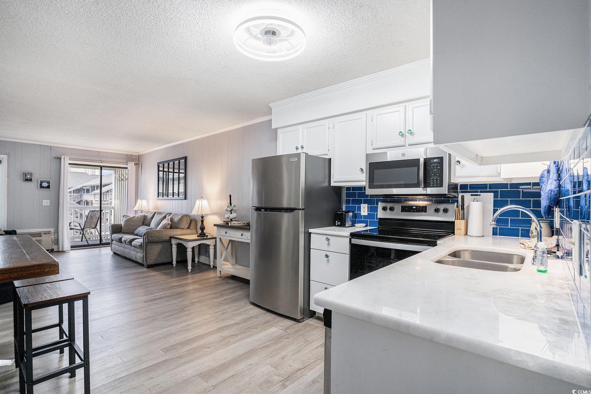 Second-floor, fully furnished 2BR/2BA condo featuring LVP flooring throughout, a modern kitchen with stainless steel appliances, quartz countertops, and a subway tile backsplash, and a master suite with a stylish barn door leading to the ensuite bath with shower. Enjoy ocean views from your private balcony. Perfect as a primary residence, vacation retreat, or rental investment. Located along desirable Shore Drive, just steps from the beach and close to golf, shopping, dining, and Myrtle Beach's top attractions. Community amenities include a sparkling pool, picnic and grill areas, on-site laundry, and easy beach access--all with low HOA fees.
