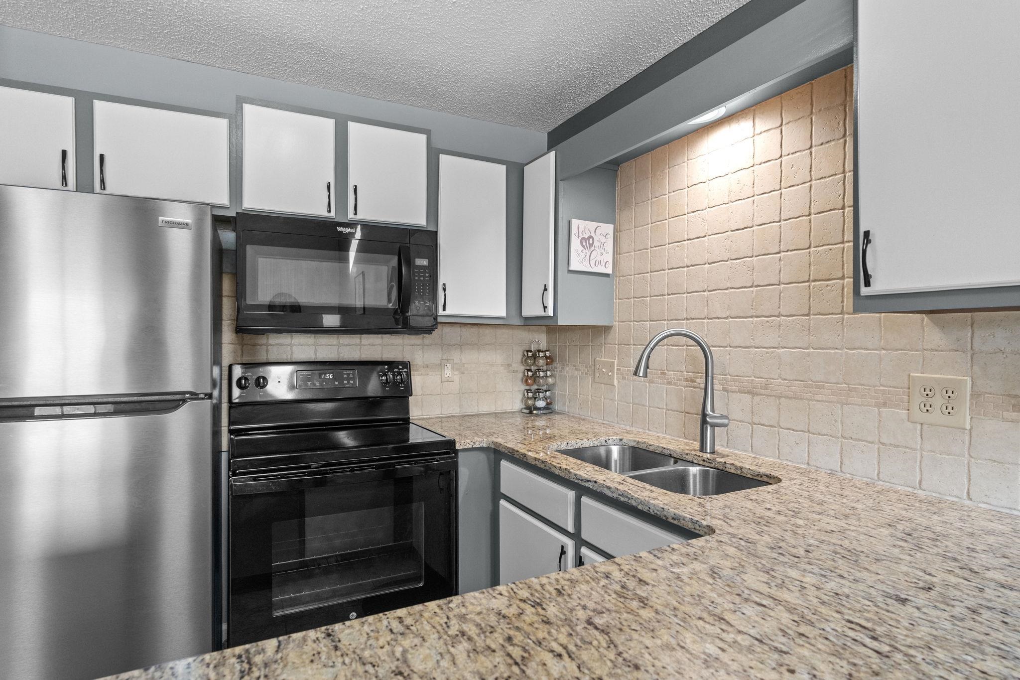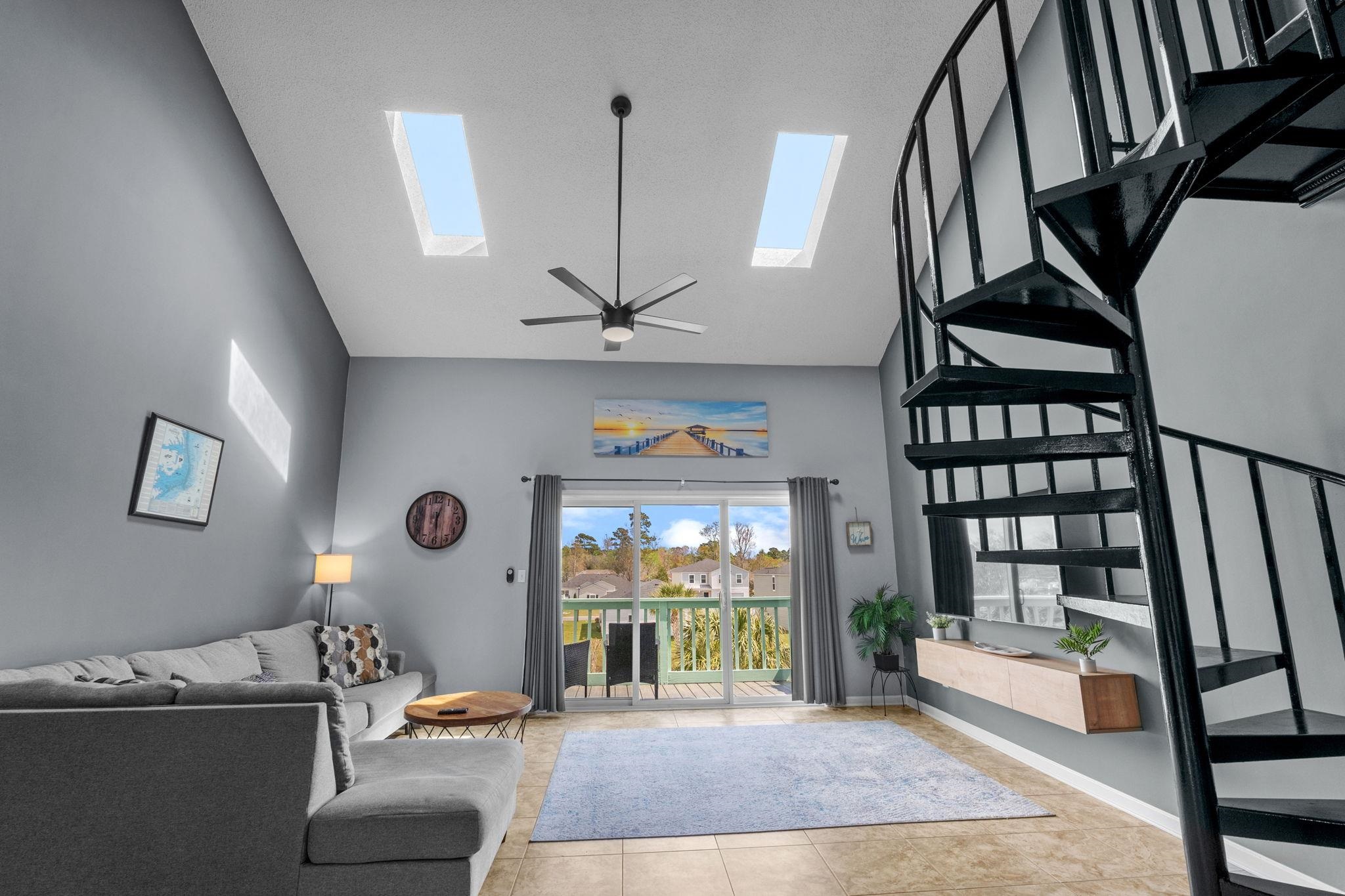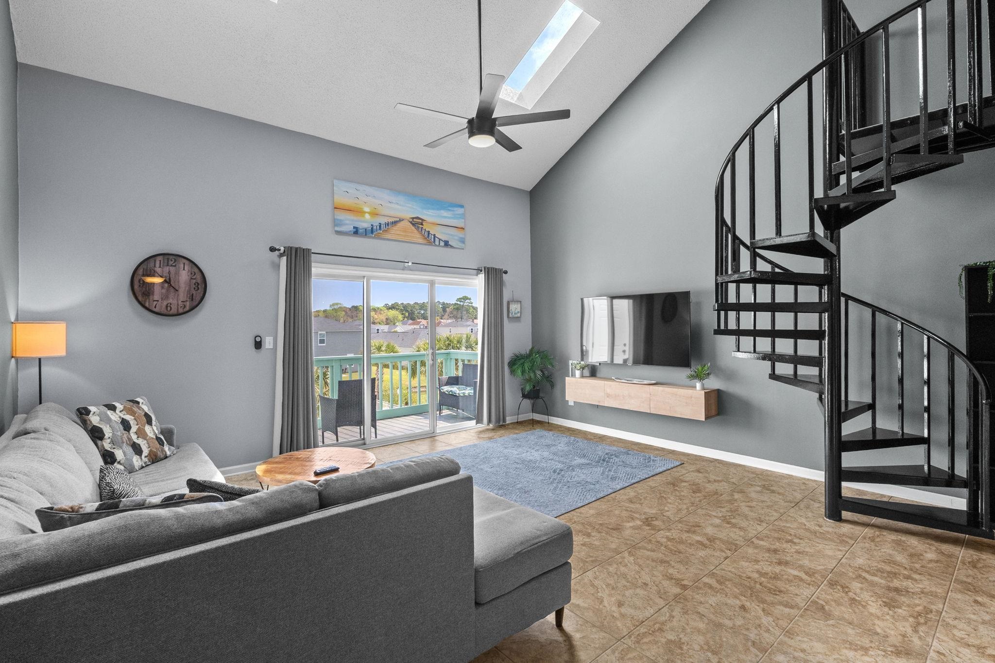 This 2-bedroom, 2-bathroom condo at Golf Colony Resort offers one of the largest floor plans in the community with approximately 1,242 heated square feet and an open layout designed for comfortable everyday living. Ideally positioned between Highway 17 Business and Highway 17 Bypass in the Surfside Beach area, the location provides quick access to restaurants, shopping, entertainment, and the beach. Sold fully furnished and overlooking the community pool, this unit is ready for immediate use as a primary residence, second home, or investment property. A new HVAC system was installed in 2023. Stylish and low-maintenance 18” tile flooring is throughout the main level while luxury vinyl plank flooring is upstairs. Entry is via a private staircase leading to a landing with space for beach gear. The kitchen is updated with granite countertops, tile backsplash, undermount sink, pantry, and breakfast bar. Recent improvements in 2025 include a new stainless steel refrigerator, dishwasher, garbage disposal, faucet, and PUK lighting over the sink. The kitchen flows directly into the dining and living areas maintaining an open feel. The family room is notably large at over 17’ by 16’, with vaulted ceilings, two skylights, and sliding glass doors that bring in natural light and views of the pool. A mantle with mounted TV creates a central gathering space, while the larger spiral staircase leads to the upstairs suite. The balcony off the family room features updated Trex-style decking, a comfortable spot to relax and overlook the pool, and a laundry closet with side-by-side washer and dryer. The main-level bedroom is generously sized with vaulted ceilings, a ceiling fan, two closets, and a king bed, with easy access to a full bathroom featuring tile floors and a tub/shower combination. Upstairs, the second bedroom offers over 17’x17’ of space with a vaulted ceiling, ceiling fan, and nice sized walk-in closet. The adjoining bathroom includes tile flooring and a tub/shower combination. Residents of Golf Colony enjoy access to a large community pool, grilling area, and two tennis courts. The HOA covers building insurance, basic cable, internet, water and sewer, trash pickup, pool and landscaping maintenance, common area repairs, property management, and pest control. Owners are permitted pets, motorcycles, and golf carts. Life here means easy access to the beach, relaxed afternoons by the pool, and a layout that supports both quiet downtime and gathering with friends and family. Schedule your showing today and take advantage of this well-located, move-in-ready condo.