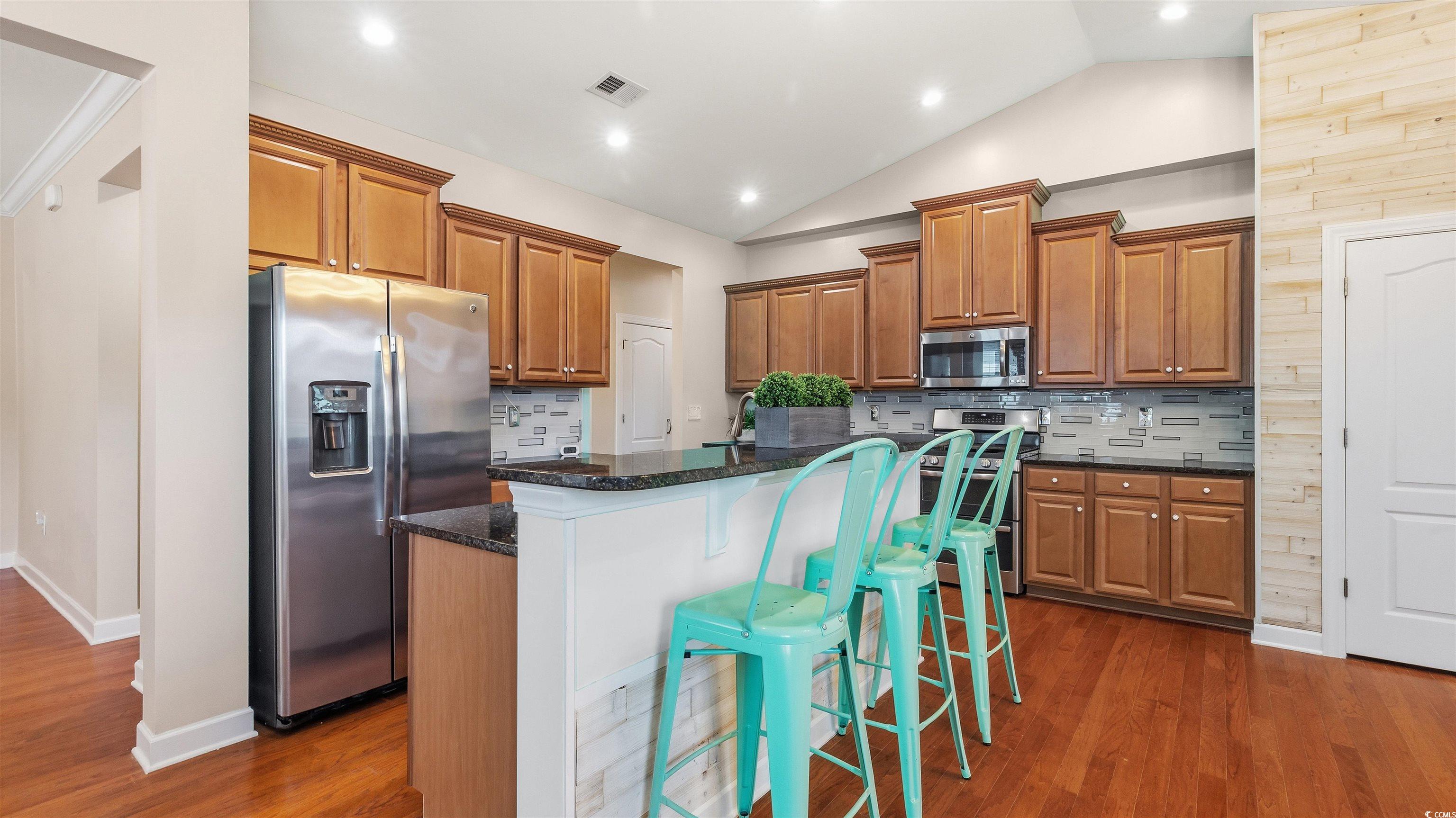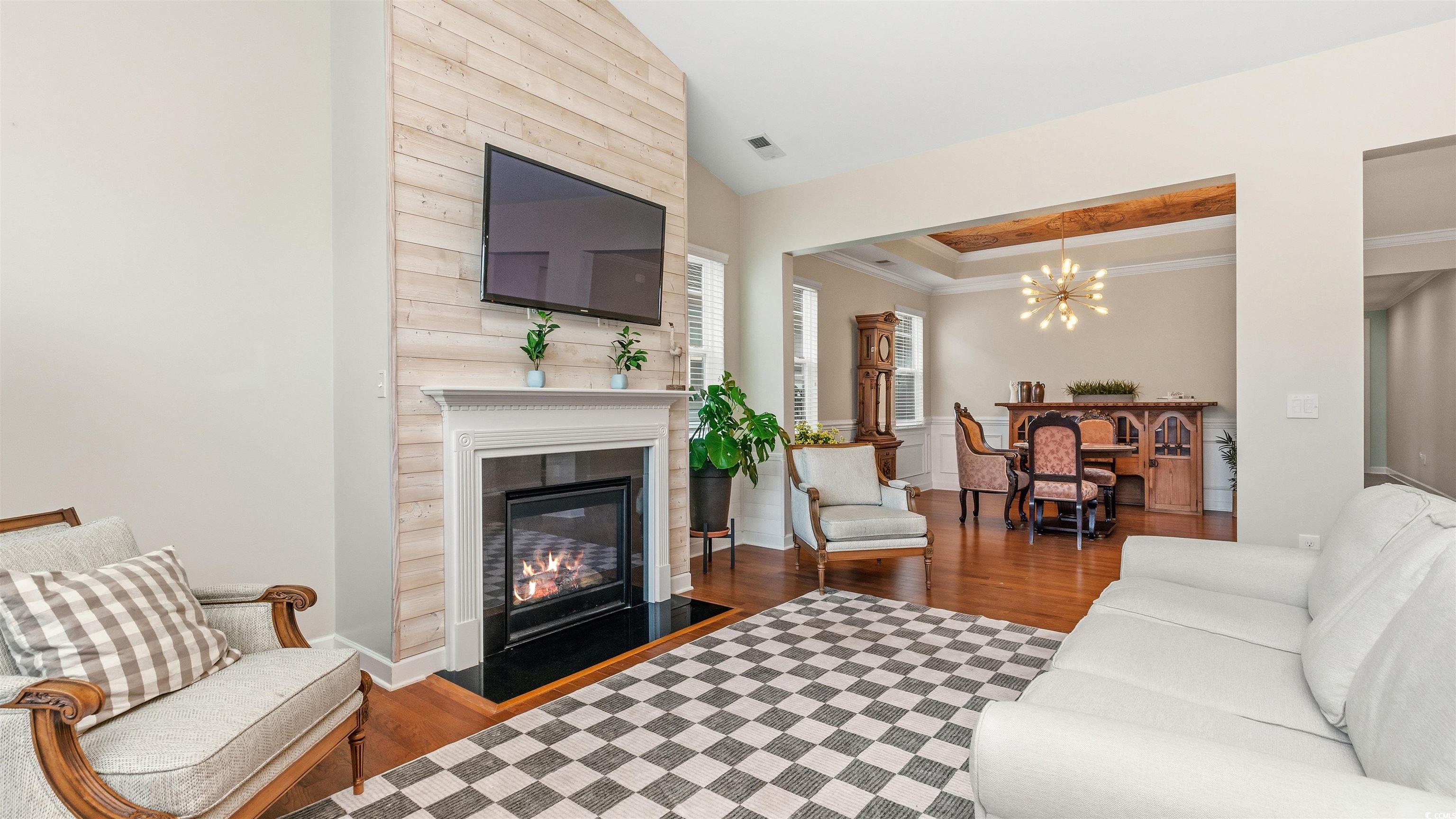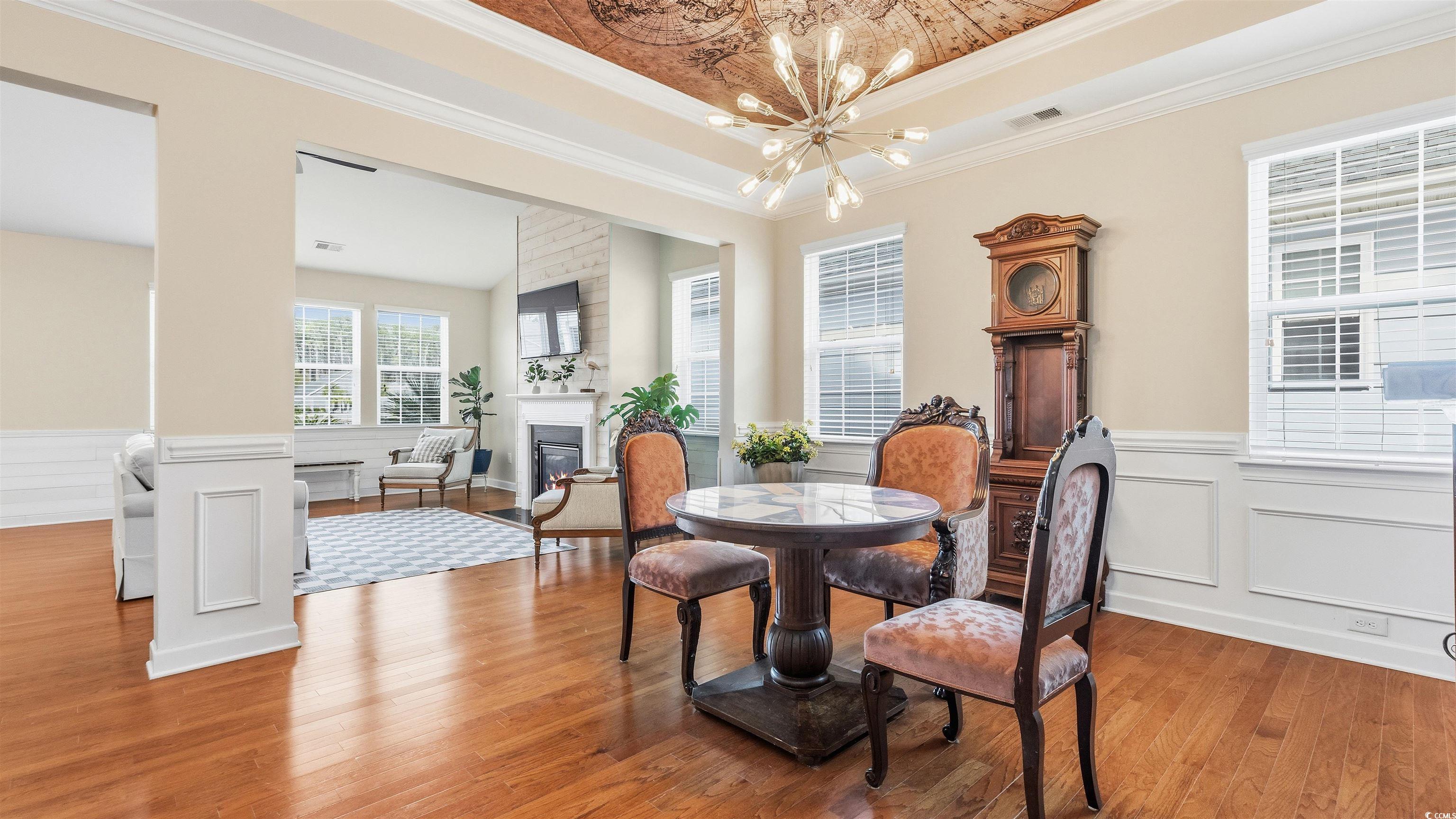 A truly stunning home located in the highly sought-after Monarch section of Emmens Preserve, where thoughtful upgrades, comfort, and waterfront living come together seamlessly. This beautifully maintained 4-bedroom, 3-bath Parris Model offers an open floor plan filled with natural light and immediate wow-factor, highlighted by serene private water views visible from nearly every window in the main living spaces. The heart of the home is the expansive family room and kitchen, featuring cathedral ceilings, a gas fireplace with custom shiplap accents, and walls of windows overlooking the water. The kitchen is thoughtfully appointed with 42" raised-panel maple cabinetry, granite countertops, stainless steel appliances, custom tile backsplash, and brushed nickel lighting and hardware, including a gas GE range and dishwasher. Hardwood flooring extends throughout the foyer, dining room, kitchen, family room, and into the bedrooms and primary closet, creating warmth and continuity throughout. The formal dining room is enhanced with tray ceilings, crown molding, and wainscoting, while updated lighting and smart Lutron Caseta WiFi switches add modern convenience. The primary suite offers a peaceful retreat with a tray ceiling, ceiling fan, private access to the patio, and a well-appointed ensuite bath with double granite vanities, garden tub, separate shower, and oversized walk-in closet. Outdoor living is exceptional, with an enclosed lanai featuring a gas connection, extended patio, fenced backyard, and mature palm-tree landscaping overlooking the private pond. A 240V hot tub line is already in place, creating endless possibilities for a resort-style backyard experience. Behind the scenes, this home shines with major system upgrades, including a replaced HVAC condenser, HVAC duct cleaning (2020 & 2023), re-applied attic insulation, solar attic vent fan, electric panel surge protection, generator interlock, and arc-fault breakers, all providing peace of mind and improved efficiency. The finished two-car garage includes overhead storage racks, a ladder stairway to the attic, and a Carrier Comfort mini-split system, making it ideal for projects, storage, or hobbies. Recent improvements continue with hurricane shutters, refreshed landscaping, updated bathroom flooring throughout, a fully remodeled third bathroom, replaced exhaust fans, all-new LED recessed lighting, and fresh interior and exterior paint in 2025. Residents of Emmens Preserve enjoy a state-of-the-art pool, fitness center, clubhouse, and 29 acres of parks, lakes, and walking trails, including the beloved Emmens Park with outdoor kitchens, fire pits, putting greens, bocce ball courts, horseshoe pits, and more—plus a nearby pooch park. Ideally located just minutes from The Market Common and close to Myrtle Beach State Park, offering over a mile of pristine beaches, this home delivers exceptional lifestyle, location, and luxury!